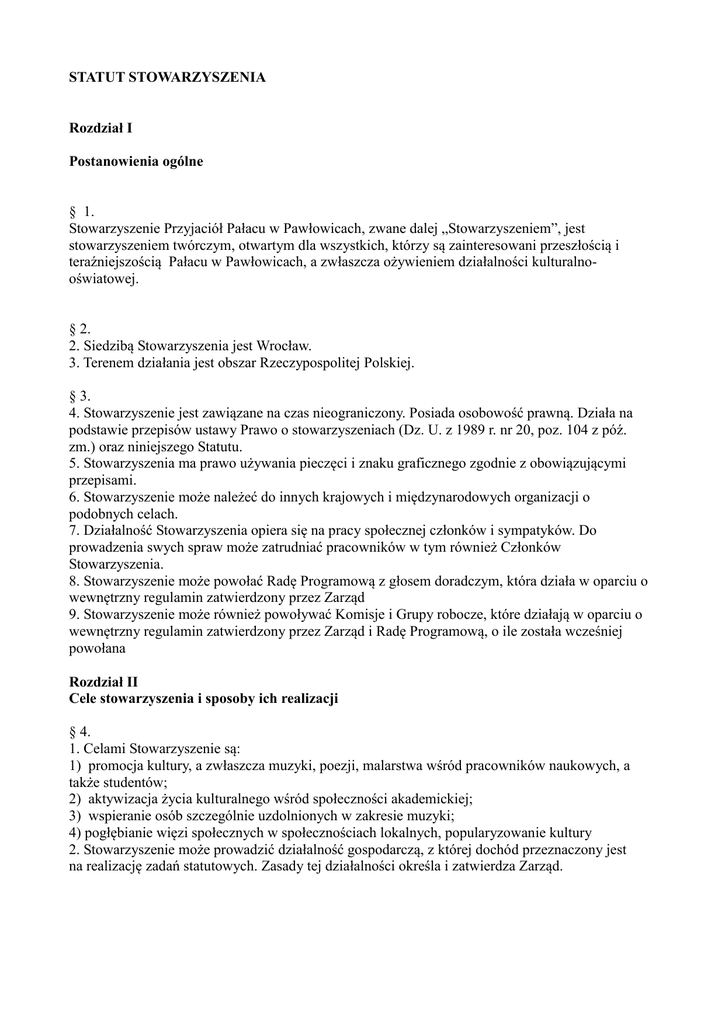 STATUT STOWARZYSZENIA Rozdział I Postanowienia ogólne § 1. Stowarzyszenie Przyjaciół Pałacu w Pawłowicach, zwane dalej „Stowarzyszeniem”, jest stowarzyszeniem twórczym, otwartym dla wszystkich, którzy są zainteresowani przeszłością i teraźniejszością Pałacu w Pawłowicach, a zwłaszcza ożywieniem działalności kulturalnooświatowej. § 2. 2. Siedzibą Stowarzyszenia jest Wrocław. 3. Terenem działania jest obszar Rzeczypospolitej Polskiej. § 3. 4. Stowarzyszenie jest zawiązane na czas nieograniczony. Posiada osobowość prawną. Działa na podstawie przepisów ustawy Prawo o stowarzyszeniach (Dz. U. z 1989 r. nr 20, poz. 104 z póź. zm.) oraz niniejszego Statutu. 5. Stowarzyszenia ma prawo używania pieczęci i znaku graficznego zgodnie z obowiązującymi przepisami. 6. Stowarzyszenie może należeć do innych krajowych i międzynarodowych organizacji o podobnych celach. 7. Działalność Stowarzyszenia opiera się na pracy społecznej członków i sympatyków. Do prowadzenia swych spraw może zatrudniać pracowników w tym również Członków Stowarzyszenia. 8. Stowarzyszenie może powołać Radę Programową z głosem doradczym, która działa w oparciu o wewnętrzny regulamin zatwierdzony przez Zarząd 9. Stowarzyszenie może również powoływać Komisje i Grupy robocze, które działają w oparciu o wewnętrzny regulamin zatwierdzony przez Zarząd i Radę Programową, o ile została wcześniej powołana Rozdział II Cele stowarzyszenia i sposoby ich realizacji § 4. 1. Celami Stowarzyszenie są: 1) promocja kultury, a zwłaszcza muzyki, poezji, malarstwa wśród pracowników naukowych, a także studentów; 2) aktywizacja życia kulturalnego wśród społeczności akademickiej; 3) wspieranie osób szczególnie uzdolnionych w zakresie muzyki; 4) pogłębianie więzi społecznych w społecznościach lokalnych, popularyzowanie kultury 2. Stowarzyszenie może prowadzić działalność gospodarczą, z której dochód przeznaczony jest na realizację zadań statutowych. Zasady tej działalności określa i zatwierdza Zarząd. Rozdział III Metody działania § 5. Stowarzyszenie realizuje swoje cele poprzez: 1) aktywną współpracę z władzami uczelni, władzami samorządowymi i administracją rządową RP w za- kresie promocji kultury, 2) współdziałanie z innymi stowarzyszeniami i związkami twórczymi, szkołami wyższymi; 3) promowanie dorobku twórczego środowiska akademickiego; 4) inicjowanie, organizowanie i wspieranie wszelkich spotkań, konferencji, sympozjów, wystaw oraz aukcji lub innych form działania mających na celu pozyskiwanie funduszy na działalność stowarzyszenia; 5) współdziałanie z osobami, instytucjami i organizacjami o podobnych celach w kraju i zagranicą; Rozdział IV Zasady członkostwa Stowarzyszenia § 6. 19.Przystąpienie do Stowarzyszenia pozostawione jest wyłącznie woli osoby zainteresowanej, akceptującej postanowienia Statutu. 20. Członkowie Stowarzyszenia dzielą się na: a) Członków zwyczajnych. b) Członków wspierających. c) Członków honorowych. 21. Członkiem zwyczajnym może być każda osoba fizyczna, która: a) Ukończyła 18 lat, a także osoby małoletnie w wieku 16 -18 lat, które mają ograniczoną zdolność do czynności prawnych, z tym, że w składzie Zarządu Stowarzyszenia większość muszą stanowić osoby posiadające pełną zdolność do czynności prawnych. b) Popiera cele i założenia Stowarzyszenia, pragnie wnieść wkład pracy społecznej w realizację celów i zadań Stowarzyszenia. 22. Członkiem zwyczajnym zostaje się po złożeniu pisemnej deklaracji na podstawie decyzji Zarządu Stowarzyszenia. § 7. 23. Do obowiązków członka zwyczajnego należy: a) Popieranie i propagowanie celów, dla których zostało powołane Stowarzyszenie. Udział w pracy i życiu Stowarzyszenia. b) Przestrzeganie Statutu i stosowanie się do uchwał Walnego Zebrania członków Stowarzyszenia. c) Regularne opłacanie składek. § 8. 24. Do praw członka zwyczajnego należy: a) Czynne i bierne prawo wyborcze do organów Stowarzyszenia. b) Prawo korzystania z pomocy i urządzeń Stowarzyszenia. 25. Członkiem wspierającym może zostać każda osoba fizyczna lub prawna, która zadeklarowała stałą lub wydatną pomoc w realizacji celów Stowarzyszenia, na podstawie decyzji Zarządu. 26. Członkowie wspierający mają te same prawa i obowiązki co członkowie zwyczajni z wyjątkiem biernego prawa wyborczego do władz Stowarzyszenia. 27. Osobom zasłużonym dla realizacji celów Stowarzyszenia Zarząd może nadać godność członka honorowego. Do członków honorowych stosuje się punkty a), b) ustępu 21. 28. Członkom honorowym przysługuje tylko czynne prawo wyborcze. 29. Członkostwo ustaje na skutek: a) Śmierci. Dobrowolnego wystąpienia, zgłoszonego pisemnie do Zarządu Stowarzyszenia. b) Skreślenia z ewidencji członków z powodu niepłacenia składek za okres pół roku. c) Wykluczenia z powodu naruszenia zasad Statutowych lub nieprzestrzegania uchwał władz Stowarzyszenia. 30. Uchwałę o skreśleniu lub wykluczeniu podejmuje Zarząd. Zainteresowany może złożyć na ręce Zarządu pisemne odwołanie od powyższej uchwały do Walnego Zebrania Członków w terminie 2 miesięcy od skreślenia go przez Zarząd. Do czasu decyzji Walnego Zebrania członkostwo osoby skreślonej lub wykluczonej przez Zarząd ulega zawieszeniu. Rozdział V Władze Stowarzyszenia § 9. 31. Władzami Stowarzyszenia są: a)Walne Zebranie Członków. b)Zarząd. c)Komisja Rewizyjna 32. Stowarzyszenie na zewnątrz reprezentuje Prezes, lub Vice-prezes lub pełnomocnicy upoważnieni do tego przez Prezesa i drugiego członka zarządu działających łącznie w granicach przyznanego im pełnomocnictwa w przepisach obowiązującego prawa. § 10. 33. Walne Zebranie Członków jest najwyższą władzą Stowarzyszenia. Walne Zebranie Członków może być zwyczajne lub nadzwyczajne. 34. Walne Zebranie Członków zwyczajne zwo