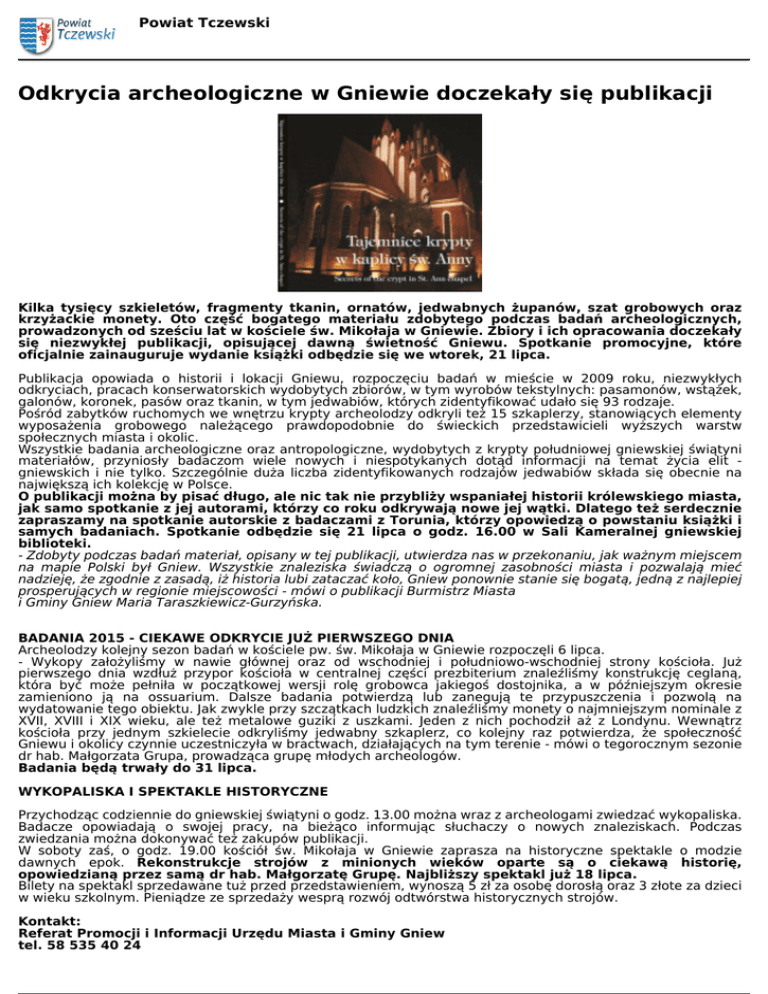 Powiat Tczewski Odkrycia archeologiczne w Gniewie doczekały się publikacji Kilka tysięcy szkieletów, fragmenty tkanin, ornatów, jedwabnych żupanów, szat grobowych oraz krzyżackie monety. Oto część bogatego materiału zdobytego podczas badań archeologicznych, prowadzonych od sześciu lat w kościele św. Mikołaja w Gniewie. Zbiory i ich opracowania doczekały się niezwykłej publikacji, opisującej dawną świetność Gniewu. Spotkanie promocyjne, które oficjalnie zainauguruje wydanie książki odbędzie się we wtorek, 21 lipca. Publikacja opowiada o historii i lokacji Gniewu, rozpoczęciu badań w mieście w 2009 roku, niezwykłych odkryciach, pracach konserwatorskich wydobytych zbiorów, w tym wyrobów tekstylnych: pasamonów, wstążek, galonów, koronek, pasów oraz tkanin, w tym jedwabiów, których zidentyfikować udało się 93 rodzaje. Pośród zabytków ruchomych we wnętrzu krypty archeolodzy odkryli też 15 szkaplerzy, stanowiących elementy wyposażenia grobowego należącego prawdopodobnie do świeckich przedstawicieli wyższych warstw społecznych miasta i okolic. Wszystkie badania archeologiczne oraz antropologiczne, wydobytych z krypty południowej gniewskiej świątyni materiałów, przyniosły badaczom wiele nowych i niespotykanych dotąd informacji na temat życia elit gniewskich i nie tylko. Szczególnie duża liczba zidentyfikowanych rodzajów jedwabiów składa się obecnie na największą ich kolekcję w Polsce. O publikacji można by pisać długo, ale nic tak nie przybliży wspaniałej historii królewskiego miasta, jak samo spotkanie z jej autorami, którzy co roku odkrywają nowe jej wątki. Dlatego też serdecznie zapraszamy na spotkanie autorskie z badaczami z Torunia, którzy opowiedzą o powstaniu książki i samych badaniach. Spotkanie odbędzie się 21 lipca o godz. 16.00 w Sali Kameralnej gniewskiej biblioteki. - Zdobyty podczas badań materiał, opisany w tej publikacji, utwierdza nas w przekonaniu, jak ważnym miejscem na mapie Polski był Gniew. Wszystkie znaleziska świadczą o ogromnej zasobności miasta i pozwalają mieć nadzieję, że zgodnie z zasadą, iż historia lubi zataczać koło, Gniew ponownie stanie się bogatą, jedną z najlepiej prosperujących w regionie miejscowości - mówi o publikacji Burmistrz Miasta i Gminy Gniew Maria Taraszkiewicz-Gurzyńska. BADANIA 2015 - CIEKAWE ODKRYCIE JUŻ PIERWSZEGO DNIA Archeolodzy kolejny sezon badań w kościele pw. św. Mikołaja w Gniewie rozpoczęli 6 lipca. - Wykopy założyliśmy w nawie głównej oraz od wschodniej i południowo-wschodniej strony kościoła. Już pierwszego dnia wzdłuż przypor kościoła w centralnej części prezbiterium znaleźliśmy konstrukcję ceglaną, która być może pełniła w początkowej wersji rolę grobowca jakiegoś dostojnika, a w późniejszym okresie zamieniono ją na ossuarium. Dalsze badania potwierdzą lub zanegują te przypuszczenia i pozwolą na wydatowanie tego obiektu. Jak zwykle przy szczątkach ludzkich znaleźliśmy monety o najmniejszym nominale z XVII, XVIII i XIX wieku, ale też metalowe guziki z uszkami. Jeden z nich pochodził aż z Londynu. Wewnątrz kościoła przy jednym szkielecie odkryliśmy jedwabny szkaplerz, co kolejny raz potwierdza, że społeczność Gniewu i okolicy czynnie uczestniczyła w bractwach, działających na tym terenie - mówi o tegorocznym sezonie dr hab. Małgorzata Grupa, prowadząca grupę młodych archeologów. Badania będą trwały do 31 lipca. WYKOPALISKA I SPEKTAKLE HISTORYCZNE Przychodząc codziennie do gniewskiej świątyni o godz. 13.00 można wraz z archeologami zwiedzać wykopaliska. Badacze opowiadają o swojej pracy, na bieżąco informując słuchaczy o nowych znaleziskach. Podczas zwiedzania można dokonywać też zakupów publikacji. W soboty zaś, o godz. 19.00 kościół św. Mikołaja w Gniewie zaprasza na historyczne spektakle o modzie dawnych epok. Rekonstrukcje strojów z minionych wieków oparte są o ciekawą historię, opowiedzianą przez samą dr hab. Małgorzatę Grupę. Najbliższy spektakl już 18 lipca. Bilety na spektakl sprzedawane tuż przed przedstawieniem, wynoszą 5 zł za osobę dorosłą oraz 3 złote za dzieci w wieku szkolnym. Pieniądze ze sprzedaży wesprą rozwój odtwórstwa historycznych strojów. Kontakt: Referat Promocji i Informacji Urzędu Miasta i Gminy Gniew tel. 58 535 40 24 Powiat Tczewski Załączniki Zaproszenie na promocję książki.jpg [zaproszenie na promocję książki ] Powered by TCPDF (www.tcpdf.org)