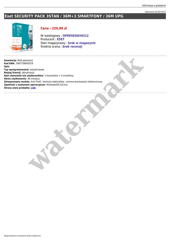 Informacje o produkcie Utworzono 02-03-2017 Eset SECURITY PACK 3STAN / 36M+3 SMARTFONY / 36M UPG Cena : 220,99 zł Nr katalogowy : OPRESEOAV0312 Producent : ESET Stan magazynowy : brak w magazynie Średnia ocena : brak recenzji w at er m ar k Gwarancja: Brak gwarancji Kod EAN:: 5907758063019 Opis: Typ oprogramowania: antywirusowe Rodzaj licencji: aktualizacja Ilość stanowisk lub użytkowników: 3 stanowiska + 3 smartfony Okres użytkowania: 36 miesięcy Zintegrowane moduły: Anti-Theft , kontrola rodzicielska , ochrona bankowości elektronicznej Zgodność z systemem operacyjnym: Windows/OS X/Linux Strona www produktu: Link Wygenerowano w programie www.oscGold.com