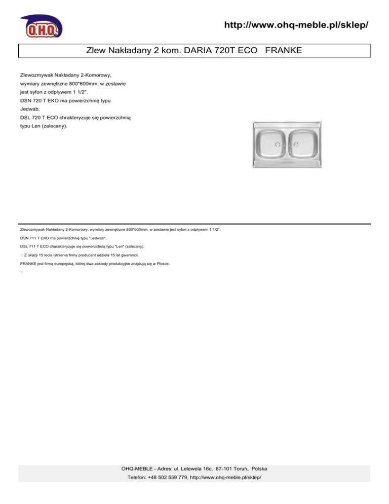 http://www.ohq-meble.pl/sklep/ Zlew Nakładany 2 kom. DARIA 720T ECO FRANKE Zlewozmywak Nakładany 2-Komorowy, wymiary zewnętrzne 800*600mm, w zestawie jest syfon z odpływem 1 1/2". DSN 720 T EKO ma powierzchnię typu Jedwab; DSL 720 T ECO chrakteryzuje się powierzchnią typu Len (zalecany). Zlewozmywak Nakładany 2-Komorowy, wymiary zewnętrzne 800*600mm, w zestawie jest syfon z odpływem 1 1/2". DSN 711 T EKO ma powierzchnię typu "Jedwab"; DSL 711 T ECO charakteryzuje się powierzchnią typu "Len" (zalecany). Z okazji 15 lecia istnienia firmy producent udziela 15 lat gwarancii. FRANKE jest firmą europejską, której dwa zakłady produkcyjne znajdują się w Plosce. OHQ-MEBLE - Adres: ul. Lelewela 16c, 87-101 Toruń, Polska Telefon: +48 502 559 779, http://www.ohq-meble.pl/sklep/