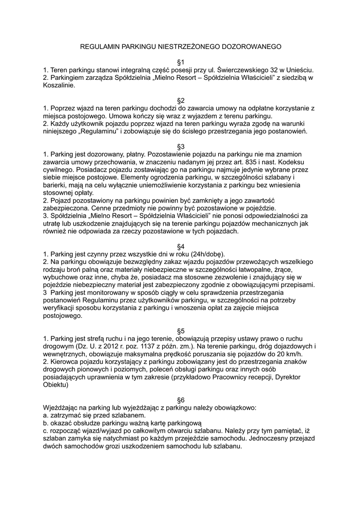 REGULAMIN PARKINGU NIESTRZEŻONEGO DOZOROWANEGO §1 1. Teren parkingu stanowi integralną część posesji przy ul. Świerczewskiego 32 w Unieściu. 2. Parkingiem zarządza Spółdzielnia „Mielno Resort – Spółdzielnia Właścicieli” z siedzibą w Koszalinie. §2 1. Poprzez wjazd na teren parkingu dochodzi do zawarcia umowy na odpłatne korzystanie z miejsca postojowego. Umowa kończy się wraz z wyjazdem z terenu parkingu. 2. Każdy użytkownik pojazdu poprzez wjazd na teren parkingu wyraża zgodę na warunki niniejszego „Regulaminu” i zobowiązuje się do ścisłego przestrzegania jego postanowień. §3 1. Parking jest dozorowany, płatny. Pozostawienie pojazdu na parkingu nie ma znamion zawarcia umowy przechowania, w znaczeniu nadanym jej przez art. 835 i nast. Kodeksu cywilnego. Posiadacz pojazdu zostawiając go na parkingu najmuje jedynie wybrane przez siebie miejsce postojowe. Elementy ogrodzenia parkingu, w szczególności szlabany i barierki, mają na celu wyłącznie uniemożliwienie korzystania z parkingu bez wniesienia stosownej opłaty. 2. Pojazd pozostawiony na parkingu powinien być zamknięty a jego zawartość zabezpieczona. Cenne przedmioty nie powinny być pozostawione w pojeździe. 3. Spółdzielnia „Mielno Resort – Spółdzielnia Właścicieli” nie ponosi odpowiedzialności za utratę lub uszkodzenie znajdujących się na terenie parkingu pojazdów mechanicznych jak również nie odpowiada za rzeczy pozostawione w tych pojazdach. §4 1. Parking jest czynny przez wszystkie dni w roku (24h/dobę). 2. Na parkingu obowiązuje bezwzględny zakaz wjazdu pojazdów przewożących wszelkiego rodzaju broń palną oraz materiały niebezpieczne w szczególności łatwopalne, żrące, wybuchowe oraz inne, chyba że, posiadacz ma stosowne zezwolenie i znajdujący się w pojeździe niebezpieczny materiał jest zabezpieczony zgodnie z obowiązującymi przepisami. 3 Parking jest monitorowany w sposób ciągły w celu sprawdzenia przestrzegania postanowień Regulaminu przez użytkowników parkingu, w szczególności na potrzeby weryfikacji sposobu korzystania z parkingu i wnoszenia opłat za zajęcie miejsca postojowego. §5 1. Parking jest strefą ruchu i na jego terenie, obowiązują przepisy ustawy prawo o ruchu drogowym (Dz. U. z 2012 r. poz. 1137 z późn. zm.). Na terenie parkingu, dróg dojazdowych i wewnętrznych, obowiązuje maksymalna prędkość poruszania się pojazdów do 20 km/h. 2. Kierowca pojazdu korzystający z parkingu zobowiązany jest do przestrzegania znaków drogowych pionowych i poziomych, poleceń obsługi parkingu oraz innych osób posiadających uprawnienia w tym zakresie (przykładowo Pracownicy recepcji, Dyrektor Obiektu) §6 Wjeżdżając na parking lub wyjeżdżając z parkingu należy obowiązkowo: a. zatrzymać się przed szlabanem. b. okazać obsłudze parkingu ważną kartę parkingową c. rozpocząć wjazd/wyjazd po całkowitym otwarciu szlabanu. Należy przy tym pamiętać, iż szlaban zamyka się natychmiast po każdym przejeździe samochodu. Jednoczesny przejazd dwóch samochodów grozi uszkodzeniem samochodu lub szlabanu. §7 1. W przypadku przyjazdu osób, które po raz pierwszy w czasie pobytu wjeżdżają na parking (np. rozpoczęcie pobytu w „Blue Marine”) powinny zatrzymać się przed szlabanem i poinformować obsługę o chęci skorzystania z miejsca postojowego. Obsługa po sprawdzeniu dostępnych miejsc postojowych wydaje „tymczasową kartę parkingową”. Tymczasową kartę parkingową użytkownik jest zobowiązany pozostawić w pojeździe w widocznym miejscu (na podszybiu z przodu pojazdu) w sposób umożliwiający pracownikom zarządzającego odczytać informacje w jakim okresie pojazd ma prawo do korzystania z parkingu. 2. W przypadku braku dostępnych miejsc postojowych obsługa ma prawo odmówić wjazdu pojazdu na teren parkingu bez obowiązku wskazania alternatywnego miejsca postoju. 3. Posiadacz pojazdu, który wjechał na parking na podstawie „Tymczasowej karty parkingowej” jest zobowiązany w ciągu 2 godzin od chwili wydania karty do: a. uregulowania w recepcji „Blue Marine” (parter budynku A) opłaty za korzystanie z miejsca postojowego – na dowód uiszczenia opłaty otrzyma „kartę parkingową”. Kartę parkingową użytkownik jest zobowiązany pozostawić w pojeździe w widocznym miejscu (na podszybiu z przodu pojazdu) w sposób umożliwiający pracownikom zarządzającego odczytać informacje w jakim okresie pojazd ma prawo do korzystania z parkingu. lub b. opuszczenia terenu parkingu i zwrot tymczasowej karty parkingowej obsłudze parkingu. 4. Pojazdy, które nie mają ważnej karty parkingowej lub tymczasowej karty parkingowej mogą zostać usunięte z terenu parkingu i odholowane na teren parkingu miejskiego w Koszalinie. Kosztami usługi holowania oraz postoju pojazdu na terenie parkingu miejskiego obciążony będzie użytkownik pojazdu. 5. Karty Parkingowe lub Tymczasowe Karty Parkingowe, które użytkownik pozostawił w pojeździe w sposób uniemożliwiający ich odczytanie przez obsługę parkingu traktowane będą jak karty po terminie ich ważności, a co za tym idzie użytkownicy takich pojazdów muszą się liczyć z konsekwencjami wymienionymi w §7 pkt 4. §8 1. Wysokość opłaty postojowej dla samochodów osobowych określa się na kwotę 10 zł (dziesięć złotych) z każdą rozpoczętą dobę postoju. W przypadku samochodów innych niż osobowe opłata postojowa wynosi 30 zł (trzydzieści złotych) z każdą rozpoczętą dobę postoju. Powyższe ceny są cenami brutto zawierającymi obowiązującą podatek VAT w wysokości 23%. 2. Faktury VAT za usługę parkingową zostają wystawione na życzenie klienta bezpośrednio w recepcji w ostatnim dniu pobytu gości lub na podstawie przesłanego oryginału paragonu. 3. Za zagubienie karty parkingowej pobierana jest dodatkowa opłata w kwocie 25 zł (dwadzieścia pięć złotych) brutto. 4. Doba postojowa zaczyna się o godz