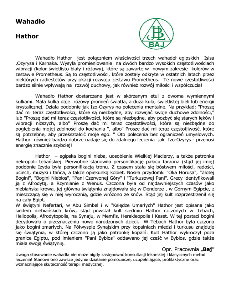 Wahadło Hathor Wahadło Hathor jest połączniem właściwości trzech wahadeł egipskich Isisa ,Ozyrysa i Karnaka. Wysyła promieniowanie na dwóch bardzo wysokich częstotliwościach wibracji (kolor świetlisto biały i różowy), które są zawarte w nowym zakresie kolorów w zestawie Prometheus. Są to częstotliwości, które zostały odkryte w ostatnich latach przez niektórych radiestetów przy okazji rozwoju zestawu Prometheus. Te nowe częstotliwości bardzo silnie wpływają na rozwój duchowy, jak również rozwój miłości i współczucia! Wahadło Hathor dostarczane jest w skórzanym etui z dwoma wymiennymi kulkami. Mała kulka daje różowy promień światła, a duża kula, świetlistej bieli lub energii krystalicznej. Działa podobnie jak Izo-Ozyrys na polecenia mentalne. Na przykład: "Proszę dać mi teraz częstotliwości, które są niezbędne, aby rozwijać swoje duchowe zdolności," lub "Proszę dać mi teraz częstotliwości, które są niezbędne, aby pozbyć się starych lęków i wibracji niższych, albo" Proszę dać mi teraz częstotliwości, które są niezbędne do pogłębienia mojej zdolności do kochania ", albo" Proszę dać mi teraz częstotliwość, które są potrzebne, aby przekształcić moje ego. " Oto polecenia bez ograniczeń umysłowych. Hathor również bardzo dobrze nadaje się do zdalnego leczenia jak Izo-Ozyrys - przenosi energię znacznie szybciej! Hathor – egipska bogini nieba, uosobienie Wielkiej Macierzy, a także patronka nekropolii tebańskiej. Pierwotnie stanowiła personifikację pałacu faraona (stąd jej imię) podobnie Izyda była personifikacją tronu. Z czasem stała się bóstwem miłości, radości, uciech, muzyki i tańca, a także opiekunką kobiet. Nosiła przydomki "Oka Horusa", "Złotej Bogini", "Bogini Niebios", "Pani Czerwonej Góry" i "Turkusowej Pani". Grecy identyfikowali ją z Afrodytą, a Rzymianie z Wenus. Czczona była od najdawniejszych czasów jako niebiańska krowa, jej główna świątynia znajdowała się w Denderze , w Górnym Egipcie, z mieszczącą się w niej wyrocznią, gdzie wróżono ze snów. Stąd jej kult rozprzestrzenił się na cały Egipt. W świątyni Nefertari, w Abu Simbel i w "Księdze Umarłych" Hathor jest opisana jako siedem niebiańskich krów, stąd powstał kult siedmiu Hathor czczonych w Tebach, Heliopolis, Afrodytopolis, na Synaju, w Memfis, Herakleopolis i Keset. W tej postaci bogini decydowała o przeznaczeniu nowo narodzonych dzieci. W Tebach Hathor była czczona jako bogini zmarłych. Na Półwyspie Synajskim przy kopalniach miedzi i turkusu znajduje się świątynia, w której czczono ją jako patronkę kopalń. Kult Hathor wykroczył poza granice Egiptu, pod imieniem "Pani Byblos" oddawano jej cześć w Byblos, gdzie także miała swoją świątynię. Opr. Pracownia „Baj” Uwaga stosowanie wahadła nie może nigdy zastępować konsultacji lekarskiej i klasycznych metod leczenia! Stanowi ono zawsze jedynie działanie pomocnicze, uzupełniające, profilaktyczne oraz wzmacniające skuteczność terapii medycznej.
