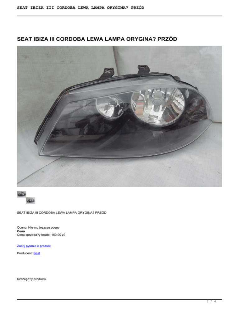 SEAT IBIZA III CORDOBA LEWA LAMPA ORYGINA? PRZÓD SEAT IBIZA III CORDOBA LEWA LAMPA ORYGINA? PRZÓD SEAT IBIZA III CORDOBA LEWA LAMPA ORYGINA? PRZÓD Ocena: Nie ma jeszcze oceny Cena Cena sprzeda?y brutto: 150,00 z? Zadaj pytanie o produkt Producent: Seat Szczegó?y produktu 1 / 4 SEAT IBIZA III CORDOBA LEWA LAMPA ORYGINA? PRZÓD O NAS Od wielu lat zajmujemy si? skupem i sprzeda?? lamp samochodowych. W swoim komisie posiadamy bogaty asortyment zarówno lamp u?ywanych pochodz?cych z demonta?u, jak i nowych cz??ci. Kupuj?c u nas masz pewno?? i gwarancj? rozruchow? towaru (14 dni od momentu odbioru). Istnieje mo?liwo?? zamówienia cz??ci, gdy? 2 razy w tygodniu realizowana jest nowa dostawa towaru. WYSY?KA Towar wysy?amy w tym samym dniu je?eli zamówienie zostanie z?o?one do godz.13:00 kurierem DPD. Po godz. 13:00 przesy?ka zostanie wys?ana w nast?pnym dniu roboczym. Istnieje mo?liwo?? wysy?ki paczek (forma p?atno?ci): - za pobraniem - przedp?ata na konto Przesy?ka dociera na nast?pny dzie? roboczy. Paczki nadawane s? tylko w dni powszednie. Istnieje mo?liwo?? osobistego odbioru reflektorów po wcze?niejszej konsultacji a tak?e przesy?ka za granic?. Ceny wysy?ki zawieraj? równie? koszty pakowania zamówionego towaru. Maj? Pa?stwo prawo zwrotu zakupionego towaru w ci?gu 14 dni (ustawowo) wraz z dowodem zakupu i formularzem odst?pienia od umowy zawartym na naszej stronie : http://lampy-samochodowe.pl/media/files/Formularz_Odstapienia_OU.pdf bez podania przyczyny, zwrócimy pieni?dze- nie zwracamy jedynie kosztów wysy?ki. Nie odbieramy przesy?ek za pobraniem. Wszelkie reklamacje prosimy kierowa? pisemnie na [email protected]. ZAKUP PRZEDMIOTU SEAT IBIZA III CORDOBA LEWA LAMPA ORYGINA? PRZÓD 1. Wybierz produkt i dodaj go do koszyka. 2. Wybierz sposób zap?aty/ odbioru, uzupe?nij dane do wysy?ki 3. Ewentualne sugestie prosz? wpisa? w polu wiadomo??/ dane do faktury 4. Oczekuj na kuriera- sprawd? zawarto?? przesy?ki przy odbiorze (wszystkie paczki s? ubezpieczone) . STAN MAGA MODEL/ STRON OPIS ZYNO MARKA A CZ??CI WY CENA SEAT LEWA PRZÓD, 2B-3 150,00 PLN IBIZA III ORYGIN CORDO A?, UCH BA WYTY CA?E, LAMPA NA 2 ?A RÓWKI 2 / 4 SEAT IBIZA III CORDOBA LEWA LAMPA ORYGINA? PRZÓD PARAGON/FAKTURA Do ka?dej zakupionej cz??ci do??czamy paragon . Je?li ?ycz? Pa?stwo sobie faktur?, prosimy o informacj? wraz z danymi niezb?dnymi do jej wystawienia. KONTAKT: Wszelkie zapytania prosimy kierowa? na e-mail: [email protected] Z uwagi na usprawnienie jako?ci obs?ugi i zadowolenie naszych klientów, na ka?d? wiadomo?? odpowiadamy w ci?gu 24 h. Ka?dy przedmiot jest dok?adnie opisany i skatalogowany. Je?li masz dodatkowe pytania prosimy o kontakt z naszym ekspertem pod nr tel.: Tel. 798-986-497 GODZINY OTWARCIA: Pracujemy od poniedzia?ku do soboty w godz. 8:00- 18:00 z wy??czeniem dni ustawowo wolnych od pracy. STRONA WWW: www.lampy-samochodowe.pl ZAMIENNIKI: Nie kupuj zamienników na innych aukcjach. S? to cz??ci o krótkiej ?ywotno?ci i s?abej jako?ci wykonania. Pos?u?? na zdecydowanie krótszy czas ni? cz??ci oryginalne, mimo, ?e s? nowe. Zakup na naszych aukcjach jest jednoznaczny z akceptacj? regulaminu dost?pnego na naszej stronie. 3 / 4 SEAT IBIZA III CORDOBA LEWA LAMPA ORYGINA? PRZÓD ZAPRASZAMY I DZI?KUJEMY ZA ZAINTERESOWANIE Mercedes - naprawa i przeróbka lamp LED tel: 513-531-967 / tel: 795-785-666 naprawa lamp LED - w przypadku uszkodzenia lamp LED w samochodach osobowych - producent nie przewidzia? ingerencji w lamp? , czy wymiany uszkodzonych elementów lub przepalanego LED - ASO oferuja wymian? lamp na nowe - jednak cena nowych lamp nadal powala na kolana - oferujemy napraw? i przeróbk lamp LED - przerabiamy równie? lampy z wersji USA www.motolampy.com ?#?naprawa_lamp? ?#?lampy_samochodowe? ?#?lampy_led? ?#?naprawa_led??#?przeróbka_usa? ?#?lampy_usa? Wi?kszo?? wspó?czesnych samochodów osobowych wyposa?onych jest w lampy zbudowane w oparciu o LED. Takie lampy nie posiadaj? zwyk?ych ?arówek . Minusem tego rozwi?zania jest brak mo?liwo?ci w?asnor?cznej szybkiej wymiany uszkodzonego czy przepalonego elementu. Autoryzowane serwisy nie widza innego wyj?cia jak wymian? lampy na now? , jednak cena nowych lamp powala na kolana. Nasza firma oferuje napraw? lamp LED. Naprawiamy lampy we wszystkich modelach Mercedes , Audi , BMW - inne po uzgodnieniu Przerabiamy równie? lampy z wersji USA na europ? Nie musisz wymienia? lamp na nowe - ka?d? naprawimy naprawa lamp regeneracja lamp lampy samochodowe autolampy lampy led, przeróbka lamp naprawa lamp led polerowanie reflektorów przeróbka lamp usa, lampy mercedes , naprawa reflektorów polerowanie lamp lampy ty? reflektor audi tanie lampy lampy u?ywane tuning lamp powrót Czytaj równie?: BMW e39 - opis , porady i ciekawostki Mercedes GL przeróbka lamp z USA Regeneracja reflektorów - Skoda Roomster Dlaczego regenerowa? lampy ? 4 / 4 Powered by TCPDF (www.tcpdf.org)