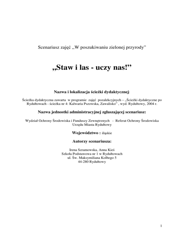 Scenariusz zajęć ,,W poszukiwaniu zielonej przyrody” ,,Staw i las - uczy nas!” Nazwa i lokalizacja ścieżki dydaktycznej: Ścieżka dydaktyczna zawarta w programie zajęć pozalekcyjnych – „Ścieżki dydaktyczne po Rydułtowach - ścieżka nr 4: Kalwaria Pszowska, Zawalisko” , wyd. Rydułtowy, 2004 r. Nazwa jednostki administracyjnej zgłaszającej scenariusz: Wydział Ochrony Środowiska i Funduszy Zewnętrznych - Referat Ochrony Środowiska Urzędu Miasta Rydułtowy Województwo : śląskie Autorzy scenariusza: Irena Szramowska, Anna Kieś Szkoła Podstawowa nr 1 w Rydułtowach ul. Św. Maksymiliana Kolbego 5 44-280 Rydułtowy 1 Temat: Staw i las - uczy nas ! Zajęcia terenowe dla koła przyrodniczego kl. V i VI. CELE OGÓLNE. 1. Rozbudzanie zainteresowania własną miejscowością, jej historią i aktualnymi problemami. 2. Zdobycie umiejętności obserwowania zjawisk przyrodniczych i społecznych oraz dokonywania ich opisu. 3. Wielozmysłowe poznawanie przyrody i wyrabianie emocjonalnego stosunku do organizmów żywych . 4. Rozumienie przebiegu podstawowych zjawisk przyrodniczych i ich rozpoznawanie we własnym środowisku. CELE SZCZEGÓŁOWE. Wiadomości. Uczeń: • zna ciekawe fakty z historii miasta • rozpoznaje pospolite rośliny i zwierzęta w najbliższym otoczeniu • zna zasady obserwacji terenowych • zna przeznaczenie przyrządów pomiarowych Umiejętności. Uczeń: • posługuje się kompasem, mapą, planem miasta, taśmą mierniczą , kluczem do rozpoznawania roślin i zwierząt • wykonuje proste obliczenia i pomiary przyrodnicze • rozpoznaje główne składniki krajobrazu naturalnego i przekształconego przez człowieka • obserwuje zjawiska przyrodnicze i wyciąga poprawne wnioski o ich przebiegu • wykorzystuje wiedzę w praktyce Postawy. Uczeń: • dostrzega wpływ człowieka na środowisko przyrodnicze • przestrzega zasad bezpieczeństwa • dostrzega przyrodnicze i kulturowe walory własnej miejscowości FORMY. • praca indywidualna • praca w małych grupach • praca zbiorowa z całą grupą METODY I TECHNIKI Pogadanka. Metody praktyczne: pomiar, praca z mapą, kompasem, zajęcia warsztatowe na podstawie kart pracy. ŚRODKI DYDAKTYCZNE kompasy, plany Rydułtów w skali 1 : 10 000, termometry, podbieraki z gęstą siatką, słoiki, białe pudełko plastikowe np. po lodach, termometr, stetoskop, lupa, „Przewodnik do rozpoznawania roślin i zwierząt na wycieczce”, przybory do pisania, kredki, sztywna podkładka, gumowe rękawiczki, woreczek na liście , taśmy miernicze , taśma klejąca, skala porostowa, klucze do rozpoznawania drzew, roślin i zwierząt wodnych, karty pracy. CZAS: ok. 5 godz. 2 PRZEBIEG ZAJĘĆ. 1. Pogadanka wstępna Omówienie celów, planu zajęć i zasad bezpieczeństwa w czasie przejścia ulicami miasta i w terenie. 2. Dojście do pobliskiego lasu na Kalwarii Pszowskiej. • Ogólna obserwacja terenu (formy ukształtowania terenu, gatunki roślin i zwierząt, elementy krajobrazu świadczące o działalności człowieka) • Obserwacja pogody (zachmurzenie, temperatura powietrza, kierunek i siła wiatru) 3. Zajęcia w lesie • Rozdanie uczniom kart pracy • Wykonywanie zadań wg kart pracy Wykonywane zadania: • Oznaczanie gatunków drzew wg przygotowanych kluczy • Przyporządkowanie gatunków do odpowiednich warstw lasu • Przeprowadzanie pomiarów dendrologicznych: a. Pomiar wysokości drzew 2 sposobami b. Szukanie drzew pomnikowych Wybieramy drzewo o najgrubszym pniu na wysokości piersi dorosłego człowieka i mierzymy w tym miejscu jego obwód. Sprawdzamy pierśnicę w odpowiedniej tabelce. c. Pomiar wieku drzewa na podstawie obwodu pnia. • Pomiar czystości powietrza. Przykładamy taśmę klejącą do liścia drzewa, delikatnie ją dociskamy a następnie odklejamy i umieszczamy w odpowiednim miejscu na karcie pracy. Prowadzimy wśród uczniów burzę mózgów: Jakie to będzie miało znaczenie dla roślin? • Rozpoznaj swoje drzewo Dzielimy uczniów na pary. Jedno z dzieci wybiera sobie ,,swoje drzewo”. Dokładnie ogląda jego korę ( jej grubość spękania, fakturę powierzchni, zapach), a potem zawiązuje oczy chustką. Drugi uczeń prowadzi go krętą drogą do jakiegoś drzewa. Zadanie polega na odgadnięciu, czy drzewo, przed którym stoi, to jest jego drzewo. • Życie drzewa Uczniowie przykładają stetoskop do gładkiej kory drzewa, np. brzozy, buka i słuchają dźwięków świadczących o życiu drzewa. • Drama: ,, Narodziny drzewa” Uczniowie przedstawiają gestami, ruchami i dźwiękami historię powstania drzewa wg opowiadanej historii np. ,,Wyobraź sobie, że jesteś malutkim nasionkiem, które leży przykryte ziemią (dzieci przykucają). Nie możesz się poruszać, jest ciemno i niewygodnie. Czasem dociera do ciebie promyczek słońca i jest ci ciepło, czasami pada śnieg - czujesz nieprzyjemny chłód. Pijesz maleńkie kropelki wody i pęczniejesz. Stajesz się coraz większe, i większe… Łuska, która okrywa ciebie jak nieprzemakalna kołderka staje się coraz bardziej ciasna. Pewnego dnia, kiedy właśnie czułeś przyjemne ciepło, postanowiłeś się uwolni od krępującej twój rozwój łuski. Wytężasz całą swoją siłę i wolę, napinasz swoje ciało…i wydostajesz się na wolność. Jesteś teraz małym zielonym kiełkiem, który szybko pnie się do góry, przebija powierzchnię ziemi i wreszcie widzi słońce (dzieci podnoszą do góry, chociaż jeden palec i trochę się podnoszą). Ogrzewają cię promienie słońca…stale rośniesz i rośniesz…( dzieci powoli wstają). Jesteś drzewkiem bardzo młodym i 3 jeszcze słabym. Wiatr kołysze cię na wszystkie strony( dzieci poruszają się na wszystkie strony). Czujesz się jeszcze niepewnie, ale z czasem nabierasz sił, stajesz się wielki, potężny i mocny, gdyż twoje korzenie mocno wrastają w ziemię (dzieci dociskają stopy do ziemi i wyciągają ramiona). Po latach tak silny, że możesz pomagać s