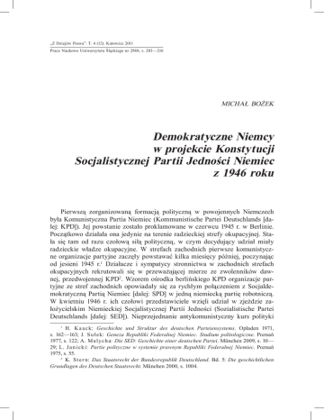 „Z Dziejów Prawa”. T. 4 (12). Katowice 2011 Prace Naukowe Uniwersytetu Śląskiego nr 2868, s. 203—216 MICHAŁ BOŻEK Demokratyczne Niemcy w projekcie Konstytucji Socjalistycznej Partii Jedności Niemiec z 1946 roku Pierwszą zorganizowaną formacją polityczną w powojennych Niemczech była Komunistyczna Partia Niemiec (Kommunistische Partei Deutschlands [dalej: KPD]). Jej powstanie zostało proklamowane w czerwcu 1945 r. w Berlinie. Początkowo działała ona jedynie na terenie radzieckiej strefy okupacyjnej. Stała się tam od razu czołową siłą polityczną, w czym decydujący udział miały radzieckie władze okupacyjne. W strefach zachodnich pierwsze komunistyczne organizacje partyjne zaczęły powstawać kilka miesięcy później, poczynając od jesieni 1945 r. Działacze i sympatycy stronnictwa w zachodnich strefach okupacyjnych rekrutowali się w przeważającej mierze ze zwolenników dawnej, przedwojennej KPD. Wzorem ośrodka berlińskiego KPD organizacje partyjne ze stref zachodnich opowiadały się za rychłym połączeniem z Socjaldemokratyczną Partią Niemiec [dalej: SPD] w jedną niemiecką partię robotniczą. W kwietniu 1946 r. ich czołowi przedstawiciele wzięli udział w zjeździe założycielskim Niemieckiej Socjalistycznej Partii Jedności (Sozialistische Partei Deutschlands [dalej: SED]). Nieprzejednanie antykomunistyczny kurs polityki H. K a a c k: Geschichte und Struktur des deutschen Parteiensystems. Opladen 1971, s. 162—163; J. Su ł e k: Geneza Republiki Federalnej Niemiec. Studium politologiczne. Poznań 1977, s. 122; A. M a lyc h a: Die SED: Geschichte einer deutschen Partei. München 2009, s. 10— 29; L. Ja n ick i: Partie polityczne w systemie prawnym Republiki Federalnej Niemiec. Poznań 1975, s. 55. K. St e r n: Das Staatsrecht der Bundesrepublik Deutschland. Bd. 5: Die geschichtlichen Grundlagen des Deutschen Staatsrecht. München 2000, s. 1004. 204 Michał Bożek socjaldemokratów z zachodnich stref okupacyjnych i stanowczy sprzeciw tamtejszych władz okupacyjnych spowodowały, że podjęta przez działaczy KPD ze stref zachodnich próba utworzenia jednolitego stronnictwa robotniczego na obszarze tych stref w postaci zawiązywania komitetów założycielskich SED spaliła na panewce. Już w swym pierwszym dokumencie programowym, znanym jako Apel Komunistycznej Partii Niemiec do narodu niemieckiego z 11 czerwca 1945 r., za jeden z warunków odbudowy państwa i narodu niemieckiego przywódcy KPD uznali stworzenie nowego ustroju państwowego, opartego na demokratyczno-antyfaszystowskich podstawach i postępowych reformach społecznych. Ustrój taki powinien przybrać formę republiki parlamentarnej, w której szanowane byłyby wszystkie demokratyczne prawa i wolności narodu. Choć kilka zdań wcześniej autorzy deklaracji uznawali przejęcie radzieckich wzorców ustrojowych za krok w złym kierunku, to ówczesne wypowiedzi czołowych polityków stronnictwa nie pozostawiały złudzeń co do pożądanego przez nich kierunku rozwoju niemieckiego życia społeczno-politycznego. Z wypowiedzi tych, a także z wielu dokumentów partyjnych wydawanych na przestrzeni 1945 r. wynikało niezbicie, że recypowanie takich wzorców uzupełnione o demokratyczne hasła i postulaty stanowiło dla działaczy niemieckiego ruchu komunistycznego ideowy i polityczny aksjomat. Tylko bowiem głębokie przeobrażenia w dziedzinie ustroju mogły ich zdaniem zapewnić narodowi niemieckiemu szybkie wyjście z katastrofy wojennej i zapobiec rozbiciu Niemiec na dwa państwa o całkowicie odmiennych modelach społeczno-politycznych. Przyszła socjalistyczna republika niemiecka miała być państwem jednolitym i niepodzielnym. Federalizm jako podstawa struktury terytorialnej powojennego państwa niemieckiego był dla nich tym samym nie do zaakceptowania. Spośród założeń programowych KPD postulat unitarnej struktury państwowej od samego początku należał do najważniejszych. Pojawił się on już we wspomnianej deklaracji założycielskiej stronnictwa w postaci oparcia przyszłej państwowości na strukturach samorządowych i systemie jednolitej administracji. Uzasadnienie dla takiego stanowiska przywódcy partyjni znajdowali zazwyczaj w twierdzeniu, że wyłącznie centralistyczna i unitarna republika niemiecka daje rękojmię realizacji programu postępowych reform A. M a lyc h a: Die SED…, s. 40; W. L e o n h a r d: Die Vereinigung von KPD und SPd zur SED. Berlin 2006, s. 36. Por. Dokumente der Kommunistischen Partei Deutschlands 1945—1956. Berlin 1956, dokument nr 12. M. Feld k a m p: Die Entstehung des Grundgesetzes für die Bundesrepublik Deutschland 1949. Eine Dokumentation. Stuttgart 1999, s. 189. Por. J. Su ł e k: Geneza…, s. 130—131. V. Sie ge r: Die Wirtschafts- und Sozialpolitik der KPD von 1945 bis 1956. Frankfurt am Main 2000, s. 281. Demokratyczne Niemcy w projekcie Konstytucji… 205 społecznych i politycznych. Nierzadko część z nich sugerowała wręcz, że demokratyczny i w pełni suwerenny charakter powojennych Niemiec może być osiągnięty jedynie w ramach unitarnej formy państwowej. Z takich to właśnie założeń wypływał projekt konstytucji dla przyszłej, powojennej republiki niemieckiej, ogłoszony przez SED w listopadzie 1946 r. i opatrzony tytułem Projekt konstytucji Niemieckiej Republiki Demokratycznej (Entwurf einer Verfassung für die Deutsche Demokratische Republik)10. A były to założenia godne uwagi. Pominąwszy bowiem kilka akcentów o wyraźnie ideologicznej proweniencji, projekt konstytucji SED „przesiąknięty” był głęboko ideą demokracji, która miała się stać fundamentem ładu ustrojowego powojennych Niemiec. Trudno pośród ówczesnych koncepcji ustrojowych pozostałych partii politycznych znaleźć równie głębokie przywiązanie do tej idei, przybierające postać konkretnych rozwiązań i instytucji ustrojowych11. W gronie znawców problematyki natknąć się można nawet na opinię, że z id