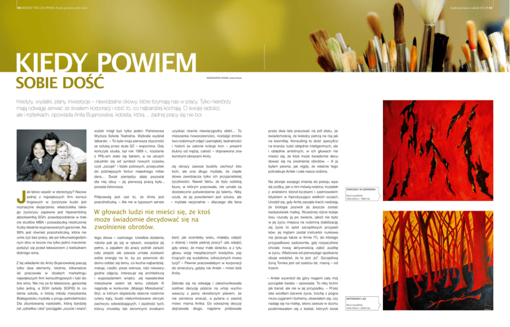40 RODZIC TEŻ CZŁOWIEK: Kiedy powiem sobie dość KIEDY POWIEM SOBIE DOŚĆ © www.istockphoto.com/JestersCap Cudowne lata w szkole 03|08 41 MAGDALENA OŁDAK, mama Stasia Kredyty, wydatki, plany, inwestycje – niewidzialne okowy, które trzymają nas w pracy. Tylko niektórzy mają odwagę zerwać ze światem korporacji i robić to, co najbardziej kochają. O swojej radości, ale i rozterkach, opowiada Anita Bujanowska, kobieta, która… żadnej pracy się nie boi. J ak łatwo wpaść w stereotypy? Nazwa jednej z największych firm konsultingowych w życiorysie budzi jednoznaczne skojarzenia: właścicielka takiego życiorysu zapewne jest hiperambitną absolwentką SGH, prawdopodobnie w trakcie studiów MBA i posiadaczką niezliczonej liczby idealnie wyprasowanych garsonek. Na 99% jest również pracoholiczką, która nie umie żyć bez pracy, ale po kilkunastogodzinnym dniu w biurze ma tylko jedno marzenie: położyć się przed telewizorem z kieliszkiem dobrego wina. Z tej układanki do Anity Bujanowskiej pasują tylko dwa elementy. Istotnie, kilkanaście lat pracowała w działach marketingu największych firm konsultingowych i lubi dobre wino. Nie ma za to telewizora, garsonkę tylko jedną, a SGH (wtedy SGPiS) to ostatnia szkoła, o której młoda mieszkanka Białegostoku myślała u progu pełnoletniości. Dla zbuntowanej nastolatki, którą bardziej od „szkiełka i oka” pociągało „czucie i wiara”, wybór mógł być tylko jeden: Państwowa Wyższa Szkoła Teatralna. Wybrała wydział lalkarski. – To była moja pierwsza styczność ze sztuką przez duże SZ – wspomina. Gdy kończyła studia, był rok 1989 r., rozstanie z PRL-em stało się faktem, a na ulicach zaludniło się od symboli nowych czasów, czyli „szczęk” i łóżek polowych, przepustek do późniejszych fortun niejednego miliardera… Świat pieniędzy dalej pozostał dla niej obcy – jej pierwszą pracą była… posada listonosza. Półprawdą jest zaś to, że Anita jest pracoholiczką. – Ale nie w typowym sensie uzyskać równie niewiarygodny efekt… To mieszanka nowoczesności, nostalgii (mnóstwo rodzinnych zdjęć i pamiątek), teatralności i historii (w salonie króluje tron – prezent ślubny od męża), całość – doprawiona znakomitymi obrazami Anity. Jej obrazy zawsze budziły zachwyt bliskich, ale ona długo myślała, że ciepłe słowa zawdzięcza tylko ich przyjacielskiej życzliwości. Nawet faktu, że były ozdobą biura, w którym pracowała, nie uznała za dostateczne potwierdzenie jej talentu. Niby czuła, że jej powołaniem jest sztuka, ale – myślała racjonalnie – dlaczego dla fana- W głowach ludzi nie mieści się, że ktoś może świadomie decydować się na zwolnienie obrotów. tego słowa – zastrzega. Uwielbia działanie, robota pali jej się w rękach, wszędzie jej pełno, a zapałem do pracy potrafi zarazić cały zespół, ale zawsze umiała zostawić sobie energię na to, by po powrocie do domu oddać się temu, co kocha najbardziej: maluje, rzeźbi, pisze wiersze, robi niewiarygodne zdjęcia, interesuje się architekturą i wyposażeniem wnętrz. Jej kawalerskie mieszkanie osiem lat temu zdobyło III nagrodę w konkursie „Mojego Mieszkania”. Styl, w którym dopieściła obecne rodzinne cztery kąty, budzi niekontrolowane okrzyki zachwytu odwiedzających. I zazdrość tych, którzy chcieliby tak skromnymi środkami berii, jak oceniłoby wielu, miałaby odejść z dobrej i nieźle płatnej pracy? Jak odejść, gdy wiesz, że masz małe dziecko, a z tyłu głowy wizję niespłaconych kredytów, piętrzących się wydatków, odroczonych inwestycji? – Pewnie pracowałabym w korporacji do emerytury, gdyby nie Antek – mówi dziś Anita. Zebrała się na odwagę i zakomunikowała szefowi decyzję pójścia na urlop wychowawczy z jasno określonym planem, że nie zamierza wracać, a pytana o zawód, mówi: mama Antka. Do odważnej decyzji dojrzewała długo, najpierw próbowała przez dwa lata pracować na pół etatu, ze świadomością, że koledzy patrzą na nią jak na kosmitkę. Konsulting to dość specyficzna branża: ludzi obłędnie inteligentnych, ale i obłędnie ambitnych, w ich głowach nie mieści się, że ktoś może świadomie decydować się na zwolnienie obrotów. – A ja byłam pewna, jak nigdy, że właśnie tego potrzebuje Antek i cała nasza rodzina. Na dźwięk swojego imienia do pokoju wpada zzzBuj, jak o nim mówią rodzice, trzylatek z anielskimi blond-loczkami i szelmowskim błyskiem w hipnotyzująco wielkich oczach. Urodził się, gdy Anita zaczęła tracić nadzieję, że biologia pozwoli jej jeszcze zostać kiedykolwiek matką. Wcześniej różne koleje losu rzucały ją po świecie, jakoś nie było w jej życiu miejsca na rodzinną stabilizację. Jej życie to splot szczęśliwych przypadków: jej mężem został instruktor nurkowania (pracuje także w firmie IT), do którego przypadkowo zadzwoniła, gdy rozpaczliwie chciała nową aktywnością zabić pustkę w życiu. Właściwie od pierwszego spotkania oboje wiedzieli, że to jest „to”. Szczęśliwą żoną Tomka jest od sześciu lat, mamą – od trzech. – Antek wywrócił do góry nogami cały mój porządek świata – opowiada. To niby brzmi jak banał, ale nie w jej przypadku. – Przez lata wiodłam barwne życie, trochę z pogranicza cyganerii i bohemy, obawiałam się, czy nadaję się na matkę, skoro zawsze w duchu podśmiewałam się z kobiet, których świat TAŃCZĄCY W CZERWIENI Akryl na płótnie 120x120cm / 1999 rok ANTOSIOWY LAS Akryl na płótnie 150x130cm / 2004 rok 42 RODZIC TEŻ CZŁOWIEK: Kiedy powiem sobie dość Cudowne lata w szkole 03|08 43 zredukował się do pieluch i słoiczków Gerbera. A teraz… godzinami potrafię siedzieć z Antkiem na dywanie, budować wieże z klocków i wpatrywać się w moje szczęście. RÓŻA OCZY KAMIENIE Akryl na płótnie 160x100cm / 2007 rok Kilka miesięcy po ukończeniu studiów zamieniła to