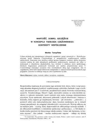 KULTURA I WARTOŚCI ISSN 2299-7806 NR 4 (8) /2013 ARTYKUŁY s. 91–106 WARTOŚĆ, DOBRO, SZCZĘŚCIE W KONCEPCJI TADEUSZA CZEŻOWSKIEGO. KONTEKSTY WSPÓŁCZESNE Monika Torczyńska Celem artykułu jest interpretacja wybranych zagadnień i pojęć zawartych w filozoficznoetycznej myśli Tadeusza Czeżowskiego w perspektywie współczesnych realiów społecznych. Znaczenie oraz możliwe relacje łączące kategorie wartości, dobra, kryteriów wartości należą do stale aktualnych problemów praktycznych, istotnych nie tylko w dyskusjach o charakterze akademickim, lecz również w praktyce życia społecznego. Istotnym fragmentem poniższych rozważań jest analiza proponowanej przez T. Czeżowskiego koncepcji szczęścia oraz ewentualnych dróg jego osiągnięcia. Jest to zagadnienie, które było dotąd traktowane marginalnie w opracowaniach poświeconych jego poglądom. Zawarte tu refleksje mają na celu wypełnienie tej luki. Słowa kluczowe: etyka, wartość, dobro, szczęście, cierpienie. UWAGI WSTĘPNE Bezpośrednią inspiracją do powstania tego artykułu były słowa, które wciąż pozostają aktualną diagnozą kondycji współczesnego człowieka Zachodu i jego cywilizacji. Ich autorem jest T. Czeżowski, przedstawiciel szkoły lwowsko-warszawskiej, uczeń K. Twardowskiego, filozof i logik, niezwykle ceniony za swój dorobek naukowy w zakresie metaetyki, teorii wartości oraz nurtu zwanego intuicjonizmem etycznym. Życie społeczne, aktywność jednostek i całych zbiorowości zmierza w kierunku, który napawa go niepokojem, bowiem – jak stwierdza – „człowiek […] postawił sobie cele maksymalistyczne: dąży, kosztem zamknięcia się w ramach ciasnej specjalizacji, do osiągnięć rekordowych i szczytowych. Wyścig odbywa się na każdym polu – wyścig, który doprowadził do olbrzymiego rozwoju techniki i do olbrzymich konfliktów w dziedzinie społecznej i politycznej […]. Od ideału rekordu trzeba nawrócić do klasycznego ideału umiaru. Umiar, ład, harmonia, to kryteria etyczne”1. Kto jednak – można realistycznie zapytać – oddaje się dzisiaj 1 T. Czeżowski, Trzy postawy wobec świata, [w:] tenże, Pisma z etyki i teorii wartości, red. P. Smoczyński, Ossolineum, Wrocław 1989, s. 45. 91 M. TORCZYŃSKA – WARTOŚĆ, DOBRO, SZCZĘŚCIE... etycznym rozmyślaniom w biegu pomiędzy jedną a drugą posadą, bądź w drodze do banku hipotecznego, by spłacić ratę trzydziestoletniego kredytu? Rzeczywiście, współczesne czasy (tzn. czasy wszelkich możliwych kryzysów, analizowanych między innymi w pracach U. Becka2 i F. Fukuyamy3) nie sprzyjają tego rodzaju refleksji, usytuowanej daleko od sfery gospodarki, technologii, polityki czy władzy. Najbardziej pesymistyczne koncepcje zawierają scenariusze nie tylko przejściowych kryzysów, lecz ogólnej i długotrwałej zapaści zachodniego społeczeństwa. F. Fukuyama twierdzi wręcz, że „przyszłość najpewniej – zdają się mówić doświadczenia XX wieku – przyniesie nowe i niewyobrażalne zło: poczynając od fanatycznych dyktatur, ludobójstwa […], a na wojnie nuklearnej i efekcie cieplarnianym kończąc”4. Rozważania filozoficzno-moralne wydają się być „odkładane” na spokojniejsze chwile, gdy już opanujemy ekonomiczną bessę, zapaść na rynku zatrudnienia, międzynarodowe konflikty polityczne i zbrojne, globalne problemy związane z wyniszczeniem środowiska naturalnego, ubóstwem, głodem i śmiertelnymi chorobami dziesiątkującymi całe społeczeństwa. Jednakże, w takich momentach to przecież nie nauka czy polityka, lecz właśnie „etyka krystalizuje nasze postawy wobec najdonioślejszych zdarzeń […]. Określa ona naszą postawę wobec życia i tego, co nadaje mu wartość. Wyraża nasze rozumienie człowieczej natury i ludzkiego szczęścia, określając, co znaczy udane życie”5, zarówno w wymiarze indywidualnym, jak i zbiorowym. Recepcja oraz interpretacja filozoficzno-etycznych rozważań Tadeusza Czeżowskiego stanowi rozległe zadanie wymagające stałych eksploracji teorii wielu innych myślicieli, którzy inspirowali autora Odczytów filozoficznych. Arystoteles, Brentano, Ingarden, Twardowski, Kotarbiński – to postaci często cytowane zarówno przez samego T. Czeżowskiego, jak i przez badaczy jego etycznej, logicznej czy metafizycznej spuścizny naukowej. Wiele poglądów T. Czeżowskiego zostało już wnikliwie zinterpretowanych w kontekście osiągnięć wyżej przywołanych uczonych. Różnorodne zagadnienia mieszczące się w obrębie „Ingardenowskiego” sporu o istnienie świata6, zróżnicowane sposoby pojmowania statusu etyki niezależnej głoszonej przez T. Kotarbińskiego7, metaetyczne 2 Zob. np. poglądy U. Becka dotyczące zagrożeń współczesnych rozwiniętych społeczeństw, które w dobie globalizacji funkcjonują w stanie permanentnego ryzyka w dziele: U. Beck, Społeczeństwo ryzyka. W drodze do innej nowoczesności, tłum. S. Cieśla, Wyd. Naukowe Scholar, Warszawa 2004. 3 Por. np. tezy F. Fukuyamy zawarte w pracach: Koniec historii, tłum. T. Bieroń, M. Wichrowski, Wyd. Znak, Kraków 2009; Koniec człowieka. Konsekwencje rewolucji biotechnologicznej, tłum. B. Pietrzyk, Wyd. Znak, Kraków 2004. 4 F. Fukuyama, Koniec historii, wyd. cyt., s. 28. 5 S. Blackburn, Sens dobra. Wprowadzenie do etyki, tłum. T. Chawziuk, Dom Wydawniczy Rebis, Poznań 2002, s. 88. Zob. również: S. Critchley, Nieustające żądanie. Etyka polityczna, tłum. R. Dobrowolski, M. Gosin, Wyd. Naukowe Dolnośląskiej Szkoły Wyższej, Wrocław 2006; J. Teichman, Etyka społeczna, tłum. A. Gąsior-Niemiec, Oficyna Naukowa, Warszawa 2002. 6 Por. np. A. Olech, Stanowisko Tadeusza Czeżowkiego wobec sporu o istnienie świata, [w:] Tadeusz Czeżowski (1889–1981). Dziedzictwo idei: logika – filozofia – etyka, red. W. Tyburski, R. Wiśniewski, Wyd. UMK, Toruń 2002, s. 109; K. Stachewicz, Czeżowski i Ingarden: dwie teorie poznawania wartości moralnych 