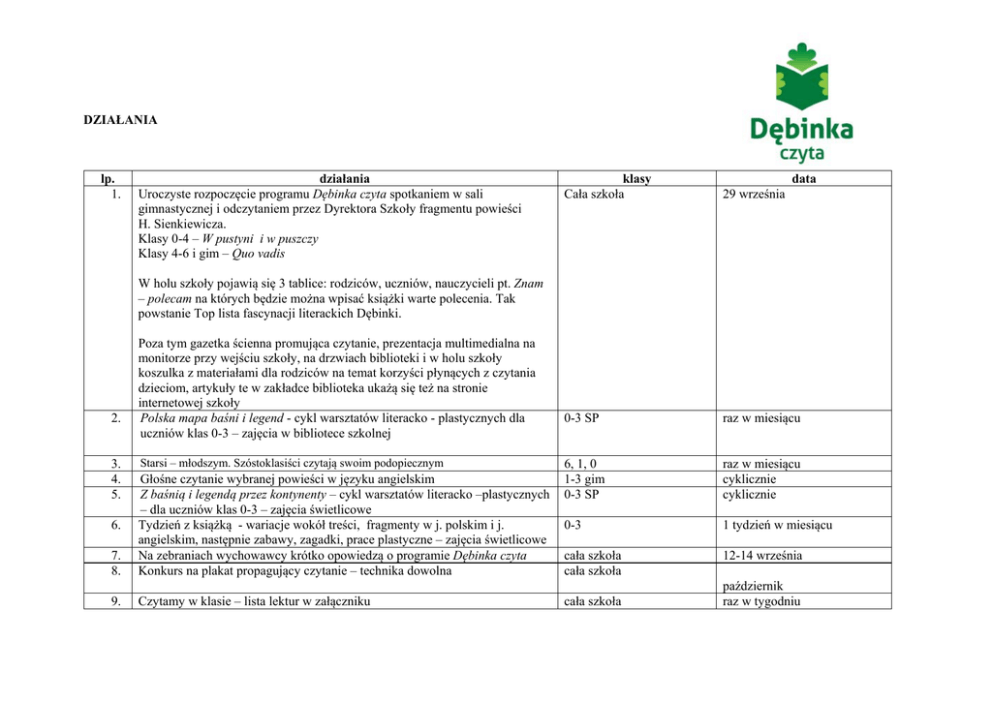 DZIAŁANIA lp. 1. działania Uroczyste rozpoczęcie programu Dębinka czyta spotkaniem w sali gimnastycznej i odczytaniem przez Dyrektora Szkoły fragmentu powieści H. Sienkiewicza. Klasy 0-4 – W pustyni i w puszczy Klasy 4-6 i gim – Quo vadis klasy Cała szkoła data 29 września 0-3 SP raz w miesiącu 6, 1, 0 1-3 gim 0-3 SP raz w miesiącu cyklicznie cyklicznie 0-3 1 tydzień w miesiącu cała szkoła cała szkoła 12-14 września W holu szkoły pojawią się 3 tablice: rodziców, uczniów, nauczycieli pt. Znam – polecam na których będzie można wpisać książki warte polecenia. Tak powstanie Top lista fascynacji literackich Dębinki. 2. 3. 4. 5. Poza tym gazetka ścienna promująca czytanie, prezentacja multimedialna na monitorze przy wejściu szkoły, na drzwiach biblioteki i w holu szkoły koszulka z materiałami dla rodziców na temat korzyści płynących z czytania dzieciom, artykuły te w zakładce biblioteka ukażą się też na stronie internetowej szkoły Polska mapa baśni i legend - cykl warsztatów literacko - plastycznych dla uczniów klas 0-3 – zajęcia w bibliotece szkolnej Starsi – młodszym. Szóstoklasiści czytają swoim podopiecznym 7. 8. Głośne czytanie wybranej powieści w języku angielskim Z baśnią i legendą przez kontynenty – cykl warsztatów literacko –plastycznych – dla uczniów klas 0-3 – zajęcia świetlicowe Tydzień z książką - wariacje wokół treści, fragmenty w j. polskim i j. angielskim, następnie zabawy, zagadki, prace plastyczne – zajęcia świetlicowe Na zebraniach wychowawcy krótko opowiedzą o programie Dębinka czyta Konkurs na plakat propagujący czytanie – technika dowolna 9. Czytamy w klasie – lista lektur w załączniku 6. cała szkoła październik raz w tygodniu 10. Mądre bajki z całego świata – Uczniowie słuchają bajek na lekcji, następnie dyskutują. http://kulczykfoundation.org.pl/bajki 11. Książka mojego dzieciństwa – zaproszeni rodzice czytają dzieciom 12. Co to za historia? Konkurs Na gazetce ściennej umieszczony zostaje cytat z książki dla dzieci (trzy poziomy – edukacja wczesnoszkolna, szkoła podstawowa, gimnazjum). Jest on podpisany. Ogłaszamy konkurs, który polega na dopisaniu wcześniejszego i późniejszego fragmentu tej historii. Po ocenie jury wybiera jednego zwycięzcę na każdym etapie nauczania. Nagrodą jest książka, z której pochodził cytat. 13. Czytamy i piszemy bajki filozoficzne 14. Co to jest ekslibris. Na języku polskim uczniowie dowiadują się, czym jest. Na lekcji plastyki, zaj. komputerowych projektują własne 15. Wystawa poświęcona H. Sienkiewiczowi 16. Moja wymarzona książka – zaj. komputerowe 17. Księga aforyzmów Małego Księcia 18. Czytamy Sienkiewicza na historii 19. Wyjście do Muzeum H. Sienkiewicza, 20. Przedstawienie Henryka Sienkiewicza nie tylko jako pisarza, ale także jako 0-3 SP cały rok szkoła podstawowa cała szkoła raz w miesiącu, ostatni tydzień raz w półroczu: styczeń i maj 1 gim. szkoła podstawowa cyklicznie wrzesień, październik biblioteka 2, 3 SP I gim 6 SP 4, 5, 6 4, 5, 6 październik październik październik 21. Lekcje wychowawcze, poświęcone dyskusji: Dlaczego warto czytać. Wypisanie argumentów i umieszczenie ich na gazetkach klasowych 22. Międzynarodowy Miesiąc Bibliotek Szkolnych: gazetki tematyczne, nowości czytelnicze, także prezentacja nowinek z zaprzyjaźnionych bibliotek – tablica przy bibliotece, monitor w holu szkoły cała szkoła październik/ listopad cała szkoła październik 23. Warsztaty w Bibliotece Raczyńskich – filia 59 3 SP 24. Przedstawienie Mała księżniczka w Teatrze Łejery. Po spektaklu uczniowie czytają fragmenty powieści na scenie 5 listopad/ grudzień 10 października 25. Śladami Stasia i Nel – warsztaty w Palmiarni, podsumowujące omawianą lekturę 5, 6 listopad podróżnika? październik, listopad październik, listopad 26. Spotkanie z pisarką, Mają Rausch 1-3 SP 16 listopada, godz. 9.30 6 SP 16 listopada, godz. 11.00 27. Spotkanie z poetami: Marią Magdaleną Pocgaj i Andrzejem Walterem – Międzynarodowy Listopad Poetycki 28. Turniej recytatorski „O złoty liść Dębinki” – Na skrzydłach wyobraźni 29. Warsztat mający na celu przekazanie wiedzy i praktycznych umiejętności wspierania kompetencji czytania u dzieci – cz. 1 1-3 gim 8 listopada, godz. 13.00 1-6 SP Rodzice listopad 17 listopada 30. Wieczór z książką pt. Chcecie wierzyć, czy nie chcecie, krasnoludki są na świecie 0-3 SP listopad 2-6 SP i I gim listopad 31. Jak powstaje książka– cykl spotkań z: - pisarzem/poetą - filologiem/prac. biblioteki - redaktorem - ilustratorem - wydawcą Podsumowaniem może być stworzenie klasowej książki 32. Czytanie wigilijne 33. Tworzymy książkę klasowych opowieści 34. Popołudnie z baśnią – uczniowie pięknie czytają swoją ulubioną baśń – przy herbatce i ciasteczku. Odpowiedni ubiór… Może zaproszą rodziców? styczeń luty marzec kwiecień maj-czerwiec SP i gim 2 SP 3b, 4a, 4b 35. Zapraszam Cię na herbatkę – głośne czytanie fragmentów Opowieści z Narnii z 4b, 4a podziałem na role 36. Konkurs List do ulubionego bohatera literackiego 4-6 SP 37. W ramach Międzynarodowego Dnia Języka Ojczystego zostanie zorganizowany konkurs frazeologiczny Twardy orzech do zgryzienia dla uczniów klas 4-6 38. Akcja propagująca czytanie na Dębcu. Uczniowie rozdają ulotki zachęcające do 4-6 i gim. czytania. grudzień grudzień styczeń styczeń/ luty luty 21 lutego 21 marca 39. Prezentacje, w ramach lekcji języka polskiego, języka angielskiego, języka hiszpańskiego języka niemieckiego, w kl. 4-6 „Znalazłem książkę moich marzeń". Zespół klasowy może oceniać prezentujących 40. Lekcje w Bibliotece Raczyńskich 41. Warsztat mający na celu przekazanie wiedzy i praktycznych umiejętności wspierania kompetencji czytania u dzieci – cz. 2 42. Warsztaty w Bibliotece Uniwersyteckiej w ramach Tygodnia Biblio