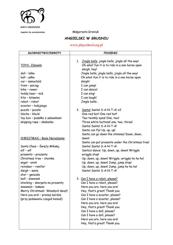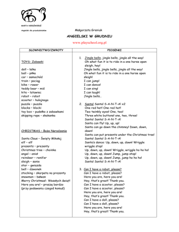MARTA NIEDŹWIEDŹ Małgorzata Greniuk Angielski dla przedszkolaków ANGIELSKI W GRUDNIU www.playschool.org.pl SŁOWNICTWO/ZWROTY PIOSENKI 1. TOYS- Zabawki doll – lalka ball – piłka car – samochód train – pociąg bike – rower teddy bear – miś kite – latawiec robot – robot scooter – hulajnoga puzzle – puzzle blocks – klocki toy box – pudełko z zabawkami skipping rope – skakanka CHRISTMAS – Boże Narodzenie Santa Claus – Święty Mikołaj elf – elf presents – prezenty Christmas tree – choinka angel – anioł reindeer – renifer sleigh – sanie star – gwiazda bell – dzwonek stocking – skarpeta na prezenty snowman – bałwan Merry Christmas!- Wesołych świąt! Here you are! – proszę bardzo (przy podawaniu czegoś komuś) Jingle bells, jingle bells, jingle all the way! Oh what fun it is to ride in a one horse open sleigh, hey! Jingle bells, jingle bells, jingle all the way! Oh what fun it is to ride in a one horse open sleigh! I can jump! I can dance! I can sing! I can laugh! Jingle bells… 2. Santa! Santa! S-A-N-T-A! x2 One red hat! One red hat! Two twinkly eyes! One, two! Three white buttons! one, two, three! Santa! Santa! S-A-N-T-A! Santa can fly! Up, up, up! Santa can go down the chimney! Down, down, down! Santa can put presents under the Christmas tree! Santa! Santa! S-A-N-T-A! Santa’s dance: Up, down, up, down! Wriggle wriggle stop! Up, down, up, down! Wriggle, wriggle ho ho ho! Up, down, up, down! Jump, jump stop! Up, down, up, down! Jump, jump ho ho ho! Santa! Santa! S-A-N-T-A! 3. Can I have a robot, please? Can I have a robot, please? Here you are, here you are! Hey, that’s great! Thank you. Can I have a scooter, please? Can I have a scooter, please? Here you are, here you are! Hey, that’s great! Thank you. Can I have a doll, please? Can I have a doll, please? Here you are, here you are! Hey, that’s great! Thank you.