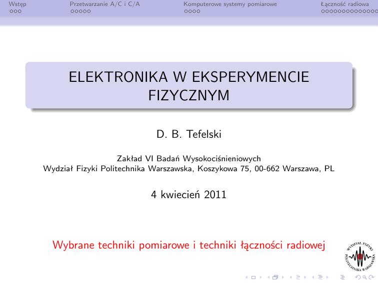 Wstęp Przetwarzanie A/C i C/A Komputerowe systemy pomiarowe Łączność radiowa ELEKTRONIKA W EKSPERYMENCIE FIZYCZNYM D. B. Tefelski Zakład VI Badań Wysokociśnieniowych Wydział Fizyki Politechnika Warszawska, Koszykowa 75, 00-662 Warszawa, PL 4 kwiecień 2011 Wybrane techniki pomiarowe i techniki łączności radiowej Wstęp Przetwarzanie A/C i C/A Komputerowe systemy pomiarowe Plan prezentacji 1 Wstęp Literatura 2 Przetwarzanie A/C i C/A Przetworniki A/C i D/C 3 Komputerowe systemy pomiarowe Interfejsy Oprogramowanie sterujące 4 Łączność radiowa Odbiorniki radiowe Nadajniki radiowe Anteny Łączność radiowa Wstęp Przetwarzanie A/C i C/A Komputerowe systemy pomiarowe Literatura Do przestudiowania Sławomir Tumański Technika pomiarowa Wydawnictwa Naukowo-Techniczne, Warszawa 2007 Waldemar Nawrocki Komputerowe Systemy Pomiarowe Wydawncitwa Komunikacji i Łączności, Warszawa 2002 Wiesław Tłaczała Środowisko LabVIEW w eksperymencie wspomaganym komputerowo Wydawnictwa Naukowo-Techniczne, Warszawa 2002 Łączność radiowa Wstęp Przetwarzanie A/C i C/A Komputerowe systemy pomiarowe Literatura Przyrządy pomiarowe Pomiary sygnałów stałych Pomiary sygnałów zmiennych Pomiary czasu Pomiary oscyloskopowe (oscyloskop analogowy, cyfrowy) Rejestratory Układy mostkowe Metody pomiaru kompensacyjne Metody pomiaru komparacyjne Łączność radiowa Wstęp Przetwarzanie A/C i C/A Komputerowe systemy pomiarowe Literatura Przetwarzanie analogowe a cyfrowe Przykład filtrów Łączność radiowa Wstęp Przetwarzanie A/C i C/A Komputerowe systemy pomiarowe Łączność radiowa Przetworniki A/C i D/C Przetworniki A/C Aby przetwarzać dane pomiarowe w systemach komputerowych konieczne jest przetworzenie sygnału analogowego na postać cyfrową. Służą do tego elementy zwane przetwornikami analogowo–cyfrowymi (A/D) Przetwarzanie analogowo–cyfrowe obejmuje procesy: Próbkowanie – pobieranie próbek sygnału w określonych odstępach czasu Kwantowanie – przypisanie każdej próbce wartości ze skończonego zbioru obejmującego zakres pomiarowy. Wstęp Przetwarzanie A/C i C/A Komputerowe systemy pomiarowe Łączność radiowa Przetworniki A/C i D/C Twierdzenie o próbkowaniu – przypomnienie Przypomnienie: Twierdzenie Shannona-Kotielnikowa - o próbkowaniu. Częstotliwość próbkowania sygnału „dolnopasmowego” o maksymalnej częstotliwości w składowych widmowych fg powinna być nie mniejsza niż 2 · fg . Częstotliwość fg nazywana jest częstotliwością Nyquista. Próbkowanie sygnału jest w ujęciu teorii sygnałów modulacją amplitudy. Falą nośną jest ciąg impulsów próbkujących a sygnałem modulującym jest badany sygnał. Jeśli nie jest spełnione twierdzenie S-K, to pojawia się zjawisko „aliasing–u”. Wstęp Przetwarzanie A/C i C/A Komputerowe systemy pomiarowe Łączność radiowa Przetworniki A/C i D/C Przetworniki A/C Podstawowe parametry: rozdzielczość i częstotliwość próbkowania Rodzaje przetworników A/C Całkujące (najpowolniejsze) – fmax ≈ 1KHz 10 – 20bit Delta-Sigma fmax ≈ 100KHz 14 – 24bit SAR (Successive Approximation Register) – przetwornik z kompensacją wagową fmax ≈ 1MHz 8 – 18bit Potokowe fmax ≈ 100MHz 10 – 16bit Flash (bezpośredniego kodowania) fmax > 100MHz max 10 bit Wstęp Przetwarzanie A/C i C/A Komputerowe systemy pomiarowe Łączność radiowa Przetworniki A/C i D/C Przetworniki C/A Podstawowe paramety: Rozdzielczość przetwarzania – podawana w bitach zapewniających pełne zakodowanie N skwantowanych stanów. min Rozdzielczość bezwzględna: ∆Ur = UmaxN−Umin = Umax2−U n Przykład: 16bit przetwornik o maks. napięciu wyjściowym 5V ma rozdzielczośc: 76,3 µV . Dokładność przetwornika – określone poprzez błąd bezwzlędny ∆Ub – podawany często jako LSB (Least Significant Bits) lub względny (różnica między wartością b rzeczywistą sygnału a idealną). σ = Umax∆U −Umin Wstęp Przetwarzanie A/C i C/A Komputerowe systemy pomiarowe Łączność radiowa Przetworniki A/C i D/C Przetworniki C/A . . . Podstawowe paramety 2: Czas ustalania – czas od zmiany sygnału cyfrowego na wejściu do ustalenia się wartości analogowej na wyjściu – podawane w ns albo µs Częstotliwość przetwarzania c/a Stosunek sygnału do szumu SNR (Signal to Noise Ratio) Typy przetworników C/A: Z rezystancyjnym dzielnikiem napięcia lub prądu Ze zmiennym współczynnikiem wypełnienia ciągu impulsów Wstęp Przetwarzanie A/C i C/A Komputerowe systemy pomiarowe Łączność radiowa Interfejsy Interfejsy RS232C (Recommended Standard 232) RS485 (Recommended Standard 485) GPIB (General Purpose Interface BUS) (IEEE-488) USB (Universal Serial Bus), FireWire (IEEE-1394) CAN (Controller Area Network) I 2 C (Inter-Integrated Circuit) SPI (Serial Peripheral Interface) CAMAC (Computer Automated Measurement and Control) PXI (PCI Extensions for Instrumentation) VXI (VME Extensions for Instrumentation) Wstęp Przetwarzanie A/C i C/A Komputerowe systemy pomiarowe Interfejsy Łącza Przewodowe: Szeregowe RS232C / RS485 Ethernet – kable RJ–45 Łącza światłowodowe Bezprzewodowe: WIFI (Wireless Fidelity) GSM – telefonia komórkowa Bluetooth ZigBee Modemy radiowe Łączność radiowa Wstęp Przetwarzanie A/C i C/A Komputerowe systemy pomiarowe Łączność radiowa Oprogramowanie sterujące Programowanie przyrządów Uniwersalny język programowania przyrządów: SCPI – Standard Commands for Programmable Instruments Przykład: : MEASure:VOLTage:AC? 20, 0.001 : – oznacza początek nowej komendy MEAS:VOLT:AC - oznacza pomiar napięcia prądu zmiennego ? – oznacza żądanie przysłania zmierzonej wartości do komputera 20, 0.001 – oznacza zakres 20V i rozdzielczość 1mV Wystarczy wysyłać skrócone wersje komend Wstęp Przetwarzanie A/C i C/A Komputerowe systemy pomiarowe Łączność radiowa Oprogramowanie sterujące Wirtualne przyrządy pomiarowe Oprogramowanie systemu pomiarowego – to co