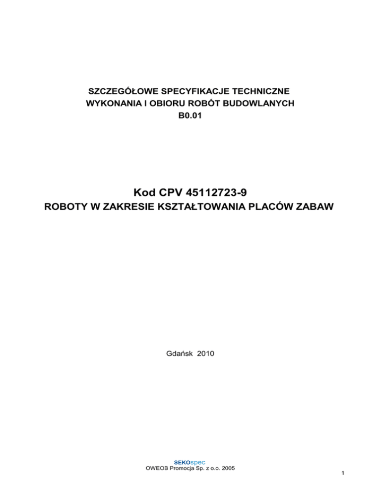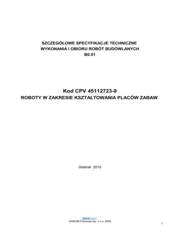 SZCZEGÓŁOWE SPECYFIKACJE TECHNICZNE WYKONANIA I OBIORU ROBÓT BUDOWLANYCH B0.01 Kod CPV 45112723-9 ROBOTY W ZAKRESIE KSZTAŁTOWANIA PLACÓW ZABAW Gdańsk 2010 SEKOspec OWEOB Promocja Sp. z o.o. 2005 1 I.PRZEDMIOT SPECYFIKACJI TECHNICZNEJ Przedmiotem Szczegółowej Specyfikacji Technicznej są wymagania dotyczące wykonania i odbioru robót związanych z zagospodarowaniem terenu i małą architekturą na terenie prowadzonych robót dotyczących wykonania placu zabaw dla dzieci z klas I – III w ramach programu „Radosna Szkoła” na terenie Ogólnokształcącej Szkoły Muzycznej I i II st. w Gdańsku przy ul. Gnilnej 3 2. Zakres stosowania ST Specyfikacja Techniczna jest stosowana jako dokument przetargowy i kontraktowy przy zlecaniu i realizacji robót wymienionych w punkcie 1. 3. Zakres Robót objetych niniejszą specyfikacją. Roboty, których dotyczy specyfikacja, obejmuja wszystkie czynności mające na celu wykonanie zagospodarowania terenu i małej architektury. Projekt placu zabaw dla dzieci klas I – III obejmuje: rozbiórkę 50m2 boiska o nawierzchni bitumicznej, wykonanie we własnym zakresie (nie objętym niniejszym przetargiem) nawierzchni trawiastej, wykonanie nawierzchni bezpiecznych z podłoża syntetycznego i podłoża gumowego, montaż urządzeń zabawowych oraz zestawów sportowo – rekreacyjnych. Zaprojektowane ścieżki piesze z materiału amortyzującego upadek np. płytki elastyczne Flexi-Step lub równoważnej. Płytki gumowe produkowane są z kolorowego granulatu gumowego o wielkosci ziaren ok. 1-3 mm,zwia zanego klejem poliuretanowym. Połaczenie tym składników daje bezpieczna nawierzchnie o wysokich właściwościach amortyzujacych. Produkt jest wodoprzepuszczalny, trwały, odporny a mróz, deszcz i słońce. Wymiary handlowe 50x50cm. Wysokość swobodnego upadku do 3 m. 4. Ogólne wymagania dotyczace robót Wykonawca robót jest odpowiedzialny za jakość ich wykonania oraz za zgodność z dokumentacja projektowa, ST i poleceniami Inspektora nadzoru. II. MATERIAŁY 1. Wymagania ogólne 0gólne wymagania dotyczace materiałów, ich pozyskiwania i składowania podano w ST "Wymagania ogólne" Kod CPV 45000000-7. Przed rozpoczeciem robót należy przygotować teren przy obiekcie na tymczasowe składowisko materiałów uzyskanych z rozbiórki. Gruz i pozostałe materiały z rozbiórki nalezy wywieżć na wysypisko. 2. Rodzaje materiałów. 2.1.Rodzaje nawierzchni na placu zabaw. 2.1.1.Nawierzchnia trawiasta. Nawierzchnię trawiastą Zamawiający wykona we własnym zakresie. Wykonawca robót zobowiązany jest do zachowania w nienaruszonym stanie istniejącej nawierzchni. W przypadku jej uszkodzenia zobowiązany jest do przywrócenia stanu pierwotnego. 2.1..2 Podłoze syntetyczne. Ścieżkę pieszą na terenie placu zabaw wykonać z nawierzchni syntetycznej amortyzującej upadek bawiących sie dzieci do wysokoąci 1,0 m. Po usunięciu warstw gruntu na głebokość 30cm wykonać posypke piaskowa gr. 5cm. Nastepnie warstwe nosna gr. 15cm wykonac z kruszywa o frakcji 0-32mm.Warstwe wyrównawcza wykonac z tzw. klinca o frakcji 0-8mm gr. 5cm. Nawierzchnię bezpieczną ułożyć np. z kostek syntetycznych o wym. 50x50cm, w kolorze niebieskim. Projektowana nawierzchnia bezpieczna powinna spełniac norme PN-EN 1177 - określającą wymagania odnośnie nawierzchni stosowanych na placu zabaw, ze szczególnym uwzględnieniem obszarów, w których niezbędna jest amortyzacja upadku. Nawierzchnia syntetyczna składa sie z dwóch warstw: a) spodniej warstwy z udziałem granulatu czarnego SBR; b) wierzchniej warstwy z udziałem kolorowego granulatu kauczukowego EPDM. Zadaniem warstwy spodniej jest pochłanianie energii uderzenia. Warstwa wierzchnia jest odporna na promieniowanie UV i ma za zadanie chronić warstwę spodnią przed ścieraniem. Montaż nawierzchni syntetycznej rozpoczyna si e od wylania warstwy granulatu czarnego. Czas utwardzania warstwy wynosi 24 godziny. Kolejnym etapem montażu jest utwardzenie nawierzchni za pomoca metalowego wału, a następnie pokrycie jej warstwa kleju poliuretanowego. Po upływie około 2 godzin od aplikacji kleju poliuretanowego można przystapić do nakładania wierzchniej warstwy kolorowego granulatu. Utwardzenie warstwy kolorowej masy gumowej następuje po 24 h od jej wylania , przy użyciu metalowego wału. 2.1.3. Podłoze gumowe. W miejscu posadowienia urządzeń zabawowych oraz zestawów sportowo – rekreacyjne dla dzieci z klas I SEKOspec OWEOB Promocja Sp. z o.o. 2005 2 – III wykonać podłoże gumowe lub syntetyczne amortyzujące upadek bawiących się dzieci do wysokości 1,5 m oraz do wys. 2,4m. Po usunieciu warstw gruntu na głębokość ok. 30cm wykonać posypkę piaskową gr. 5cm. Następnie warstwę nośną gr. 15cm wykonać z kruszywa o frakcji 0-32mm. Warstwę wyrównawczą wykonać z tzw. klińca o frakcji 0-8mm gr. 5cm. Nawierzchnię bezpieczna wykonać z antypoślizgowego podłoża gumowego lub syntetycznego gr. 8cm w kolorze pomarańczowym – paleta barw n.p.PANTONE: 540C lub RAL 2011 TIEFORANGE, np. z kostek o wymiarach 50x50. III. KONTROLA JAKOSCI ROBÓT. Ogólne zasady kontroli jakości robót podano w ST "Wymagania ogólne" Kod CPV 45000000- 7 Sprawdzeniu podlega: - przygotowanie podłoża, - materiał użyty na podkład, - grubość i równomierność warstw podkładu - sposób i jakosc zagęszczenia, - jakość dostarczonych prefabrykatów, - prawidłowość ułożenia i zamulenia piaskiem, - jakość oraz prawidłowość wykonania ( zgodnie z projektem ) elementów małej architektury. - prawidłowość montażu elementów małej architektury. IV. OBMIAR ROBÓT. Ogólne zasady obmiaru podano w ST "Wymagania ogólne" Kod CPV 45000000-7 I. Jednostkami obmiarowymi są jednostki z przedmiaru robót. Obmiar powinien być dokonany na budowie w obecności Inspektora. Obmiar nie powinien obejmować jakichkolwiek robót nie wskazanych w dokumentacji projektowej, z wyjatkiem zaakceptowanych na piśmie przez Ins