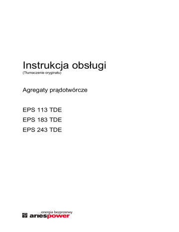 Instrukcja obsługi (Tłumaczenie oryginału) Agregaty prądotwórcze EPS 113 TDE EPS 183 TDE EPS 243 TDE EUROPOWER INSTRUKCJA OBSŁUGI EPS113TDE-EPS183TDE-EPS243TDE Str.2/6 WSTĘP Proszę uważnie zapoznać się z treścią Instrukcji Obsługi przed rozpoczęciem pracy z urządzeniem. Stosowanie się do zaleceń i wskazówek zawartych w tej instrukcji zagwarantuje prawidłową i bezawaryjną pracę generatora. W pierwszej kolejności przeczytaj instrukcję dotyczącą silnika, oraz alternatora, zawierają one podstawowe informacje na temat użytkowania, konserwacji, oraz opis niebezpieczeństw mogących wystąpić w przypadku niewłaściwego użytkowania. Wszystkie dane zawarte w instrukcji dotyczą podstawowych wersji modeli: EPS113TDE, EPS183TDE oraz EPS243TDE. Generatory wyposażone w dodatkowe opcje mogą mieć nieco inne parametry. Skontaktuj się z dilerem w celu uzyskania dodatkowych informacji. !!! WAŻNE !!! • • • • • • • NIE WYKONUJ ŻADNYCH PRAC SERWISOWYCH CZY REGULACJI NA ZESPOLE PRĄDOTWÓRCZYM, GDY GENERATOR JEST WŁĄCZONY. KONSERWACJI I SERWISOWANIA POWINNI DOKONYWAĆ WYŁĄCZNIE PRZESZKOLENI, POSIADAJĄCY ODPOWIENIE UPOWAŻNIENIA MECHANICY. NIE NOŚ LUŹNEGO UBRANIA PRZY OBSŁUDZE ZESPOŁU PRĄDOTWÓRCZEGO. NIE WŁĄCZAJ GENERATORA JEŚLI ZDJĘTE SĄ OSŁONY SILNIKA LUB ALTERNATORA. NIE NALEŻY URUCHAMIAĆ GENERATORA W ŹLE WENTYLOWANYCH POMIESZCZENIACH: SILNIK MOŻE SIĘ PRZEGRZAĆ I POWAŻNIE USZKODZIĆ. NIGDY NIE PODŁĄCZAJ GENERATORA DO SIECI, INNYCH URZĄDZEŃ PRĄDOTWÓRCZYCH, LUB ŹRUDEŁ PRĄDU. ZADBAJ ABY RĘCZNY TRANSPORT URZĄDZENIA WYKONYWANY BYŁ PRZEZ MAKSYMALNĄ (ZGODNIE Z LOKALNYM PRAWEM) LICZBĘ OSÓB. EUROPOWER INSTRUKCJA OBSŁUGI EPS113TDE-EPS183TDE-EPS243TDE Str.3/6 1. PARAMETRY ZESPOŁU PRĄDOTWÓRCZEGO Typ: EPS113TDE Moc: 3 x 400V : 11 kVA ; 1 x 230V : 3,3 kVA Prądnica : Sincro ET10 /TR2 (szczotkowa) Silnik: KUBOTA D722, 3-cylindrowy, 719cm³, 3000 obr/min, chłodzony cieczą Zbiornik paliwa: 25 litrów Wymiary: 138 x 64 x 70 cm Masa: 335 kg Poziom hałasu: LwA 90 dB Typ: EPS183TDE Moc: 3 x 400V : 18kVA, 1 x 230V : 6kVA Prądnica : Leroy Somer LSA37M8 z AVR (bezszczotkowa) Silnik: KUBOTA D1105, 3-cylindry, 1123cm³, 3000 obr/min, chłodzony cieczą Zbiornik paliwa: 63 litrów Wymiary: 150 x 64 x 90 cm Masa: 425 kg Poziom hałasu: LwA 93 dB Typ: EPS243TDE Moc: 3 x 400V : 24 kVA ; 1 x 230V : 7,7kVA Prądnica : Leroy Somer LSA37L6 z AVR (bezszczotkowa) Silnik: KUBOTA V1505, 4-cylindrowy, 1498cm³, 3000 obr/min, chłodzony cieczą Zbiornik paliwa: 73 litrów Wymiary: 170 x 74 x 100 cm Masa: 490 kg Poziom hałasu: LwA 94 dB Podstawowe wyposażenie zespołu prądotwórczego: silnik diesla KUBOTA chłodzony cieczą (3000 obr/min),prądnica, panel kontrolny, wyłącznik awaryjny, wskaźnik poziomu paliwa, zabezpieczenie uziemienia 30 mA z sondą i kablem 4 m, pompa paliwa, licznik motogodzin, wyłącznik magnetyczny, pompa spuszczania oleju, czujnik niskiego ciśnienia oleju, zabezpieczenie magneto-termiczne, woltomierz, obudowa dźwiękochłonna. Parametry silnika i alternatora można znaleźć w instrukcji dołączanej do każdego generatora prądotwórczego. Specyfikacje panelu kontrolnego znajdują się w rozdziale drugim 2. EUROPOWER INSTRUKCJA OBSŁUGI EPS113TDE-EPS183TDE-EPS243TDE Str.4/6 2. OPIS PANELU KONTROLNEGO W skład panelu kontrolnego zespołu prądotwórczego wchodzą: - Kluczyk startowy (zapłon / włączony / wyłączony / start) - Lampka kontrolna zielona (zasilanie włączony / wyłączony), lampka świeci się kiedy zasilanie jest włączone - Lampka kontrolna czerwona (ładowanie akumulatora), lampka świeci się kiedy akumulator nie ładuje się - Licznik motogodzin - Woltomierz - Gniazda: • EPS113TDE: 1 x 230V 16A + 1 x CEE 230V 32A + 1 x 5-polowe CEE 32A 400V • EPS183TDE: 2 x 230V 16A + 1 x CEE 16A + 1 x CEE 32A 230V + 1 x 5-polowe CEE 16A 400V + 1 x 5-polowe CEE 32A 400V • EPS243TDE: 2 x 230V 16A + 1 x CEE 16A + 1 x CEE 32A 230V + 1 x 5-polowe CEE 16A 400V + 1 x 5-polowe CEE 32A 400V Na panelu kontrolnym znajdują się: - 1 przekaźnik 12V / 25A czujników ciśnienia oleju i temperatury płynu chłodzącego (zatrzymanie silnika w przypadku zbyt niskiego ciśnienia oleju lub zbyt wysokiej temperatury płynu chłodzącego) bezpiecznik termo-magnetyczny uziemienie 3. UŻYTKOWANIE GENERATORA OSTRZEŻENIE! Generatory EPS1133TDE / EPS183TDE / EPS243TDE są wyposażone w 12V elektryczną pompę paliwową. Pompa ta nie może pracować “na sucho”. Jeśli silnik zatrzyma się z powodu braku paliwa, wyłącz go kluczykiem przekręcając do pozycji „wyłączony”. 3.1.Rozruch silnika: - sprawdź poziom paliwa sprawdź poziom oleju otwórz zawór paliwowy (na filtrze paliwa) podgrzej świece przez około 10 sekund uruchom silnik kluczykiem w stacyjce silnik powinien popracować chwilę zanim podłączysz obciążenie. 3.2.Uruchomienie generatora: - na tabliczce znamionowej generatora można odczytać moc / maksymalną dopuszczalną wartość prądu ładującego. EUROPOWER INSTRUKCJA OBSŁUGI EPS113TDE-EPS183TDE-EPS243TDE Str.5/6 − w razie przeciążenia, termiczno-magnetyczne zabezpieczenie wyłączy generator po krótkim czasie zwłoki. Sprawdź obciążenie, zmniejsz je jeżeli jest to konieczne i włącz ponownie ochronę termiczno-magnetyczną. − w przypadku zwarcia, termiczno-magnetyczne zabezpieczenie niezwłocznie wyłączy agregat! Sprawdź co spowodowało zwarcie i załącz je ponownie. 3.3.Zatrzymywanie generatora: - przed całkowitym zatrzymaniem, generator powinien popracować przez kilka minut bez obciążenia. W ten sposób generator wychłodzi się. Następnie zatrzymaj silnik za pomocą stacyjki. 3.4.Chłodzenie: - upewnij się, że nic nie zasłania wlotu chłodnego powietrza upewnij się, że gorące powietrze, oraz gazy spalinowe mogą swobodnie wydostać się na zewnątrz nie dopuszczaj do pracy generatora w niewłaściwie wentylowanym pomieszczeniu! 3.5.Zabezpieczenia: - silnik: zabezpiecz