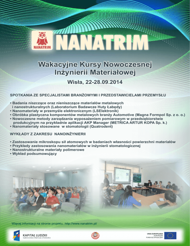Wakacyjne Kursy Nowoczesnej In ynierii Materiałowej Wisła, 22-28.09.2014 SPOTKANIA Zź SPźCJALISTAMI BRAN OWYMI I PRZźDSTAWICIźLAMI PRZźMYSŁU • Badania niszczące oraz nieniszczące materiałów metalowych i nanostrukturalnych (Laboratorium Badawcze Huty Łabędy) • Nanomateriały w przemyśle elektronicznym (LSźlektronik) • Obróbka plastyczna komponentów metalowych bran y Automotive (Magna Żormpol Sp. z o. o.) • Nowoczesne metody zarządzania wyposa eniem pomiarowym w przedsiębiorstwie produkcyjnym na przykładnie aplikacji AKP Manager (MźTRICA ARTUR KOPA Sp. k.) • Nanomateriały stosowane w stomatologii (Quatrodent) WYKŁADY Z ZAKRźSU NANOIN YNIźRII • Zastosowanie mikroskopu sił atomowych w badaniach własności powierzchni materiałów • Przykłady zastosowania nanomateriałów w in ynierii stomatologicznej • Nanostrukturalne materiały polimerowe • Wykład podsumowujący Więcej informacji na stronie projektu: http://www.nanatrim.pl/