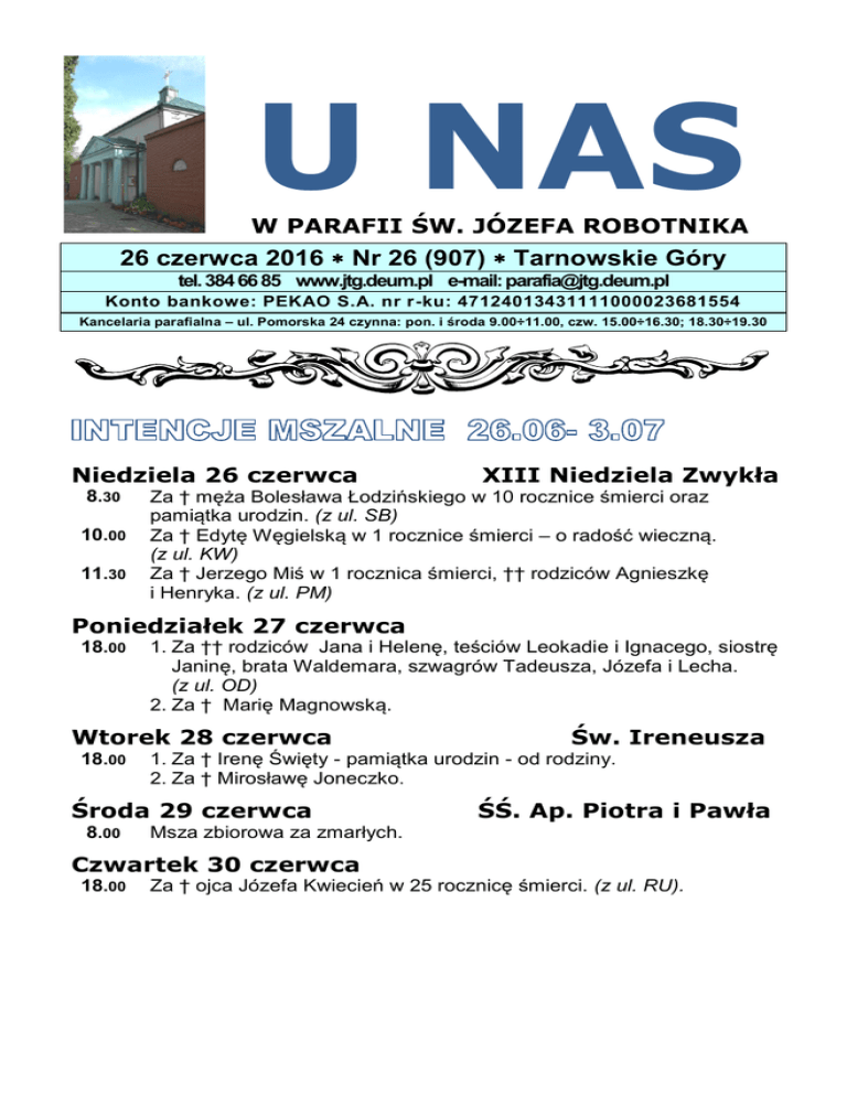 U NAS W PARAFII ŚW. JÓZEFA ROBOTNIKA 26 czerwca 2016 Nr 26 (907) Tarnowskie Góry tel. 384 66 85 www.jtg.deum.pl e-mail: [email protected] Konto bankowe: PEKAO S.A. nr r-ku: 47124013431111000023681554 Kancelaria parafialna – ul. Pomorska 24 czynna: pon. i środa 9.00÷11.00, czw. 15.00÷16.30; 18.30÷19.30 Niedziela 26 czerwca 8.30 10.00 11.30 XIII Niedziela Zwykła Za † męża Bolesława Łodzińskiego w 10 rocznice śmierci oraz pamiątka urodzin. (z ul. SB) Za † Edytę Węgielską w 1 rocznice śmierci – o radość wieczną. (z ul. KW) Za † Jerzego Miś w 1 rocznica śmierci, †† rodziców Agnieszkę i Henryka. (z ul. PM) Poniedziałek 27 czerwca 18.00 1. Za †† rodziców Jana i Helenę, teściów Leokadie i Ignacego, siostrę Janinę, brata Waldemara, szwagrów Tadeusza, Józefa i Lecha. (z ul. OD) 2. Za † Marię Magnowską. Wtorek 28 czerwca 18.00 Środa 29 czerwca 8.00 Św. Ireneusza 1. Za † Irenę Święty - pamiątka urodzin - od rodziny. 2. Za † Mirosławę Joneczko. ŚŚ. Ap. Piotra i Pawła Msza zbiorowa za zmarłych. Czwartek 30 czerwca 18.00 Za † ojca Józefa Kwiecień w 25 rocznicę śmierci. (z ul. RU). Piątek 1 lipca 8.00 18.00 Sobota 2 lipca 8.00 16.30 17.00 10.00 11.30 I sobota miesiąca Msza Rodziny Różańcowej. Adoracja Najświętszego Sakramentu. Za † ks. Czesława - pamiątka urodzin - od rodziny i przyjaciół. Niedziela 3 lipca 8.30 I piątek miesiąca Do Najświętszego Serca Pana Jezusa w intencji czcicieli. Za † Ewę Wilczek w rocznicę śmierci oraz †† z rodziny Wilczek, Ekiert i Boraczyński. XIV Niedziela Zwykła Za † matkę Antoninę Żuber w 19 rocznicę śmierci, † ojca Władysława, † brata Jana, † Dorotę Matonia, †† z rodziny Pawełoszek, Rozwandowicz , Kubiak, Bednarek oraz †† dziadków z obu stron. (z ul. PA) Za † mamę Zofię Załucką i † babcię Kazimierę Mogielnicką - w rocznice śmierci. Za † Andrzeja Bystrzanowskiego, †† Wiktorię, Jerzego Sztaba, †† dziadków z obu stron. (z ul. WE) W pierwszą wakacyjną niedzielę w tekstach biblijnych pojawia się temat powołania. Czy nie stanowi to dla nas wyzwania, że w czasie odpoczynku mamy być świadkami Bożej obecności i działania w świecie? Prośmy o siłę w dawaniu wiarygodnego świadectwa i o to, byśmy w wolnym czasie nie zaniedbywali naszych chrześcijańskich obowiązków. W środę świętować będziemy uroczystość Świętych Apostołów Piotra i Pawła. To dwa filary, na których opiera się cała nasza kościelna wspólnota. Zapraszamy na wspólną modlitwę w intencji całego Kościoła, papież, jako jego widzialnej głowy, a także nas samych, byśmy stawali się apostołami Chrystusa w miejscu naszej pracy, nauki i odpoczynku. Zbierana w tym dniu taca jest przeznaczona na potrzeby Stolicy Świętej. W ostatni dzień czerwca przypadnie czwartek przed pierwszym piątkiem miesiąca. Pierwsze dni lipca to pierwszy piątek i pierwsza sobota miesiąca. W czwartek, podczas ostatniego czerwcowego nabożeństwa, pomodlimy się za wszystkich powołanych do służby Bożej, a także o nowe i święte powołania. W pierwszy piątek od godz.9.00 odwiedzimy starszych i chorych parafian z Komunią Świętą, a po południu zapraszamy na modlitwę adoracyjną. Będzie też możliwość skorzystania z sakramentu pokuty i pojednania. Kolekta dzisiejsza na potrzeby naszej parafii, w następna niedzielę na potrzeby Diecezji i seminarium Duchownego. Bóg Zapłać. ********************************************************************* Zapowiedzi przedślubne: Śliwa Agata z Tarnowskich Gór – Paczyna Kamil z Radzionkowa. Wojtynek Katarzyna z Tarnowskich Gór – Michał Herdzina z Tarnowskich Gór. ********************************************************************* Św. Ireneusz z Lyonu Mesjasz, to znaczy Chrystus, czyli Namaszczony, i Jezus, to znaczy Zbawca, a te dwa imiona są zarazem nazwami różnorodnych czynności dokonywanych na świecie. zajasz w poniższych słowach stwierdza, że Chrystus, który był u Ojca jako Słowo Ojca, miał się wcielić, stać się człowiekiem, narodzić się, być zrodzonym z Dziewicy i żyć wśród ludzi... Oto one: „Dlatego sam Pan da wam znak: «Oto Dziewica pocznie i porodzi Syna i nazwiecie Go Emmanuel: będzie jadł masło i miód»" (Iz 7, 4). Zaznaczył, że narodzi się z Dziewicy, że będzie prawdziwym człowiekiem, jak to wynika ze słowa „jadł" i z tego także, że nazwał Go dzieckiem, a nawet przez to, że Mu nadał imię... Bo ma podwójne imię w języku hebrajskim: Mesjasz, to znaczy Chrystus, czyli Namaszczony, i Jezus, to znaczy Zbawca, a te dwa imiona są zarazem nazwami różnorodnych czynności dokonywanych na świecie. Otrzymał imię Chrystus (namaszczony), bo Ojciec namaścił Go, a przez Niego i z powodu Jego nadejścia ozdobił wszystkie rzeczy... Otrzymał zaś imię Zbawca, ponieważ był przyczyną zbawienia dla tych, którzy od Jego czasów wtedy właśnie byli zbawieni od wszelkiego rodzaju chorób i od śmierci, a dla tych, którzy potem uwierzą, stał się dawcą przyszłego i wiecznego zbawienia. Oto dlatego został nazwany Zbawcą. Jeżeli zaś chodzi o imię Emmanuel, to przełożono je jako „Bóg z nami" albo też jako życzenie wyrażone przez proroka, a odpowiadające słowom: „Bóg niech będzie z wami". Gdy tak tłumaczymy, staje się to objawieniem Dobrej Nowiny, bo „Oto — mówi — Dziewica pocznie i porodzi Syna, a Ten, będąc Bogiem, jest przeznaczony na to, aby być z nami" (Iz 7,14)... Tenże sam prorok mówi: „Syn nam się narodził, chłopiec został nam dany i otrzymał imię Cudowny Doradca, Bóg mocny" (Iz 9,6). Jest nazwany Cudownym Doradcą Ojca, przez co zaznaczono, że z Nim Ojciec uczynił wszystkie rzeczy, jak jest napisane w pierwszej księdze Mojżesza, noszącej tytuł Genesis: „I Bóg rzekł: Uczyńmy człowieka na nasz obraz i podobieństwo" (Rdz l,26). Oczywiście tu Ojciec mówi do Syna — Cudownego Dor