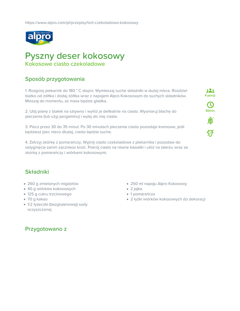 https://www.alpro.com/pl/przepisy/tort-czekoladowo-kokosowy Pyszny deser kokosowy Kokosowe ciasto czekoladowe Sposób przygotowania 1. Rozgrzej piekarnik do 180 ° C stopni. Wymieszaj suche składniki w dużej misce. Rozdziel białko od żółtka i dodaj żółtka wraz z napojem Alpro Kokosowym do suchych składników. Mieszaj do momentu, aż masa będzie gładka. 4 porcji 2. Ubij pianę z białek na sztywno i wyłóż je delikatnie na ciasto. Wysmaruj blachę do pieczenia (lub użyj pergaminu) i wylej do niej ciasto. 3. Piecz przez 30 do 35 minut. Po 30 minutach pieczenia ciasto pozostaje kremowe, jeśli będziesz piec nieco dłużej, ciasto będzie suche. 4. Zetrzyj skórkę z pomarańczy. Wyjmij ciasto czekoladowe z piekarnika i pozostaw do ostygnięcia zanim zaczniesz kroić. Pokrój ciasto na równe kawałki i ułóż na talerzu wraz ze skórką z pomarańczy i wiórkami kokosowymi. Składniki 260 g zmielonych migdałów 40 g wiórków kokosowych 125 g cukru trzcinowego 70 g kakao 1/2 łyżeczki (bezglutenowej) sody oczyszczonej Przygotowano z 250 ml napoju Alpro Kokosowy 2 jajka 1 pomarańcza 2 łyżki wiórków kokosowych do dekoracji 50min. Alpro Kokosowy Oryginalny