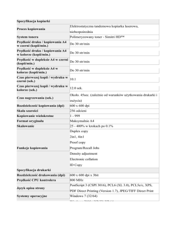 Specyfikacja kopiarki Proces kopiowania System tonera Elektrostatyczna tandemowa kopiarka laserowa, niebezpośrednia Polimeryzowany toner - Simitri HD™ Prędkość druku / kopiowania A4 Do 30 str/min w czerni (kopii/min.) Prędkość druku / kopiowania A4 Do 30 str/min w kolorze (kopii/min.) Prędkość w dupleksie A4 w czerni Do 30 str/min (kopii/min.) Prędkość w dupleksie A4 w kolorze (kopii/min.) Do 30 str/min Czas pierwszej kopii / wydruku w 10.1 czerni (sek.) Czas pierwszej kopii / wydruku w 12.0 sek. kolorze (sek.) Czas nagrzewania (sek.) Około. 45sec. (zależnie od warunków użytkowania drukarki i zużycia) Rozdzielczość kopiowania (dpi) 600 x 600 dpi Skala szarości 256 odcieni Kopiowanie wielokrotne 1 - 999 Format oryginału Maksymalnie A4 Skalowanie 25 - 400% w krokach po 0.1% Duplex copy 2in1, 4in1 Proof copy Funkcje kopiowania Program/Recall Jobs Density adjustment Electronic collation ID Copy Specyfikacja drukarki Rozdzielczość drukowania (dpi) 600 x 600 dpi x 3bit Prędkość CPU kontrolera 800 MHz Język opisu strony Systemy operacyjne PostScript 3 (CSPI 3016), PCL6 (XL 3.0), PCL5e/c, XPS, PDF Direct Printing (Version 1.7), JPEG/TIFF Direct Print Windows 7 (32/64) Windows 2000 / XP 32/ XP 64 Windows DPWS support Macintosh OSX (10.2.8/10.3.9/10.4/10.5) Server 2003 / 2003x64 / 2008 / 2008x64 Linux: Red Hat, Suse Citrix Netware 4 / 5 / 6 Czcionki drukarki 80x PCL Latin 137x PostScript 3 Emulation Latin Bezpośrednie drukowanie PDF (version 1.7), JPEG, TIFF, Funkcje drukowania XPS folie, znaki wodne, n-up, plakaty, booklety, zestawienia Specyfikacja skanera Prędkość skanowania w kolorze (skan./min.) up to 30 opm (300 dpi via DF) Prędkość skanowania w czerni (skan./min.) up to 30 opm (300 dpi via DF) Rozdzielczość skanowania (dpi) Max.: 600 x 600 dpi Network TWAIN scan WIA scan Scan-to-eMail Scan-to-FTP Tryby skanowania Scan-to-SMB Scan-to-HDD Scan-to-WebDAV Scan-to-DPWS Scan-to-USB Formaty plików Miejsca docelowe skanowania Funkcje skanowania JPEG, TIFF, PDF, Compact PDF, XPS Do 2,000 (pojedyńczo), Do to 100 (w grupie), wsparcie dla LDAP Do 400 programowalnych zadań Specyfikacja faksu Standard faksu Super G3 Transmisja faksu Analogue, i-Fax, PC-Fax Rozdzielczość faksu (dpi) 400 x 400 (Super Fine) Kompresja faksu MH, MR, MMR, JBIG Prędkość modemu (Kbps) Do 33.6 Kbps Miejsca docelowe faksowania Do 2,000 (pojedyńczo), Do to 100 (w grupie) Funkcje faksowania Zmiana czasu Przekazywanie faksów Do 400 programowalnych zadań Specyfikacja systemu Standardowa pamięć systemu (MB) 1,500 Standardowy dysk twardy (GB) 120 Standardowe interfejsy 10Base-T/100Base-TX/1000Base-T Ethernet, USB 2.0 Protokoły sieciowe TCP/IP (IPv4 / IPv6), IPX/SPX, AppleTalk (EtherTalk), SMB, LPD, IPP, SNMP, HTTP, HTTPS Ethernet 802.2 Rodzaje ramek Ethernet 802.3 Ethernet II Ethernet SNAP Up to 50 oryginałów Automatyczny podajnik dokumentów A5 - A4, (140 - 216 x 148 - 355.6 mm) 50-128g/m² Rozmiar papieru A6 - A4, Dowolny dobór rozmiarów papieru Gramatura papieru (g/m²) 60-210 g/m² Pojemność papieru (arkusze) Standard:350 arkuszy Maksymalnie.: 1,350 arkuszy Taca 1: 250 arkuszy, A6 - A4, 60 - 210 gsm, tryb niestandardowy (92 - 216 x 148 - 297 mm) Standardowe podajniki papieru Taca 2: opcjonalnie - 500 arkuszy, 60 - 90 gsm, A4 Podajnik ręczny: 100 arkuszy A6 - A4, 60 - 210 gsm, tryb niestandardowy (92 - 216 x 148 - 356 mm) Automatyczny dupleks A4, 60 - 210gsm Pojemność wyjścia (bez finiszerem) Maksymalnie 250 arkuszy - wydrukiem do dołu Rekomendowane obciążenie miesięczne kopii/wydruków 1,920 stron Maksymalne obciążenie miesięczne kopii/wydruków 120,000 stron Wydajność toneru Black do 6.000 stron Wydajność tonerów CMY do 6.000 stron Wydajność sekcji obrazowania Black do 30.000 stron Wydajność sekcji obrazowania CMY do 30.000 stron Pobór energii 220-240 V /50/60Hz,mniej niż 1.3 KW Wymiary systemu (Sz.xGł.xWys., 530 x 508 x 550 mm) Waga systemu (kg) Około 39kg Funkcje systemu ISO15408 EAL3 (w przybliżeniu) Filtrowanie IP filtering i blokowanie portów Komunikacja sieciowa - SSL2, SSL3 i TSL1.0 Wsparcie IPsec Bezpieczeństwo Wsparcie IEEE 802.1x Autoryzacja użytkownika Punkty bezpieczeństwa Nadpisanie twardego dysku (8 typów w standardzie) Szyfrowanie twardego dysku (AES 128) Zabezpieczenie kopii (tylko drukowanie) Do 1000 (Użytkowników + Kont) Konta użytkowników Aktywny katalog, wsparcie dla NTLM V.1, NTLM V.2, NDS, LDAP Definicja funkcji użytkownika PageScope Net Care Device Manger Aplikacje PageScope Data Administrator PageScope Direct Print Uwagi do specyfikacji - Drukarki laserowe Niektóre ilustracje mogą zawierać opcjonalne akcesoria. Podana specyfikacja nie stanowi oferty handlowej w rozumieniu Prawa Handlowego. Konica Minolta zastrzega sobie prawo zmiany tej specyfikacji bez wcześniejszego powiadomienia. W celu uzyskania najświeższych informacji prosimy o kontakt z autoryzowanym przedstawicielem Konica Minolta. Parametry podane dla pojemności papieru odnoszą się do formatu A4 przy gramaturze 80 g/m². Parametry prędkości drukowania zostały podane dla formatu A4, drukowanego jednostronnie, poprzecznie dla zadań wielostronicowych. Konica Minolta może udzielać gwarancji tylko produktom i opcjom oznaczonym własną marką, takim jak rozszerzenia pamięci, twarde dyski, itp. Problemy, jakie mogą wystąpić z opcjami nie pochodzącymi od Konica Minolta, mogą być spowodowane niezgodnością z unikalną budową sprzętową naszych kontrolerów. Opcje do naszych produktów są wybierane po dogłębnym procesie testowania i oceny i z tego powodu możemy gwarantować funkcjonalność tylko tych określonych opcji. Dodanie niektórych opcji, w niektórych konfiguracjach może spowodować, że produkt nie będzie już zgodny. Opublikowanie nowych regulacji prawnych także może spowodować że produkt przestanie być zgodny. Zgodność z Energy Star nie odpowiada warunkom EPA dla jakiegokolwiek produktu i usługi.