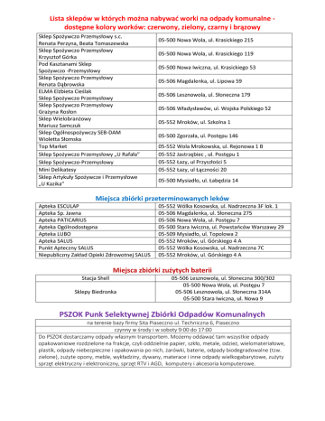 Lista sklepów w których można nabywać worki na odpady komunalne dostępne kolory worków: czerwony, zielony, czarny i brązowy Sklep Spożywczo Przemysłowy s.c. Renata Perzyna, Beata Tomaszewska Sklep Spożywczo Przemysłowy Krzysztof Górka Pod Kasztanami Sklep Spożywczo -Przemysłowy Sklep Spożywczo Przemysłowy Renata Dąbrowska ELMA Elżbieta Cieślak Sklep Spożywczo Przemysłowy Sklep Spożywczo Przemysłowy Grażyna Rosłon Sklep Wielobranżowy Mariusz Samczuk Sklep Ogólnospożywczy SEB-DAM Wioletta Słomska Top Market Sklep Spożywczo Przemysłowy „U Rafała” Sklep Spożywczo-Przemysłowy Mini Delikatesy Sklep Artykuły Spożywcze i Przemysłowe „U Kazika” 05-500 Nowa Wola, ul. Krasickiego 215 05-500 Nowa Wola, ul. Krasickiego 119 05-500 Nowa Iwiczna, ul. Krasickiego 53 05-506 Magdalenka, ul. Lipowa 59 05-506 Lesznowola, ul. Słoneczna 179 05-506 Władysławów, ul. Wojska Polskiego 52 05-552 Mroków, ul. Szkolna 1 05-500 Zgorzała, ul. Postępu 146 05-552 Wola Mrokowska, ul. Rejonowa 1 B 05-552 Jastrzębiec , ul. Postępu 1 05-552 Łazy, ul Przyszłości 5 05-552 Łazy, ul Łączności 20 05-500 Mysiadło, ul. Łabędzia 14 Miejsca zbiórki przeterminowanych leków Apteka ESCULAP Apteka Sp. Jawna Apteka PATICARIUS Apteka Ogólnodostępna Apteka LUBO Apteka SALUS Punkt Apteczny SALUS Niepubliczny Zakład Opieki Zdrowotnej SALUS 05-552 Wólka Kosowska, ul. Nadrzeczna 3F lok. 1 05-506 Magdalenka, ul. Słoneczna 275 05-506 Nowa Wola, ul. Postępu 7 05-500 Stara Iwiczna, ul. Powstańców Warszawy 29 05-509 Mysiadło, ul. Topolowa 2 05-552 Mroków, ul. Górskiego 4 A 05-552 Wólka Kosowska, ul. Nadrzeczna 7C 05-552 Mroków, ul. Górskiego 4 A Miejsca zbiórki zużytych baterii Stacja Shell Sklepy Biedronka 05-506 Lesznowola, ul. Słoneczna 300/302 05-500 Nowa Wola, ul. Postępu 7 05-506 Lesznowola, ul. Słoneczna 314A 05-500 Stara Iwiczna, ul. Nowa 9 PSZOK Punk Selektywnej Zbiórki Odpadów Komunalnych na terenie bazy firmy Sita Piaseczno ul. Techniczna 6, Piaseczno czynny w środy i w soboty 9:00 do 17:00 Do PSZOK dostarczamy odpady własnym transportem. Możemy oddawać tam wszystkie odpady opakowaniowe rozdzielone na frakcje, czyli oddzielnie papier, szkło, metale, odzież, wielomateriałowe, plastik, odpady niebezpieczne i opakowania po nich, żarówki, baterie, odpady biodegradowalne (tzw. zielone), zużyte opony, meble, wykładziny, dywany, materace i inne odpady wielkogabarytowe, zużyty sprzęt elektryczny i elektroniczny, sprzęt RTV i AGD, komputery i akcesoria komputerowe.