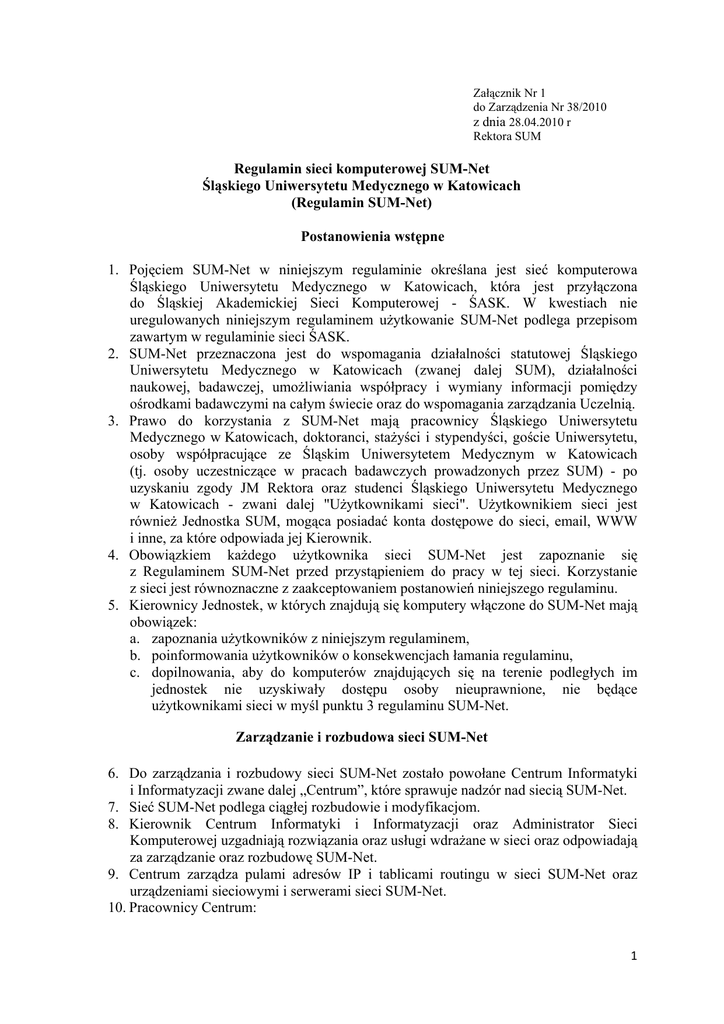 Załącznik Nr 1 do Zarządzenia Nr 38/2010 z dnia 28.04.2010 r Rektora SUM Regulamin sieci komputerowej SUM-Net Śląskiego Uniwersytetu Medycznego w Katowicach (Regulamin SUM-Net) Postanowienia wstępne 1. Pojęciem SUM-Net w niniejszym regulaminie określana jest sieć komputerowa Śląskiego Uniwersytetu Medycznego w Katowicach, która jest przyłączona do Śląskiej Akademickiej Sieci Komputerowej - ŚASK. W kwestiach nie uregulowanych niniejszym regulaminem użytkowanie SUM-Net podlega przepisom zawartym w regulaminie sieci ŚASK. 2. SUM-Net przeznaczona jest do wspomagania działalności statutowej Śląskiego Uniwersytetu Medycznego w Katowicach (zwanej dalej SUM), działalności naukowej, badawczej, umożliwiania współpracy i wymiany informacji pomiędzy ośrodkami badawczymi na całym świecie oraz do wspomagania zarządzania Uczelnią. 3. Prawo do korzystania z SUM-Net mają pracownicy Śląskiego Uniwersytetu Medycznego w Katowicach, doktoranci, stażyści i stypendyści, goście Uniwersytetu, osoby współpracujące ze Śląskim Uniwersytetem Medycznym w Katowicach (tj. osoby uczestniczące w pracach badawczych prowadzonych przez SUM) - po uzyskaniu zgody JM Rektora oraz studenci Śląskiego Uniwersytetu Medycznego w Katowicach - zwani dalej "Użytkownikami sieci". Użytkownikiem sieci jest również Jednostka SUM, mogąca posiadać konta dostępowe do sieci, email, WWW i inne, za które odpowiada jej Kierownik. 4. Obowiązkiem każdego użytkownika sieci SUM-Net jest zapoznanie się z Regulaminem SUM-Net przed przystąpieniem do pracy w tej sieci. Korzystanie z sieci jest równoznaczne z zaakceptowaniem postanowień niniejszego regulaminu. 5. Kierownicy Jednostek, w których znajdują się komputery włączone do SUM-Net mają obowiązek: a. zapoznania użytkowników z niniejszym regulaminem, b. poinformowania użytkowników o konsekwencjach łamania regulaminu, c. dopilnowania, aby do komputerów znajdujących się na terenie podległych im jednostek nie uzyskiwały dostępu osoby nieuprawnione, nie będące użytkownikami sieci w myśl punktu 3 regulaminu SUM-Net. Zarządzanie i rozbudowa sieci SUM-Net 6. Do zarządzania i rozbudowy sieci SUM-Net zostało powołane Centrum Informatyki i Informatyzacji zwane dalej „Centrum”, które sprawuje nadzór nad siecią SUM-Net. 7. Sieć SUM-Net podlega ciągłej rozbudowie i modyfikacjom. 8. Kierownik Centrum Informatyki i Informatyzacji oraz Administrator Sieci Komputerowej uzgadniają rozwiązania oraz usługi wdrażane w sieci oraz odpowiadają za zarządzanie oraz rozbudowę SUM-Net. 9. Centrum zarządza pulami adresów IP i tablicami routingu w sieci SUM-Net oraz urządzeniami sieciowymi i serwerami sieci SUM-Net. 10. Pracownicy Centrum: 1 a) b) c) d) mają obowiązek udostępniać użytkownikom informację o możliwościach wykorzystania dostępnych w sieci systemów komputerowych, mają obowiązek udostępniać użytkownikom informację o ewentualnych problemach związanych z siecią i jej eksploatacją na stronie www SUM w miarę możliwości z kilkudniowym wyprzedzeniem. W nagłych wypadkach informacja może zostać rozsyłana na konta e-mail użytkowników, mają obowiązek zachowania tajemnicy służbowej w odniesieniu do informacji uzyskanych drogą dostępu do zbiorów innych użytkowników sieci w trakcie wykonywania obowiązków służbowych, o ile nie zachodzi zagrożenie bezpieczeństwa systemów lub naruszenia norm prawnych, etycznych, moralnych, mają prawo ograniczyć możliwości wykonywania pewnych operacji (uruchamiania programów, odczytu/zapisu zbiorów danych, nawiązywania połączeń z innymi systemami itd.) przez użytkowników, o ile jest to uzasadnione względami technicznymi, organizacyjnymi, bezpieczeństwa lub prawnymi. Dostęp do sieci SUM-Net 11. Jednostki SUM uzyskują dostęp do sieci SUM-Net poprzez przydzielone im przez Centrum publiczne adresy IP. Centrum prowadzi przydział i rejestruje adresy sieciowe, adresy MAC oraz nazwy wszystkich urządzeń włączanych do sieci SUMNet. 12. Włączenie segmentu sieci lokalnej do szkieletowej sieci SUM-Net następuje za zgodą Kierownika Centrum oraz Administratora Sieci po uprzednim zatwierdzeniu projektu i sprawdzeniu zgodności zastosowanych rozwiązań sieciowych i systemowych. 13. Konfigurację ustawień sieciowych każdego komputera podłączanego do sieci SUMNet wykonuje zawsze pracownik Centrum. 14. Komputery podłączone do sieci SUM-Net powinny być zabezpieczone indywidualnym identyfikatorem (login) i hasłem dla każdego korzystającego z niego użytkownika. 15. W przypadku podłączenia komputera do sieci SUM-Net nie dopuszcza się w tym komputerze możliwości jednoczesnego korzystania z dostępu do sieci Internet w inny sposób (modem xDSL, GPRS, UMTS, WIFI, poprzez operatorów sieci telefonii komórkowej itp.). 16. Włączenie do sieci SUM-Net serwera niezarządzanego przez Centrum, a oferującego jakiekolwiek usługi sieciowe wymaga zgody JM Rektora oraz określenia osoby odpowiedzialnej za działanie i bezpieczeństwo serwera (imię, nazwisko, telefon kontaktowy 24 godziny na dobę), w tym celu należy wypełnić Załącznik nr 1 do niniejszego Regulaminu. 17. Studenci zamieszkali w Domach Studenta SUM uzyskują dostęp do sieci SUM-Net na podstawie wniosku stanowiącego Załącznik nr 7 do Regulaminu. a) Dostęp jest udzielany na okres do zakończenia roku akademickiego b) Konieczne jest podanie adresu sprzętowego karty sieciowej MAC c) Studentowi przydzielany jest automatycznie indywidualny publiczny adres IP 18. W przypadku stwierdzenia samowolnego podłączenia przez Użytkownika osprzętu sieciowego, serwerów lub stwierdzenia zakłóceń pracy SUM-Net spowodowanych zmianami wykonanymi samowolnie przez użytkowników, Administrator SUM-Net w porozumieniu z Kierownikiem Centrum może bez uprzedzenia odłączyć segment sieci SUM-Net do czasu wyjaśnienia zaistniałej sytuacji. 2 19. Odłączenie segmentu sieci bez uprzedze