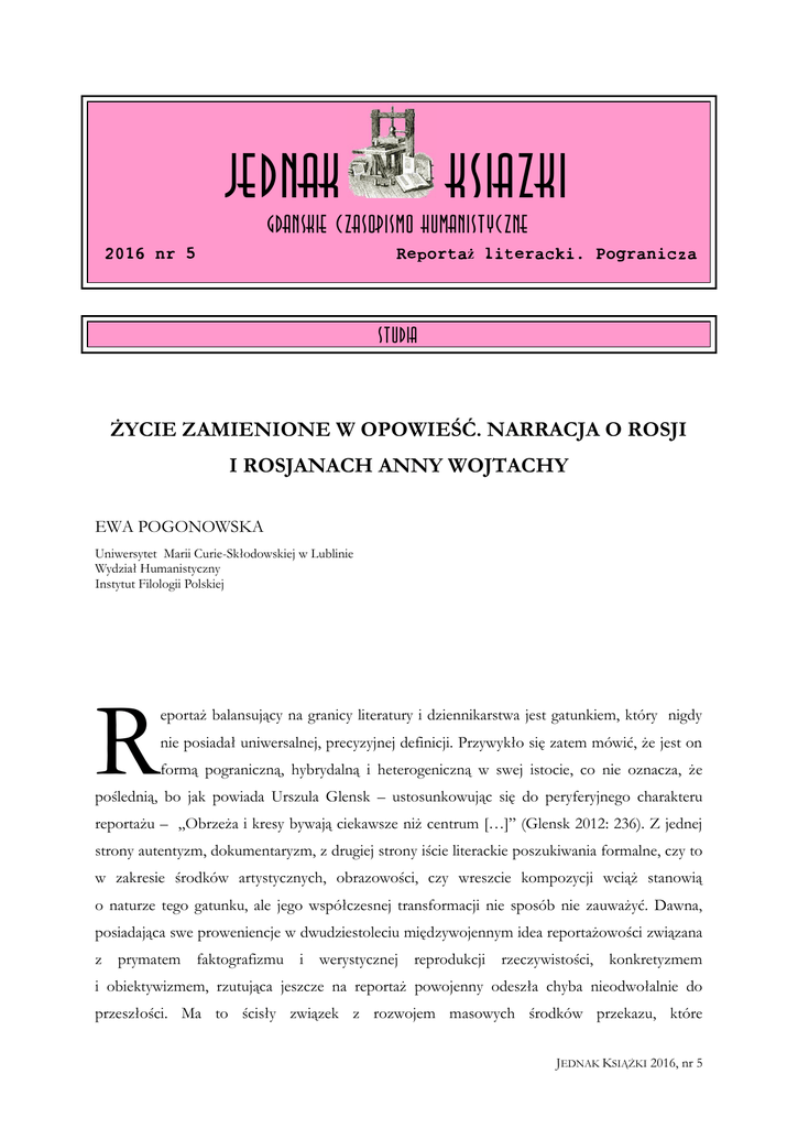 JEDNAK KSIAZKI GDANSKIE CZASOPISMO HUMANISTYCZNE ż STUDIA ŻYCIE ZAMIENIONE W OPOWIEŚĆ. NARRACJA O ROSJI I ROSJANACH ANNY WOJTACHY EWA POGONOWSKA Uniwersytet Marii Curie-Skłodowskiej w Lublinie Wydział Humanistyczny Instytut Filologii Polskiej R eportaż balansujący na granicy literatury i dziennikarstwa jest gatunkiem, który nigdy nie posiadał uniwersalnej, precyzyjnej definicji. Przywykło się zatem mówić, że jest on formą pograniczną, hybrydalną i heterogeniczną w swej istocie, co nie oznacza, że poślednią, bo jak powiada Urszula Glensk – ustosunkowując się do peryferyjnego charakteru reportażu – „Obrzeża i kresy bywają ciekawsze niż centrum […]” (Glensk 2012: 236). Z jednej strony autentyzm, dokumentaryzm, z drugiej strony iście literackie poszukiwania formalne, czy to w zakresie środków artystycznych, obrazowości, czy wreszcie kompozycji wciąż stanowią o naturze tego gatunku, ale jego współczesnej transformacji nie sposób nie zauważyć. Dawna, posiadająca swe proweniencje w dwudziestoleciu międzywojennym idea reportażowości związana z prymatem faktografizmu i werystycznej reprodukcji rzeczywistości, konkretyzmem i obiektywizmem, rzutująca jeszcze na reportaż powojenny odeszła chyba nieodwołalnie do przeszłości. Ma to ścisły związek z rozwojem masowych środków przekazu, które JEDNAK KSIĄŻKI 2016, nr 5 Ewa Pogonowska w okamgnieniu rejestrują i komunikują bieżące wydarzenia, dla form reportażowych pozostawiając to, co przekracza granice zwykłej faktografii i nie wymaga stricte aktualnościowego nastawienia. Ostatecznie reportaż w dużym stopniu – jak pisał Zygmunt Ziątek – wyemancypował się z dziennikarstwa i przesunął w kierunku literatury: Reportaż nie kojarzy się […] dziś ani z koniecznością nadążania za biegiem wydarzeń, ani z demaskatorskim dążeniem do pokazania, jak jest naprawdę, ani z potrzebą docierania do nowych faktów i ich aktualnościową interpretacją. Nie kojarzy się z tymi i innymi atrybutami reportażu – takimi jak postulat zachowania jednostkowego, naturalnego wyglądu „faktu” – które do niedawna zdawały się składać na jego rację istnienia. Reportaż nie może istnieć poza sferą wartości określanych jako literackie i samo to, że – pomimo nich! – może być jeszcze reportażem domaga się jeszcze uzasadnienia. (Ziątek 2013: 422) Zwrot tej formy gatunkowej ku literaturze pięknej nie był jedynym znamieniem jej transfiguracji. Szczególnie istotny okazał się również brak wyraźnej linii demarkacyjnej pomiędzy literaturą faktu a literaturą dokumentu osobistego. Zatem – by ująć to krótko – konwencja reportażu przeobraziła się w zasadniczy sposób, a swoista licentia poetica znajdowała wytłumaczenie w jego niezmiennie aktualnej różnokształtności i wielopostaciowości. Ponadto – jak słusznie konstatował Paweł Zajas – „[z]wrot narratywistyczny uwydatnił konstrukcyjny charakter procesów poznawczych, zapośredniczenie dostępu do nagich faktów i nieuniknioną beletryzację doświadczenia” (Zajas 2011: 13). Reporterzy-pisarze spostrzegli, że życiem rządzi logika opowieści i po to, by objaśnić rzeczywistość należy nadać zdarzeniom kształt fabuły, a „fabuła zawdzięcza swój kształt narracjom przedstawiającym na różne sposoby tę samą «historię»” (zob. Culler 1998: 100). Jedynym bowiem sposobem na okiełznanie strumienia zdarzeń okazało się właśnie znalezienie sensotwórczej historii-opowieści, co zakładało siłą rzeczy proces o charakterze konstrukcyjnym nie reprodukcyjnym (zob. Trzebiński 2002: 17). Przedmiotem mojego zainteresowania jest wydana w 2015 roku książka Anny Wojtachy Zabijemy albo pokochamy ze znamiennym podtytułem Opowieści z Rosji. Wprawdzie autorka nie sygnuje swojej prozy mianem „reportażu”, to jednak uwagi autotematyczne jednoznacznie wskazują na jej reporterski zamysł. Utwór ten stanowi doskonałą egzemplifikację niestabilnej dzisiaj granicy między literaturą faktu, dokumentem osobistym a beletrystyką i wart jest, by pochylić się nad nim w celu opisania jego struktury. Wojtacha to dziennikarka i korespondentka wojenna, związana ze stacjami telewizyjnymi (kolejno: Teleexpress, TVN 24, Polsat News, TVP Info), relacjonująca na gorąco wydarzenia w zapalnych punktach świata. Trzy lata przed Opowieściami z Rosji wydała Kruchy lód. Dziennikarze na wojnie (2012). W książce tej opisała własne JEDNAK KSIĄŻKI 2016, nr 5 Życie zamienione w opowieść. Narracja o Rosji i Rosjanach Anny Wojtachy doświadczenia korespondenta wojennego, rzucając ostre światło na kulisy pracy reporterów. Obie książki, jakkolwiek traktujące o różnych sprawach i podejmujące różne tematy, zbliżone są w poetyce przekazu, naznaczone osobistą, a nawet intymną postawą reportera. Przekaz na temat Rosji ma znaczenie szczególne, wpisuje się bowiem w niekończące się polskie podróżopisarskie próby rozpoznania tego nieodgadnionego państwa1. Staje się on kolejnym przykładem na poszukiwanie właściwej, czy raczej jeszcze jednej z możliwych opowieści o świecie rosyjskim. Wojtacha po trosze idzie śladem poprzedników, po trosze wydeptuje własną ścieżkę. Z jednej strony – niech odniesieniem będą klasycy rosyjskich podróży – jak Mariusz Wilk nastawia się na „przeżywanie” Rosji, zanurza w tutejszą codzienność, z drugiej jak Hugo-Bader traktuje Rosję jako przygodę i jako przestrzeń do spotkania z ludźmi społecznie wykluczonymi. Podmiot relacji podróżniczej w opowieści Wojtachy nie przypomina jednak ani romantycznego podmiotu Wilka, ani oświeconego podmiotu Hugo-Badera, by odwołać się do typologii Anny Horolets. Obca jest jej zarówno figura uczonego i poety/pisarza, jak i niezaangażowanego osobiście dziennikarza -tropiciela (Horolets 2013: 154-174). Wybiera samoswój sposób na spotkanie z sąsiadem ze Wschodu. Reportaż