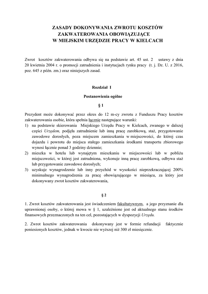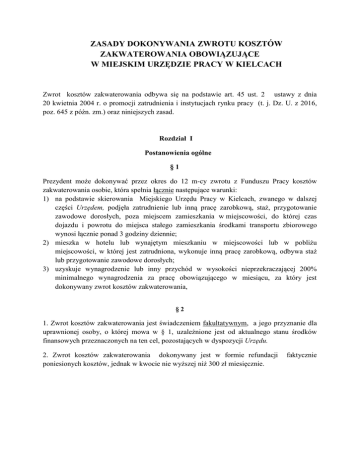 ZASADY DOKONYWANIA ZWROTU KOSZTÓW ZAKWATEROWANIA OBOWIĄZUJĄCE W MIEJSKIM URZĘDZIE PRACY W KIELCACH Zwrot kosztów zakwaterowania odbywa się na podstawie art. 45 ust. 2 ustawy z dnia 20 kwietnia 2004 r. o promocji zatrudnienia i instytucjach rynku pracy (t. j. Dz. U. z 2016, poz. 645 z późn. zm.) oraz niniejszych zasad. Rozdział I Postanowienia ogólne §1 Prezydent może dokonywać przez okres do 12 m-cy zwrotu z Funduszu Pracy kosztów zakwaterowania osobie, która spełnia łącznie następujące warunki: 1) na podstawie skierowania Miejskiego Urzędu Pracy w Kielcach, zwanego w dalszej części Urzędem, podjęła zatrudnienie lub inną pracę zarobkową, staż, przygotowanie zawodowe dorosłych, poza miejscem zamieszkania w miejscowości, do której czas dojazdu i powrotu do miejsca stałego zamieszkania środkami transportu zbiorowego wynosi łącznie ponad 3 godziny dziennie; 2) mieszka w hotelu lub wynajętym mieszkaniu w miejscowości lub w pobliżu miejscowości, w której jest zatrudniona, wykonuje inną pracę zarobkową, odbywa staż lub przygotowanie zawodowe dorosłych; 3) uzyskuje wynagrodzenie lub inny przychód w wysokości nieprzekraczającej 200% minimalnego wynagrodzenia za pracę obowiązującego w miesiącu, za który jest dokonywany zwrot kosztów zakwaterowania, §2 1. Zwrot kosztów zakwaterowania jest świadczeniem fakultatywnym, a jego przyznanie dla uprawnionej osoby, o której mowa w § 1, uzależnione jest od aktualnego stanu środków finansowych przeznaczonych na ten cel, pozostających w dyspozycji Urzędu. 2. Zwrot kosztów zakwaterowania dokonywany jest w formie refundacji poniesionych kosztów, jednak w kwocie nie wyższej niż 300 zł miesięcznie. faktycznie Rozdział II Procedura ubiegania się o zwrot kosztów zakwaterowania i warunki przyznawania zwrotu §3 1. Podstawą ubiegania się o zwrot kosztów zakwaterowania jest złożenie w Urzędzie przez osobę, o której mowa w § 1, zwanej w dalszej części Wnioskodawcą, wniosku o zwrot kosztów zakwaterowania wraz z wymaganymi załącznikami, na aktualnie obowiązującym formularzu, dostępnym na stronie internetowej Urzędu www.mup.kielce.pl w zakładce: Dla bezrobotnych i poszukujących pracy Dokumenty do pobrania lub w Biurze Obsługi Klienta Urzędu. 2. Do wniosku należy załączyć umowę najmu lokalu lub dokument potwierdzający zakwaterowanie w hotelu a w przypadku podjęcia zatrudnienia lub innej pracy zarobkowej, należy również załączyć umowę potwierdzającą podjęcie zatrudnienia lub innej pracy zarobkowej. W/w dokumenty należy przedłożyć w oryginale lub ich kserokopie wraz z oryginałami do wglądu dla pracownika Urzędu przyjmującego dokumenty. 3. O sposobie rozpatrzenia wniosku o zwrot kosztów zakwaterowania, Urząd powiadamia Wnioskodawcę pisemnie, w terminie 30 dni od dnia jego złożenia. 4. Co miesięczny zwrot kosztów zakwaterowania dokonywany jest na podstawie rozliczenia faktycznie poniesionych kosztów. W/w rozliczenie Wnioskodawca winien złożyć w terminie do 15 dnia miesiąca następującego po miesiącu, którego zwrot dotyczy. Przekazanie przez Urząd kwoty stanowiącej w/w zwrot nastąpi do końca miesiąca, w którym rozliczenie zostało złożone. Formularz, na którym należy złożyć rozliczenie, dostępny jest na stronie internetowej Urzędu www.mup.kielce.pl w zakładce: Dla bezrobotnych i poszukujących pracy Dokumenty do pobrania lub w Biurze Obsługi Klienta Urzędu. 5. Do rozliczenia, o którym mowa w punkcie 4, należy załączyć dokumenty potwierdzające: 1) poniesione koszty zakwaterowania, tj., rachunek, fakturę wraz z dowodem zapłaty, potwierdzeniem dokonania przelewu na konto najemcy lub hotelu, 2) zatrudnienie*: zaświadczenie/oświadczenie od pracodawcy, potwierdzające okres zatrudnienia i wysokość uzyskanego wynagrodzenia brutto, 3) wykonywanie innej pracy zarobkowej*: zaświadczenie /oświadczenie od zleceniodawcy potwierdzające okres wykonywania innej pracy zarobkowej i uzyskany z tego tytułu przychód brutto. *nie dotyczy osób, które podjęły staż lub przygotowanie zawodowe dorosłych. 6. Urząd zastrzega sobie możliwość żądania dodatkowych dokumentów niezbędnych do rozpatrzenia wniosku o zwrot kosztów zakwaterowania lub uwzględnienia rozliczenia poniesionych kosztów zakwaterowania w danym miesiącu. §4 1. Zwrot kosztów zakwaterowania dokonywany jest przez Urząd w formie przelewu na rachunek bankowy Wnioskodawcy lub w formie wypłaty gotówkowej w placówce pocztowej wskazanej przez Urząd. 2. W przypadku: rozwiązania, wygaśnięcia stosunku pracy, umowy cywilno-prawnej, na podstawie której podjęto inną pracę zarobkową lub przerwania stażu, przygotowania zawodowego dorosłych, zwrot kosztów zakwaterowania przysługuje do ostatniego dnia trwania stosunku pracy, umowy cywilno-prawnej lub realizacji stażu, przygotowania zawodowego dorosłych włącznie. 3. Zwrot kosztów zakwaterowania, nie zostanie dokonany w przypadku: - niewłaściwego udokumentowania poniesionych kosztów lub braku wymaganych załączników do składanego co miesięcznie rozliczenia, - niezłożenia rozliczenia faktycznie poniesionych kosztów w wymaganym terminie. §5 Niniejsze zasady obowiązują od dnia ………………….