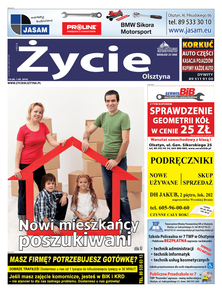 REKLAMA nr 16 (187 ) 2016 ISSN 1734-7076 NOWE Życie REKLAMA (16.08.-1.09. 2016) www.zycieolsztyna.pl REKLAMA NAKŁAD 25 000 Olsztyna REKLAMA 2 “Nowe Życie Olsztyna” nr 16 (187) 2016 z olsztyna Frugo szuka domu Frugo to około 2-letni bardzo stęskniony człowieka kudłacz. Trafił jakiś czas temu do gminnej przechowalni w okolicach Ornety. Zaniedbany i bardzo zapchlony. Frugo jest wyjątkowo towarzyski. Widać, że kontakt z człowiekiem jest dla niego ważny. Kiedy tylko go widzi, głośno szczeka, dając znać o swoim istnieniu. Na spacerach Frugo jest zadowolony, dosłownie z uśmiechem na pyszczku mknie szalenie przed siebie. Widać, że nie miał wcześniej styczności ze smyczą i obrożą, wiec pewnie był psem podwórkowym, pozostawionym samemu sobie. Mały ma w planach wizytę u psiego fryzjera. Psiak przebywa w kojcu sam, więc na razie stosunek do innych psów nie jest znany, ale mijając inne kojce z czwaronogami, nie wykazywał agresji. Warunkiem adopcji Fruga jest wizyta przed- lub poadopcyjna i podpisanie umowy adopcyjnej. Wolontariusze mogą pomóc w transporcie pieska do dobrego domu. Więcej informacji o Frugo pod numerem telefonu 794 304 181. Batalia o dojazd do obwodnicy Budowana obecnie obwodnica Olsztyna będzie miała na trasie pięć węzłów drogowych: w rejonie Dajtek, Dorotowa, Jarot, Pieczewa i Wójtowej Roli. Najwięcej emocji budzi budowa węzła Pieczewo. Kierowcy mają dojechać do tego miejsca nową trasą ul. Pstrowskiego. A wykonanie tego odcinka przez wiele miesięcy nie było takie oczywiste. Zaczęło się od tego, że olsztyński oddział Generalnej Dyrekcji Dróg Krajowych i Autostrad uznał, że miasto nie jest gotowe do skomunikowania z węzłem Pieczewo, bo nie przygotowało na czas odpowiedniej dokumentacji. Po wielu przepychankach Ministerstwo Infrastruktury i Budownictwa, któremu podlega GDDKiA, zdecydowało, że węzeł zostanie wybudowany, pod warunkiem że miasto znajdzie dofinansowanie na budowę dojazdu ulicą Pstrowskiego. To się udało, ale nie zakończyło sprawy. Teraz okazuje się, że resort nie da pieniędzy na ponadstumetrowy odcinek nowej drogi między granicami administracyjnymi miasta a zjazdem z węzła Pieczewo. W tej sytuacji inicjatywę przejął ratusz. Prezydent Piotr Grzymowicz zorganizował spotkanie z udziałem m.in. władz samorządu województwa. – Zdecydowaliśmy o podpisaniu umowy, która zakłada, że budowę spornego odcinka sfinansuje marszałek województwa – mówi prezydent Olsztyna. – To powinno usunąć wszystkie przeszkody stojące na drodze budowy węzła Pieczewo i umożliwi podpisanie umowy na dofinansowanie nowego przebiegu ul. Pstrowskiego, która z nim się połączy – sądzi Piotr Grzymowicz. Wybudzono pacjenta ze śpiączki Sukces pionierskiej operacji w Uniwersyteckim Szpitalu Klinicznym w Olsztynie. Pacjent, któremu dwa tygodnie wcześniej wszczepiono stymulator, wybudził się ze śpiączki. Jest z nim kontakt. Rozumie, co się do niego mówi i odpowiada. Leczo- ny w ten sposób jest 35-letni mężczyzna. Stan innego pacjenta, 38-letniego dziennikarza PAP Mariusza Wachowicza, który był również operowany dwa tygodnie temu, także się poprawił. Mariusz zapadł w śpiączkę po wypadku na rowerze. Jak informują lekarze, pacjent wita się, podaje rękę, uśmiecha, obsługuje tablet. To jednak nie koniec. U wszystkich osób, którym wszczepiono stymulatory, rodziny i lekarze zauważają poprawę. Pierwsze operacje wszczepienia stymulatorów osobom w śpiączce przeprowadził w maju w olsztyńskim szpitalu klinicznym zespół prof. Wojciecha Maksymowicza pod kierunkiem japońskiego neurochirurga prof. Isao Morita. Lekarz ten przeprowadził w Japonii ok. 300 tego rodzaju operacji. Będzie prawdziwy kemping Urzędnicy wybrali najemcę, który urządzi kemping w jednym z najbardziej atrakcyjnych miejsc w Olsztynie – nad jeziorem Ukiel. Firma, która wygrała przetarg, ma teraz trzy lata na zagospodarowanie terenu. Brak kempingu z prawdziwego zdarzenia to jedna z turystycznych bolączek stolicy regionu. Ostatnie takie miejsce funkcjonowało na Dajtkach w latach 90. Odczuwają to szczególnie turyści podróżujący popularnymi kamperami. Ich kierowcy, zamiast parkować i wypoczywać w przeznaczonych do tego atrakcyjnych miejscach, muszą się zatrzymywać na parkingach. Na początku roku miasto ogłosiło konkurs na wybór najemcy, który podejmie się urządzenia w Olsztynie porządnego kempingu. Teren, który został na to przeznaczony, jest bardzo dogodny – to aż 50 tys. mkw. przy Słonecznej Polanie leżącej nad jeziorem Ukiel. Zgodnie z ustaleniami, ma tam powstać 60 pokoi gościnnych w domkach kempingowych lub szeregowych oraz 30 stanowisk dla wozów kempingowych. Do tego naturalnie pole namiotowe. Wiadomo, że budynki mają być postawione co najmniej 70 m od jeziora, a parking pomieścić ma minimum 60 samochodów. Będą także sanitariaty, kuchnia, sklep spożywczy, świetlica, sauna, pralnia i miejsca na odpady. Najemca został wybrany. To warszawska spółka, w której udziały mają też olsztyńscy przedsiębiorcy. To Vega Consultingm, która w Olsztynie kupiła m.in. hotel Gromada. Umowa dzierżawy została podpisana na 20 lat, a najemca z tego tytułu będzie płacił miesięcznie 2 tys. zł netto. Najemca ma trzy lata na postawienie kempingu, a prace mają się rozpocząć w ciągu roku. red. NOWE Życie Wydawca: Agencja Reklamowo-Wydawnicza INNA PERSPEKTYWA” Paweł Lik, “ redaktor naczelny: Leszek Lik, [email protected]; redaktor wydania bezpłatnego: Paweł Lik, dziennikarze: Andrzej Zb. Brzozowski, Cezary Kapłon, Jacek Panas, Jerzy Pantak, Mirosław Rogalski, Olga Ropiak, Mariusz Wadas; rysunki: Zbigniew Piszczako; okładka: photos.com; Biuro promocji i reklamy: tel. 505 129 273; (r) – materiał reklamowy lub powierzony, ar- archiwum redakcji. Redakcja nie odpowiada za treœæ i formê powierzonych materia³ów, zastrzega sobie prawo adiustacji 