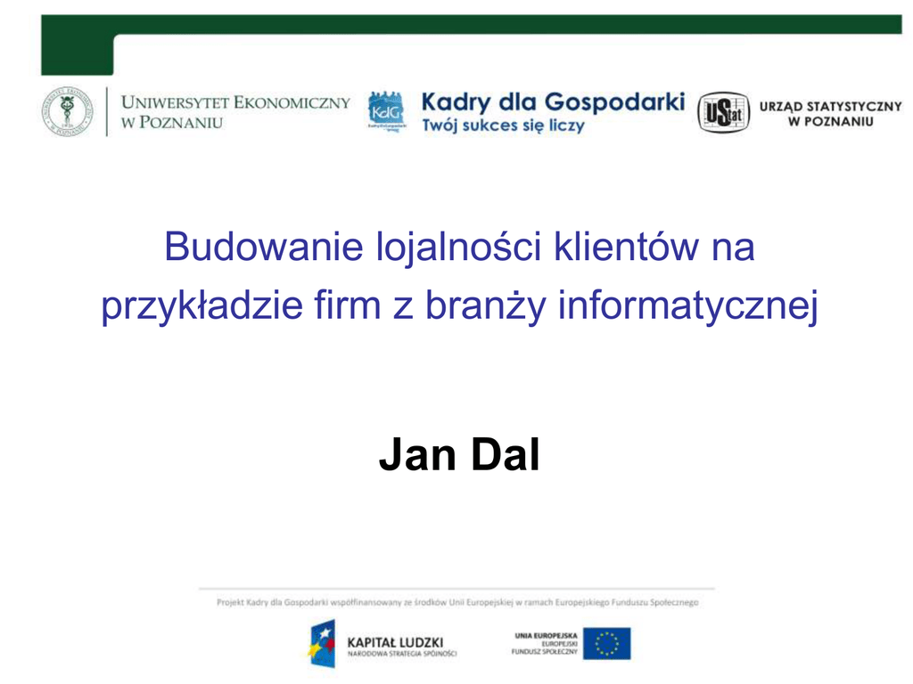 Budowanie lojalności klientów na przykładzie firm z branży informatycznej Jan Dal Zamiast wstępu – dylematy lojalności w świecie ponowoczesnym. Człowiek wobec siebie Człowiek a społeczeństwo (naród) Człowiek a państwo Państwo a społeczeństwo Człowiek a przedsiębiorstwo Przedsiębiorstwo a państwo Sieć powiązań społecznych Państwo Społecze ństwo Człowiek Firma Czym jest lojalność? Lojalność – dobrowolne przywiązanie bazujące na uczuciu. Dobrowolność Lojalność Rozum Serce Przymus Człowiek wobec siebie Potrzeby egzystencjalne (pokarm, dom) Potrzeby wyższego rzędu (książka, film) Człowiek a społeczeństwo kultura historia etyka wartości Państwo a społeczeństwo bezpieczeństwo (w tym socjalne) obrona rozwój („piramida”) suwerenność „Państwo dla społeczeństwa!” Państwo a człowiek wykształcenie praca zdrowie Firma a państwo zachęta podatki miejsca pracy Zagrożenia globalizacji Państwo a organizacje ponadnarodowe (UE) Państwo a globalne korporacje Ochrona narodowego majątku i dóbr naturalnych Firma a lojalność firma a otoczenie granice wzrostu egzystencja = lojalny klient Firma i jej otoczenie ludzie Partnerzy Klienci Firma ludzie Członkowie grupy Granice wzrostu • Granice zasobów naturalnych • Granice ludnościowe • Granice terytorialne • Granice interesów • Granice finansowe FIRMA … i dlatego – lojalność Definicje lojalności Lojalność – dobrowolne przywiązanie bazujące na uczuciach. Lojalność klienta - oznacza: poczucie więzi (w tym również emocjonalnej), przywiązanie do firmy lub „darzenie uczuciem” osób w niej pracujących czy też produktów przez nią oferowanych. Lojalność pracownika - oznacza: dobrowolną, długotrwałą wierność duże zaangażowanie, radość z wykonywanej pracy ambicję i przedsiębiorczość identyfikację i emocjonalną więź aktywną ustną promocję firmy. Rodzaje lojalności a firma Rodzaje lojalności z punktu widzenia firmy: Lojalność wewnętrzna Lojalność pracowników Lojalność członków konsorcjum Lojalność zewnętrzna Lojalność partnerów Lojalność klientów Lojalność wewnętrzna Budowa lojalności pracowników Ewolucja modeli lojalności pracownika Lojalność tradycyjna Lojalność organiczna Lojalność współczesna Tradycyjny model lojalności Bazował na stabilnym, statycznym modelu produkcji, zarządzania, trwałym w dłuższym okresie czasu. Klasycznym przykładem jest zawód górnika na Górnym Śląsku – przechodzący z ojca na syna i wnuka, pracujących razem w jednym zakładzie, posiadający określony etos, związanych z danym zakładem (kopalnią) przez pokolenia, utrwalający lojalność wobec zakładu, środowiska, pracy. Lojalność wobec zakładu była przekazywana pokoleniowo, stanowiła stabilny i przewidywalny sposób na życie. Wiązała pracownika z danym zakładem (a co najmniej zawodem) na całe dorosłe życie. Model ten ewoluował w kierunku modelu pośredniego – organicznego. Organiczny model lojalności Lata 90-te w Polsce przyniosły załamanie modelu tradycyjnego. Upadały stare, powstawały nowe firmy. Praca w rozwijającej się firmie, powoduje organiczne niejako „wrastanie” pracownika w teraźniejszość i przyszłość firmy. Powoduje to utożsamianie się pracownika z firmą, z jej sukcesami, rodzi poczucie współtworzenia tych sukcesów, odpowiedzialność i dumę za osiągnięcia. Rodzi też szczególne więzi międzyludzkie – zarówno w ramach zespołu pracowniczego, jak na linii przełożony – podwładny – wzajemną lojalność i zaufanie. Model lojalności współczesnej • Świadomość terminalności każdego kontraktu Wysokie prawdopodobieństwo krótkotrwałości zatrudnienia w danej firmie • model pracy – model lojalności –modelu zawodniczy • MODEL ZAWODNICZY - charakteryzuje się efektywnością i lojalnością wobec pracodawcy w okresie trwania kontraktu, zawartego na określonych warunkach płacowych Rekrutacyjne działania lojalnościowe Sponsoring Olimpiady Informatycznej Staże i praktyki dla studentów i absolwentów pozwalające odbyć staż w renomowanej firmie poznać najnowsze technologie współpracować z doświadczonymi specjalistami spróbować pracy w dużej korporacji Proces rekrutacyjny Etap I – analiza aplikacji Etap II – rozmowa kwalifikacyjna Etap III – rozmowa decydująca Podstawowe działania lojalnościowe wobec pracowników abonament medyczny - czyli prywatna opieka medyczna rekreacja sportowa – np. karty Benefit refundacja szkoleń i kursów językowych pomoc w kształceniu (np. studia podyplomowe) ubezpieczenia grupowe spotkania szkoleniowe fundusz pożyczkowy dla pracowników • spotkania integracyjne • spotkania Wigilijne • upominki dla najdłużej pracujących pracowników firmy Dalsze działania lojalnościowe wobec pracowników i ich rodzin biuletyn firmowy życzenia świąteczne od Prezesa firmy (e-mail) życzenia urodzinowe dla pracownika (e-mail) możliwość prowadzenia prywatnych rozmów telefonicznych z komórek służbowych po obniżonych stawkach możliwość wykupienia abonamentowej opieki medycznej dla członków rodzin możliwość ubezpieczenia członków rodzin Dzień Dziecka Świadczenia dla pracownika DAWNIEJ DZIŚ • Kasa zapomogowo-pożyczkowa • Fundusz pożyczkowy • Fundusz remontowo- • Abonament medyczny mieszkaniowy • Spotkania integracyjne • Ośrodek zdrowia • Spotkania wigilijne • Ośrodek wczasowy • Ubezpieczenia grupowe • Wycieczki („grzyby”) • Dofinansowanie przedszkoli • Przedszkole • Upominki dla najdłużej pracujących • „Jubileuszówka” • Dopłaty do wypoczynku • „Wysługa” • „Dzień Dziecka” • Deputat • Karty Benefit (rekreacja) • „Wczasy pod gruszą” • Refundacja szkoleń i kursów • „Mikołaj” • Rekreacja • Programy emerytalne • kształcenie • Pakiet akcji firmy Elastyczny czas pracy Korzyści z pozapłaco