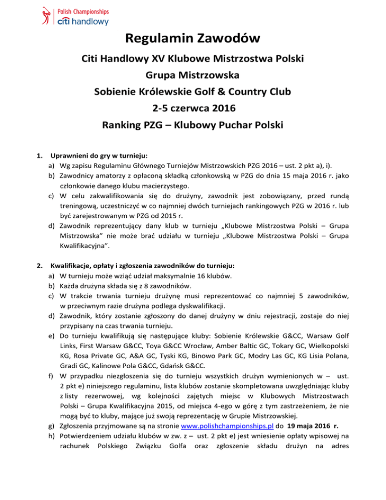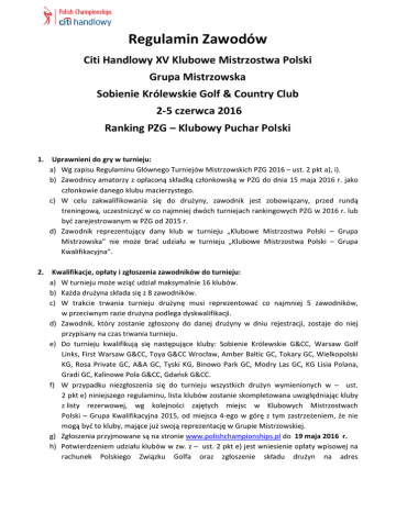 Regulamin Zawodów Citi Handlowy XV Klubowe Mistrzostwa Polski Grupa Mistrzowska Sobienie Królewskie Golf & Country Club 2-5 czerwca 2016 Ranking PZG – Klubowy Puchar Polski 1. Uprawnieni do gry w turnieju: a) Wg zapisu Regulaminu Głównego Turniejów Mistrzowskich PZG 2016 – ust. 2 pkt a), i). b) Zawodnicy amatorzy z opłaconą składką członkowską w PZG do dnia 15 maja 2016 r. jako członkowie danego klubu macierzystego. c) W celu zakwalifikowania się do drużyny, zawodnik jest zobowiązany, przed rundą treningową, uczestniczyć w co najmniej dwóch turniejach rankingowych PZG w 2016 r. lub być zarejestrowanym w PZG od 2015 r. d) Zawodnik reprezentujący dany klub w turnieju „Klubowe Mistrzostwa Polski – Grupa Mistrzowska” nie może brać udziału w turnieju „Klubowe Mistrzostwa Polski – Grupa Kwalifikacyjna”. 2. Kwalifikacje, opłaty i zgłoszenia zawodników do turnieju: a) W turnieju może wziąć udział maksymalnie 16 klubów. b) Każda drużyna składa się z 8 zawodników. c) W trakcie trwania turnieju drużynę musi reprezentować co najmniej 5 zawodników, w przeciwnym razie drużyna podlega dyskwalifikacji. d) Zawodnik, który zostanie zgłoszony do danej drużyny w dniu rejestracji, zostaje do niej przypisany na czas trwania turnieju. e) Do turnieju kwalifikują się następujące kluby: Sobienie Królewskie G&CC, Warsaw Golf Links, First Warsaw G&CC, Toya G&CC Wrocław, Amber Baltic GC, Tokary GC, Wielkopolski KG, Rosa Private GC, A&A GC, Tyski KG, Binowo Park GC, Modry Las GC, KG Lisia Polana, Gradi GC, Kalinowe Pola G&CC, Gdańsk G&CC. f) W przypadku niezgłoszenia się do turnieju wszystkich drużyn wymienionych w – ust. 2 pkt e) niniejszego regulaminu, lista klubów zostanie skompletowana uwzględniając kluby z listy rezerwowej, wg kolejności zajętych miejsc w Klubowych Mistrzostwach Polski – Grupa Kwalifikacyjna 2015, od miejsca 4-ego w górę z tym zastrzeżeniem, że nie mogą być to kluby, mające już swoją reprezentację w Grupie Mistrzowskiej. g) Zgłoszenia przyjmowane są na stronie www.polishchampionships.pl do 19 maja 2016 r. h) Potwierdzeniem udziału klubów w zw. z – ust. 2 pkt e) jest wniesienie opłaty wpisowej na rachunek Polskiego Związku Golfa oraz zgłoszenie składu drużyn na adres [email protected] do 19 maja 2016 r. Kapitan drużyny ma prawo do zmiany 2 osób ze zgłoszonego składu drużyny, do godz. 15:00 dnia treningowego. i) Opłata wpisowa za drużynę wynosi 3360 zł. j) Rachunek wpłat: Nazwa rachunku: Polskie Związek Golfa Al. Jerozolimskie 65/79 00-697 Warszawa Bank: PKO S.A. Nr rachunku: IBAN - PL31 1240 1066 1111 0010 3000 0684 SWIFT - PKOPPLPW Opis wpłaty: „Nazwa Klubu” – opłata wpisowa za Klubowe Mistrzostwa Polski Grupa Mistrzowska k) Lista zakwalifikowanych klubów ogłoszona będzie na stronie www.polishchampionships.pl na 3 dni przed datą rozpoczęcia turnieju. 3. Kapitan drużyny: a) Funkcję tą może pełnić wyłącznie członek danego klubu lub członek PGA Polska. b) Każdego dnia wyznacza skład 7-osobowej drużyny. c) Decyduje o kolejności startu poszczególnych zawodników w grze pojedynczej oraz o składach drużyn w grze podwójnej II, III i IV dnia turnieju. Kapitan drużyny zobowiązany jest przekazać do Biura Zawodów, nie dłużej niż 30 min od ogłoszenia wyników, zaklejonej koperty zawierającej kolejność startów zawodników w meczach pojedynczych i skład drużyn podwójnych w następnym dniu turniejowym. d) Wyznacza osoby, które będą reprezentować drużynę w przypadku rozgrywania dogrywki. 4. Format turnieju; tees, klasyfikacje: a) Turniej 4-dniowy: Kolejność listy startowej na dzień 1 jest tworzona według zajętych miejsc w roku 2015. Znajdować się na niej będzie nazwa klubu a Kapitan drużyny do godz. 15:00 1 czerwca 2016 r. musi zdecydować o kolejności startów zawodników. Jeżeli kapitan do wyznaczonej godziny nie przekaże listy startowej to zawodnicy będą ustawieni automatycznie według Handicapu od najniższego do najwyższego. dzień 1 – stroke play brutto. Każda drużyna może wystawić do gry maksymalnie 7 zawodników. Do łącznego wyniku drużyny zalicza się sumę 5-ciu najlepszych wyników indywidualnych stroke play brutto. Na podstawie łącznego wyniku, drużyny zostaną podzielone na 2 grupy po 8 drużyn wg kolejności zajętych miejsc. W przypadku remisów o wyższym miejscu drużyny decyduje procedura opisana w Regulaminie Głównym Turniejów Mistrzowskich PZG 2016 – ust. 13 pkt d). W poszczególnych grupach drużyny grają o miejsca 1–8, 9-16. dzień 2 – match play brutto w grupach według schematu znajdującego się w załączniku nr 1. Każdy mecz składa się z jednego pojedynku foursome match play, jednego Citi Handlowy XV Klubowe Mistrzostwa Polski, Grupa Mistrzowska, Sobienie Królewskie Golf & Country Club, 2-5 czerwca 2016 2 pojedynku fourball match play, oraz z trzech pojedynków indywidualnych single match play. W razie braku rozstrzygnięcia pojedynku po rozegraniu 18 dołków zostaje wpisany wynik 0,5 punktu dla każdej z drużyn. W przypadku uzyskania przez drużyny jednakowej liczby punktów zostanie rozegrana dogrywka. Kapitanowie drużyn wyznaczają 2 osoby, które będą reprezentować drużynę w formacie foursome match play, w systemie „nagłej śmierci” na dołkach wyznaczonych przez Komitet Turnieju. Jeżeli wynik meczu jest już przesądzony, pozostali gracze z tych drużyn muszą przerwać grę i niezwłocznie opuścić pole. Uwaga: Nie będzie możliwe rozgrywanie meczów pojedynczych i podwójnych przez tych samych zawodników. dzień 3 – match play brutto w grupach według schematu znajdującego się w załączniku nr 1. Wszystkie pojedynki rozgrywane są w takim samym formacie jak w dniu 2. dzień 4 – match play brutto w grupach według schematu znajdującego się w załączniku nr 1. Wszystkie pojedynki rozgrywane są w takim samym formacie jak w dniu 2. b) Wynik każdego zako