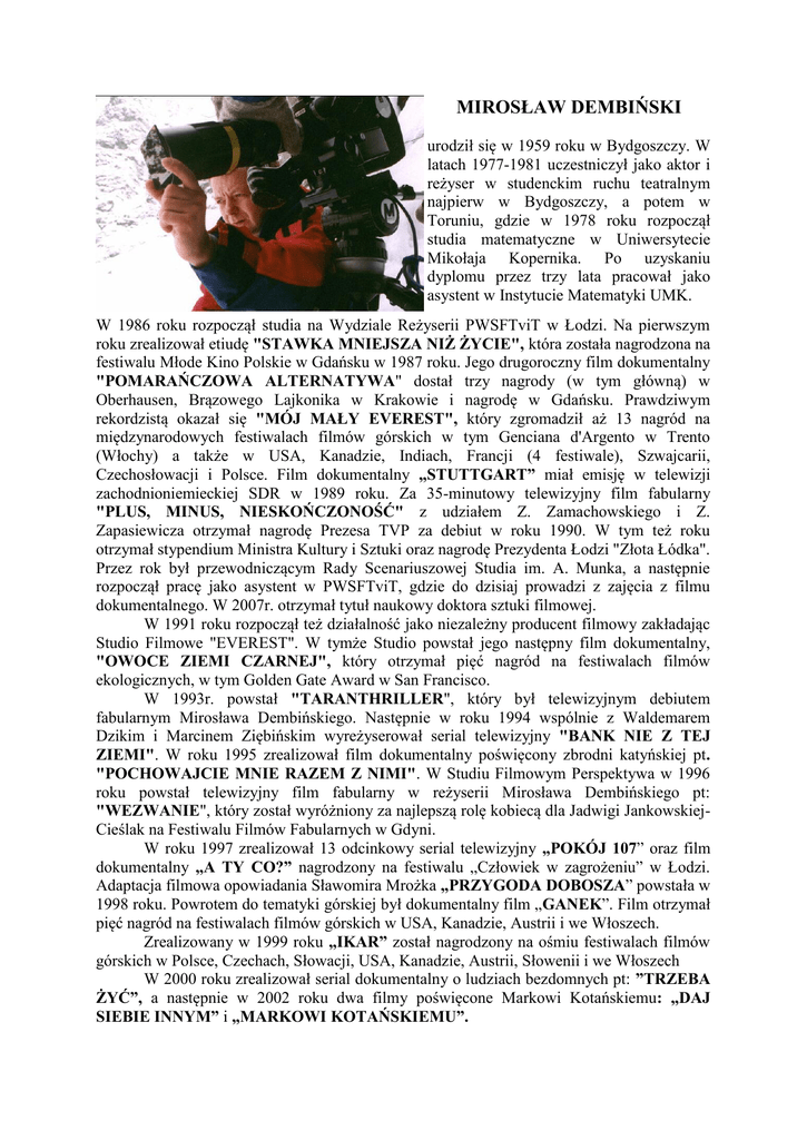 MIROSŁAW DEMBIŃSKI urodził się w 1959 roku w Bydgoszczy. W latach 1977-1981 uczestniczył jako aktor i reżyser w studenckim ruchu teatralnym najpierw w Bydgoszczy, a potem w Toruniu, gdzie w 1978 roku rozpoczął studia matematyczne w Uniwersytecie Mikołaja Kopernika. Po uzyskaniu dyplomu przez trzy lata pracował jako asystent w Instytucie Matematyki UMK. W 1986 roku rozpoczął studia na Wydziale Reżyserii PWSFTviT w Łodzi. Na pierwszym roku zrealizował etiudę "STAWKA MNIEJSZA NIŻ ŻYCIE", która została nagrodzona na festiwalu Młode Kino Polskie w Gdańsku w 1987 roku. Jego drugoroczny film dokumentalny "POMARAŃCZOWA ALTERNATYWA" dostał trzy nagrody (w tym główną) w Oberhausen, Brązowego Lajkonika w Krakowie i nagrodę w Gdańsku. Prawdziwym rekordzistą okazał się "MÓJ MAŁY EVEREST", który zgromadził aż 13 nagród na międzynarodowych festiwalach filmów górskich w tym Genciana d'Argento w Trento (Włochy) a także w USA, Kanadzie, Indiach, Francji (4 festiwale), Szwajcarii, Czechosłowacji i Polsce. Film dokumentalny „STUTTGART” miał emisję w telewizji zachodnioniemieckiej SDR w 1989 roku. Za 35-minutowy telewizyjny film fabularny "PLUS, MINUS, NIESKOŃCZONOŚĆ" z udziałem Z. Zamachowskiego i Z. Zapasiewicza otrzymał nagrodę Prezesa TVP za debiut w roku 1990. W tym też roku otrzymał stypendium Ministra Kultury i Sztuki oraz nagrodę Prezydenta Łodzi "Złota Łódka". Przez rok był przewodniczącym Rady Scenariuszowej Studia im. A. Munka, a następnie rozpoczął pracę jako asystent w PWSFTviT, gdzie do dzisiaj prowadzi z zajęcia z filmu dokumentalnego. W 2007r. otrzymał tytuł naukowy doktora sztuki filmowej. W 1991 roku rozpoczął też działalność jako niezależny producent filmowy zakładając Studio Filmowe "EVEREST". W tymże Studio powstał jego następny film dokumentalny, "OWOCE ZIEMI CZARNEJ", który otrzymał pięć nagród na festiwalach filmów ekologicznych, w tym Golden Gate Award w San Francisco. W 1993r. powstał "TARANTHRILLER", który był telewizyjnym debiutem fabularnym Mirosława Dembińskiego. Następnie w roku 1994 wspólnie z Waldemarem Dzikim i Marcinem Ziębińskim wyreżyserował serial telewizyjny "BANK NIE Z TEJ ZIEMI". W roku 1995 zrealizował film dokumentalny poświęcony zbrodni katyńskiej pt. "POCHOWAJCIE MNIE RAZEM Z NIMI". W Studiu Filmowym Perspektywa w 1996 roku powstał telewizyjny film fabularny w reżyserii Mirosława Dembińskiego pt: "WEZWANIE", który został wyróżniony za najlepszą rolę kobiecą dla Jadwigi JankowskiejCieślak na Festiwalu Filmów Fabularnych w Gdyni. W roku 1997 zrealizował 13 odcinkowy serial telewizyjny „POKÓJ 107” oraz film dokumentalny „A TY CO?” nagrodzony na festiwalu „Człowiek w zagrożeniu” w Łodzi. Adaptacja filmowa opowiadania Sławomira Mrożka „PRZYGODA DOBOSZA” powstała w 1998 roku. Powrotem do tematyki górskiej był dokumentalny film „GANEK”. Film otrzymał pięć nagród na festiwalach filmów górskich w USA, Kanadzie, Austrii i we Włoszech. Zrealizowany w 1999 roku „IKAR” został nagrodzony na ośmiu festiwalach filmów górskich w Polsce, Czechach, Słowacji, USA, Kanadzie, Austrii, Słowenii i we Włoszech W 2000 roku zrealizował serial dokumentalny o ludziach bezdomnych pt: ”TRZEBA ŻYĆ”, a następnie w 2002 roku dwa filmy poświęcone Markowi Kotańskiemu: „DAJ SIEBIE INNYM” i „MARKOWI KOTAŃSKIEMU”. Zrealizowany w 2003 roku film „WSPÓLNY LOT” o sparaliżowanym paralotniarzu wracającym do swojej pasji, otrzymał siedem nagród na festiwalach filmów górskich w Polsce, Bułgarii, Słowacji, Kanadzie, Indiach i we Włoszech. Powrotem do tematyki rozpoczętej w „Pomarańczowej Alternatywie” była w 2003 roku realizacja filmu „KRASNOLUDEK PREZYDENTEM”. Film dokumentalny i serial „ZWYCIĘZCY I PRZEGRANI” przedstawiał bohaterów z czterech kontynentów uczestniczących w Mistrzostwach Świata w Piłce Nożnej Bezdomnych. Film zdobył: „Białą Kobrę” - Grand Prix na Festiwalu „Człowiek w Zagrożeniu”, „Złotą Rybę” - Grand Prix na Festiwalu Filmów Optymistycznych we Wrocławiu, „Jańcia Wodnika” – nagrodę dla najlepszego filmu dokumentalnego na „Prowincjonaliach” we Wrześni, a także nagrodę na Festiwalu Filmów Sportowych w Mediolanie. Zamknięciem tryptyku o paralotniarzach był zrealizowany w 2005 roku „PRASZCZUR”, który jak poprzednie zdobył osiem nagród na festiwalach filmów górskich Polsce, Anglii, Bułgarii, Kanadzie, Słowenii i Francji. Zrealizowany w 2005 roku film „KRASNOLUDKI JADĄ NA UKRAINĘ” opowiadający o Pomarańczowej Rewolucji na Ukrainie otrzymał nagrodę publiczności na festiwalu „NURT” w Kielcach. W 2006 roku Mirosław Dembiński zrealizował film „LEKCJA BIAŁORUSKIEGO”, który opowiada o walce młodych Białorusinów o demokrację w ich kraju. W ciągu dwunastu miesięcy od ukończenia film otrzymał 16 nagród na festiwalach filmowych, wśród nich nagrodę dla najlepszego filmu z Europy Wschodniej na 49 Festiwalu Filmów Dokumentalnych w Lipsku, nagrodę „Movie Squad” na IDFA w Amsterdamie - największym i najbardziej prestiżowym festiwalu dokumentalnym na świecie, nagrodę Vaclava Havla na festiwalu One World w Pradze, a także Nagrodę Specjalną Telewizji ARTE na Międzynarodowym Festiwalu Twórczości Telewizyjnej „Prix Visionica” we Wrocławiu i Nagrodę Specjalną „Prix Europa” w kategorii dokumentu telewizyjnego na Międzynarodowym Festiwalu Filmowym „Prix Europa” w Berlinie. Była to 77 nagroda za twórczość filmową Mirosława Dembińskiego. Najnowszym projektem, którego realizacja właśnie dobiegła końca jest dokument pt. „MUZYCZNA PARTYZANTKA” o młodych, białoruskich zespołach rockowych, które są przeciwne reżimowi prezydenta Łukaszenki. Swoją postawę do otaczającej ich rzeczywistości wyrażają poprzez muzykę, ubrania, zachowanie. Premiera filmu odbyła się na 