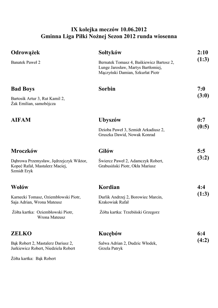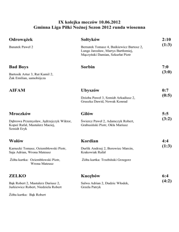 IX kolejka meczów 10.06.2012 Gminna Liga Piłki Nożnej Sezon 2012 runda wiosenna Odrowążek Sołtyków Banatek Paweł 2 Bernatek Tomasz 4, Baśkiewicz Bartosz 2, Lunge Jarosław, Martys Bartłomiej, Mączyński Damian, Szkurłat Piotr Bad Boys Sorbin 7:0 (3:0) Ubyszów 0:7 (0:5) Bartosik Artur 3, Rut Kamil 2, Żak Emilian, samobójcza AIFAM Dzioba Paweł 3, Szmidt Arkadiusz 2, Gruszka Dawid, Nowak Konrad Mroczków Gilów Dąbrowa Przemysław, Jędrzejczyk Wiktor, Kopeć Rafał, Mastalerz Maciej, Szmidt Eryk Świercz Paweł 2, Adamczyk Robert, Grabusiński Piotr, Okła Mariusz Wołów Kordian Karnecki Tomasz, Oziembłowski Piotr, Saja Adrian, Wrona Mateusz Durlik Andrzej 2, Borowiec Marcin, Krakowiak Rafał Żółta kartka: Oziembłowski Piotr, Wrona Mateusz Żółta kartka: Trzebiński Grzegorz ZELKO Kucębów Bąk Robert 2, Mastalerz Dariusz 2, Jurkiewicz Robert, Niedziela Robert Salwa Adrian 2, Dudzic Włodek, Grzela Patryk Żółta kartka: Bąk Robert 2:10 (1:3) 5:5 (3:2) 4:4 (1:3) 6:4 (4:2)
