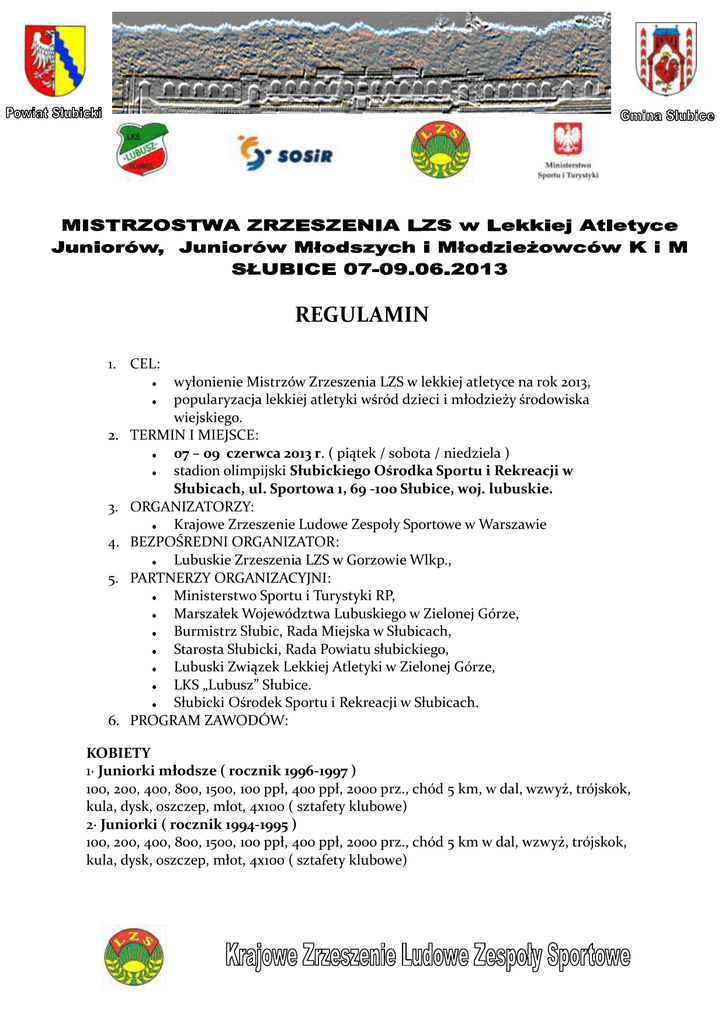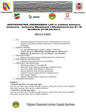 REGULAMIN 1. CEL: 2. 3. 4. 5. 6. wyłonienie Mistrzów Zrzeszenia LZS w lekkiej atletyce na rok 2013, popularyzacja lekkiej atletyki wśród dzieci i młodzieży środowiska wiejskiego. TERMIN I MIEJSCE: 07 – 09 czerwca 2013 r. ( piątek / sobota / niedziela ) stadion olimpijski Słubickiego Ośrodka Sportu i Rekreacji w Słubicach, ul. Sportowa 1, 69 -100 Słubice, woj. lubuskie. ORGANIZATORZY: Krajowe Zrzeszenie Ludowe Zespoły Sportowe w Warszawie BEZPOŚREDNI ORGANIZATOR: Lubuskie Zrzeszenia LZS w Gorzowie Wlkp., PARTNERZY ORGANIZACYJNI: Ministerstwo Sportu i Turystyki RP, Marszałek Województwa Lubuskiego w Zielonej Górze, Burmistrz Słubic, Rada Miejska w Słubicach, Starosta Słubicki, Rada Powiatu słubickiego, Lubuski Związek Lekkiej Atletyki w Zielonej Górze, LKS „Lubusz” Słubice. Słubicki Ośrodek Sportu i Rekreacji w Słubicach. PROGRAM ZAWODÓW: KOBIETY 1· Juniorki młodsze ( rocznik 1996-1997 ) 100, 200, 400, 800, 1500, 100 ppł, 400 ppł, 2000 prz., chód 5 km, w dal, wzwyż, trójskok, kula, dysk, oszczep, młot, 4x100 ( sztafety klubowe) 2· Juniorki ( rocznik 1994-1995 ) 100, 200, 400, 800, 1500, 100 ppł, 400 ppł, 2000 prz., chód 5 km w dal, wzwyż, trójskok, kula, dysk, oszczep, młot, 4x100 ( sztafety klubowe) 3· Kategoria młodzieżowa ( rocznik 1991 – 1993 ) 100, 200, 400, 800, 1500, 100 ppł, 400 ppł, 2000 prz., chód 5 km w dal, wzwyż, trójskok, kula, dysk, oszczep, młot. · OPEN / w kategoriach j / w / tyczka, 3000, 4x400 ( sztafety klubowe ) MĘŻCZYŹNI 1· Juniorzy młodsi ( rocznik 1996-1997 ) 100, 200, 400, 800, 1500, 3000, 110 ppł, 400 ppł, 2000 prz., chód 10 km, w dal, wzwyż, trójskok, kula, dysk, oszczep, młot, 4x100 (sztafety klubowe) 2· Juniorzy ( rocznik 1994-1995 ) 100, 200, 400, 800, 1500, 3000, 110 ppł, 400 ppł, 2000 prz., chód 10 km, w dal, wzwyż, trójskok, kula, dysk, oszczep, młot, 4x100 (sztafety klubowe) 3· Kategoria młodzieżowa ( rocznik 1991 – 1993 ) 100, 200, 400, 800, 1500, 3000, 110 ppł. 400 ppł, chód 10 km, w dal, wzwyż, trójskok, kula, dysk, oszczep, młot. · OPEN / w kategoriach j / w / tyczka, 4x400 ( sztafety klubowe ) Zawodnicy/czki grupy młodszej mogą startować w grupie starszej w konkurencjach oznaczonych zapisem „open”. W pozostałych konkurencjach, zgodnie z programem, startują w swoich grupach wiekowych. W konkurencjach technicznych, do których zgłoszono i stanie na starcie 17 lub więcej zawodników zostaną rozegrane eliminacje. Odległość belki od piaskownicy w trójskoku: kobiety 9 / 11 m, mężczyźni 11 /13 m W przypadku niezweryfikowania zawodników na dwie godziny przed danym seansem zawodów, w których rozgrywane są eliminacje, delegat techniczny skreśla tych zawodników z listy startowej we wszystkich zgłoszonych konkurencjach. Warunkiem rozegrania danej konkurencji jest zweryfikowanie i zgłoszenie się na starcie min. 4 zawodników ( - czek )/trzech sztafet. Jeśli w danej konkurencji i grupie wiekowej nie zgłosi się 4 zawodników/ 3 sztafety to konkurencja ta może być rozegrana jako Open. 7. UCZESTNICTWO : W Mistrzostwach Krajowego Zrzeszenia LZS startują zawodnicy urodzeni: 1991 - 1993 ( kategoria młodzieżowa ) 1994 - 1995 ( kategoria junior ) 1996 - 1997 ( kategoria junior młodszy ). Prawo startu mają zawodnicy członkowie LZS, posiadający aktualne badania lekarskie: legitymację LZS (aktualnie opłacone składki), aktualną licencję zawodniczą PZLA, a klub aktualną licencję klubową PZLA. Nie mają prawa startu zawodnicy zgłoszeni do innych klubów sportowych, które nie są członkami Zrzeszenia LZS. Organizator nie przewiduje startu „PK”. W sztafetach 4 x 100 i 4 x 400 mogą startować zawodnicy tylko z danego Klubu – startują reprezentacje klubowe. 8. SPOSÓB PRZEPROWADZENIA ZAWODÓW : zawodnik ma prawo startu w dwóch konkurencjach i sztafecie lub jednej konkurencji i dwóch sztafetach, z tym ograniczeniem, że nie może startować w ciągu jednego dnia w dwóch konkurencjach powyżej 400 m. w biegu na 100, 100 ppł, 110 ppł rozegrane zostaną eliminacje i finały ( na 100 m ew. półfinały ) w biegach od 400 m rozegrane będą „serie na czas”. w konkurencjach technicznych do ścisłego finału kwalifikuje się 8 najlepszych zawodników ( - czek ) Zawody odbędą się według przepisów PZLA oraz ustaleń zawartych w regulaminie i komunikacie organizacyjnym Mistrzostw. 9. PUNKTACJA : punktacja zespołowa prowadzona będzie ( zgodnie z zasadami uczestnictwa ) w relacji województw i klubów, według następującego klucza : I m - 9 pkt,; II m - 7 pkt,; III m - 6 pkt.; IV m - 5 pkt.; V m – 4 pkt.; VI m - 3 pkt.; VII m – 2 pkt.; VIII m - 1 pkt. Uwaga : Punkty uzyskane przez zawodników grupy junior młodszy i junior będą zaliczane do klasyfikacji zespołowej systemu współzawodnictwa LZS za 2012 rok. 10. NAGRODY: zawodnicy za I miejsce otrzymują okolicznościowe koszulki Mistrza Polski LZS 2013 ufundowane przez organizatora, zawodnicy za I ,II, III miejsca otrzymują medale, dyplomy. województwa, kluby w punktacji łącznej za I - VIII miejsca otrzymują pamiątkowe puchary. w przypadku pozyskania sponsorów organizator ufunduje dodatkowe nagrody 11. ZGŁOSZENIA: zainteresowane kluby winny dokonać zgłoszenia imiennego ekip do zawodów wg. Regulaminu PZLA – Internetowy System Zgłoszeń do zawodów – http.// www.domtel-sport.pl/zgłoszenia/ system zgłoszeń otwarty jest od dnia 27 maja do 3 czerwca 2013 r. do godz. 20,00. 12. ZASADY FINANSOWANIA: koszta organizacyjne zawodów pokrywa organizator a koszta osobowe uczestniczące kluby / województwa. Koszt osobodnia wynosi : 80 zł – internat /ilość miejsc – do 60, 90 zł - DS / Hotelilość miejsc – do 600. Bezpośredni organizator przyjmuje zamówienia na wyżywienie i zakwaterowanie (wg. załączonego wzoru / druku) w terminie do dnia 31 maja 2013 r. (piątek) do godz. 15.00 jedynie podpisane przez Głównego Księgowego i Prezesa Klubu / Przewodni