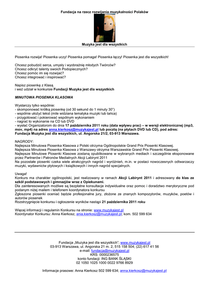 Fundacja na rzecz rozwijania muzykalności Polaków Muzyka jest dla wszystkich Piosenka rozwija! Piosenka uczy! Piosenka pomaga! Piosenka łączy! Piosenka jest dla wszystkich! Chcesz pobudzić serca, umysły i wyobraźnię młodych Twórców? Chcesz odkryć talenty swoich Podopiecznych? Chcesz pomóc im się rozwijać? Chcesz integrować i inspirować? Napisz piosenkę z Klasą i weź udział w konkursie Fundacji Muzyka jest dla wszystkich MINUTOWA PIOSENKA KLASOWA Wystarczy tylko wspólnie: - skomponować krótką piosenkę (od 30 sekund do 1 minuty 30”) - wspólnie ułoŜyć tekst (mile widziana tematyka muzyki lub tańca) - przygotować i pokierować wspólnym wykonaniem - nagrać to wykonanie na CD lub DVD - wysłać Organizatorom do dnia 17 października 2011 roku (data wpływu prac) – w wersji elektronicznej (mp3, mov, mp4) na adres [email protected] lub pocztą (na płytach DVD lub CD), pod adres: Fundacja Muzyka jest dla wszystkich, ul. Angorska 21/2, 03-913 Warszawa. NAGRODY: Najlepsza Minutowa Piosenka Klasowa z Polski otrzyma Ogólnopolskie Grand Prix Piosenki Klasowej. Najlepsza Minutowa Piosenka Klasowa z Warszawy otrzyma Warszawskie Grand Prix Piosenki Klasowej. Najlepsze Minutowe Piosenki Klasowe zostaną opublikowane w wybranych mediach i szczególnie eksponowane przez Partnerów i Patronów Medialnych Akcji Labirynt 2011 Na pozostałe piosenki czeka wiele atrakcyjnych nagród i wyróŜnień, m.in. w postaci nowoczesnych odtwarzaczy muzyki, wydawnictw płytowych i ksiąŜkowych i innych nagród specjalnych. Uwaga! Konkurs ma charakter ogólnopolski, jest realizowany w ramach Akcji Labirynt 2011 i adresowany do klas ze szkół podstawowych i gimnazjów wraz z Opiekunami. Dla zainteresowanych moŜliwe są bezpłatne konsultacje indywidualne oraz pomoc i doradztwo merytoryczne pod podanym niŜej mailem i telefonem koordynatora konkursu Zgłoszone piosenki oceniać będzie profesjonalne jury, złoŜone ze znanych kompozytorów, muzyków, poetów i autorów piosenek Rozstrzygnięcie konkursu i ogłoszenie wyników nastąpi 21 października 2011 roku Więcej informacji i regulamin Konkursu na stronie: www.muzykajest.pl Koordynator Konkursu: Anna Kierkosz, [email protected]; kom. 502 599 634 Fundacja „Muzyka jest dla wszystkich”; www.muzykajest.pl 03-913 Warszawa, ul. Angorska 21 m. 2, 515 158 504; (22) 617 41 56 e-mail: [email protected] KRS: 0000236575 konto fundacji: ING BANK ŚLĄSKI 02 1050 1025 1000 0022 9766 8929 Informacje prasowe: Anna Kierkosz 502 599 634; [email protected]