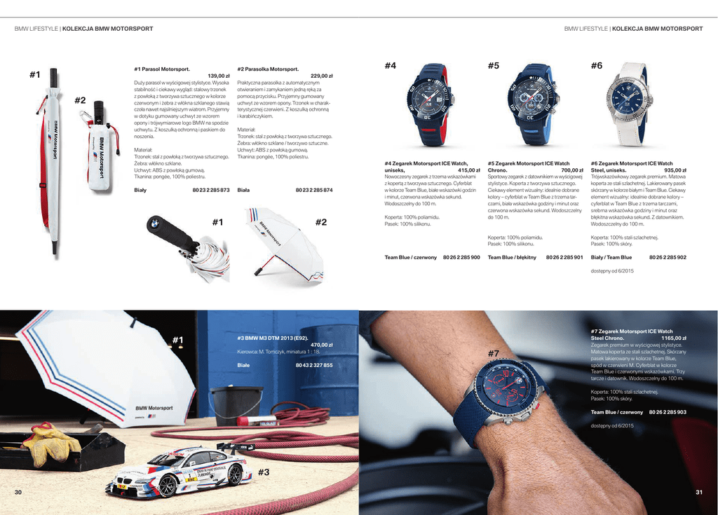 BMW LIFESTYLE | KOLEKCJA BMW MOTORSPORT #1 #2 #.8-*'&45:-&],0-&,$+"#.8.050341035 #1 Parasol Motorsport. #2 Parasolka Motorsport. 139,00 zł Duży parasol w wyścigowej stylistyce. Wysoka stabilność i ciekawy wygląd: stalowy trzonek z powłoką z tworzywa sztucznego w kolorze czerwonym i żebra z włókna szklanego stawią czoła nawet najsilniejszym wiatrom. Przyjemny w dotyku gumowany uchwyt ze wzorem opony i trójwymiarowe logo BMW na spodzie uchwytu. Z koszulką ochronną i paskiem do noszenia. 229,00 zł Praktyczna parasolka z automatycznym otwieraniem i zamykaniem jedną ręką za pomocą przycisku. Przyjemny gumowany uchwyt ze wzorem opony. Trzonek w charakterystycznej czerwieni. Z koszulką ochronną i karabińczykiem. Materiał: Trzonek: stal z powłoką z tworzywa sztucznego. Żebra: włókno szklane. Uchwyt: ABS z powłoką gumową. Tkanina: pongée, 100% poliestru. Biały 80 23 2 285 873 ;FHBSFL.PUPSTQPSU*$&8BUDI VOJTFLT [ñ /PXPD[FTOZ[FHBSFL[US[FNBXTLB[³XLBNJ [LPQFSUÅ[UXPS[ZXBT[UVD[OFHP$ZGFSCMBU XLPMPS[F5FBN#MVFCJBñFXTLB[³XLJHPE[JO JNJOVUD[FSXPOBXTLB[³XLBTFLVOE 8PEPT[D[FMOZEPN ;FHBSFL.PUPSTQPSU*$&8BUDI $ISPOP [ñ 4QPSUPXZ[FHBSFL[EBUPXOJLJFNXXZąDJHPXFK TUZMJTUZDF,PQFSUB[UXPS[ZXBT[UVD[OFHP $JFLBXZFMFNFOUXJ[VBMOZJEFBMOJFEPCSBOF LPMPSZѭDZGFSCMBUX5FBN#MVF[US[FNBUBS D[BNJCJBñBXTLB[³XLBHPE[JOZJNJOVUPSB[ D[FSXPOBXTLB[³XLBTFLVOE8PEPT[D[FMOZ EPN ;FHBSFL.PUPSTQPSU*$&8BUDI 4UFFMVOJTFLT [ñ 5S³KXTLB[³XLPXZ[FHBSFLQSFNJVN.BUPXB LPQFSUB[FTUBMJT[MBDIFUOFK-BLJFSPXBOZQBTFL TL³S[BOZXLPMPS[FCJBñZNJ5FBN#MVF$JFLBXZ FMFNFOUXJ[VBMOZJEFBMOJFEPCSBOFLPMPSZѭ DZGFSCMBUX5FBN#MVF[US[FNBUBSD[BNJ TSFCSOBXTLB[³XLBHPE[JOZJNJOVUPSB[ Cñ×LJUOBXTLB[³XLBTFLVOE;EBUPXOJLJFN 8PEPT[D[FMOZEPN ,PQFSUBQPMJBNJEV 1BTFLTJMJLPOV ,PQFSUBTUBMJT[MBDIFUOFK 1BTFLTL³SZ Materiał: Trzonek: stal z powłoką z tworzywa sztucznego. Żebra: włókno szklane / tworzywo sztuczne. Uchwyt: ABS z powłoką gumową. Tkanina: pongée, 100% poliestru. Biała 80 23 2 285 874 #1 #2 ,PQFSUBQPMJBNJEV 1BTFLTJMJLPOV 5FBN#MVFD[FSXPOZ 5FBN#MVFCñ×LJUOZ #JBñZ5FBN#MVF EPTU×QOZPE #1 #3 BMW M3 DTM 2013 (E92). 470,00 zł Kierowca: M. Tomczyk, miniatura 1 : 18. Białe 80 43 2 327 855 ;FHBSFL.PUPSTQPSU*$&8BUDI 4UFFM$ISPOP [ñ ;FHBSFLQSFNJVNXXZąDJHPXFKTUZMJTUZDF .BUPXBLPQFSUB[FTUBMJT[MBDIFUOFK4L³S[BOZ QBTFLMBLJFSPXBOZXLPMPS[F5FBN#MVF TQ³EXD[FSXJFOJ.$ZGFSCMBUXLPMPS[F 5FBN#MVFJD[FSXPOZNJXTLB[³XLBNJ5S[Z UBSD[FJEBUPXOJL8PEPT[D[FMOZEPN ,PQFSUBTUBMJT[MBDIFUOFK 1BTFLTL³SZ 5FBN#MVFD[FSXPOZ EPTU×QOZPE #3 30