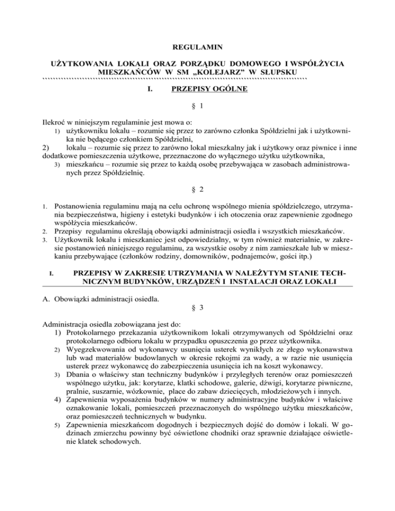 REGULAMIN UŻYTKOWANIA LOKALI ORAZ PORZĄDKU DOMOWEGO I WSPÓŁŻYCIA MIESZKAŃCÓW W SM „KOLEJARZ” W SŁUPSKU ```````````````````````````````````````````````````````````````````````````````````````````````````` I. PRZEPISY OGÓLNE § 1 Ilekroć w niniejszym regulaminie jest mowa o: 1) użytkowniku lokalu – rozumie się przez to zarówno członka Spółdzielni jak i użytkownika nie będącego członkiem Spółdzielni, 2) lokalu – rozumie się przez to zarówno lokal mieszkalny jak i użytkowy oraz piwnice i inne dodatkowe pomieszczenia użytkowe, przeznaczone do wyłącznego użytku użytkownika, 3) mieszkańcu – rozumie się przez to każdą osobę przebywająca w zasobach administrowanych przez Spółdzielnię. § 2 Postanowienia regulaminu mają na celu ochronę wspólnego mienia spółdzielczego, utrzymania bezpieczeństwa, higieny i estetyki budynków i ich otoczenia oraz zapewnienie zgodnego współżycia mieszkańców. 2. Przepisy regulaminu określają obowiązki administracji osiedla i wszystkich mieszkańców. 3. Użytkownik lokalu i mieszkaniec jest odpowiedzialny, w tym również materialnie, w zakresie postanowień niniejszego regulaminu, za wszystkie osoby z nim zamieszkałe lub w mieszkaniu przebywające (członków rodziny, domowników, podnajemców, gości itp.) 1. I. PRZEPISY W ZAKRESIE UTRZYMANIA W NALEŻYTYM STANIE TECHNICZNYM BUDYNKÓW, URZĄDZEŃ I INSTALACJI ORAZ LOKALI A. Obowiązki administracji osiedla. § 3 Administracja osiedla zobowiązana jest do: 1) Protokolarnego przekazania użytkownikom lokali otrzymywanych od Spółdzielni oraz protokolarnego odbioru lokalu w przypadku opuszczenia go przez użytkownika. 2) Wyegzekwowania od wykonawcy usunięcia usterek wynikłych ze złego wykonawstwa lub wad materiałów budowlanych w okresie rękojmi za wady, a w razie nie usunięcia usterek przez wykonawcę do zabezpieczenia usunięcia ich na koszt wykonawcy. 3) Dbania o właściwy stan techniczny budynków i przyległych terenów oraz pomieszczeń wspólnego użytku, jak: korytarze, klatki schodowe, galerie, dźwigi, korytarze piwniczne, pralnie, suszarnie, wózkownie, place do zabaw dziecięcych, młodzieżowych i innych. 4) Zapewnienia wyposażenia budynków w numery administracyjne budynków i właściwe oznakowanie lokali, pomieszczeń przeznaczonych do wspólnego użytku mieszkańców, oraz pomieszczeń technicznych w budynku. 5) Zapewnienia mieszkańcom dogodnych i bezpiecznych dojść do domów i lokali. W godzinach zmierzchu powinny być oświetlone chodniki oraz sprawnie działające oświetlenie klatek schodowych. 2 Zabezpieczenia normatywnego ogrzewania lokali w okresie grzewczym; w wypadku zaburzeń w dostawach energii cieplnej elektrycznej, wody i gazu, interweniowanie we właściwych przedsiębiorstwach odpowiedzialnych za prawidłowe dostawy. 7) Nadzorowanie i kontrolowanie zakładów świadczących usługi w zakresie utrzymywania właściwego stanu technicznego budynku i jego urządzeń oraz czystości i porządku oraz usuwania skutków zimy. 8) Przyjmowanie i reagowanie na wszystkie uwagi i skargi mieszkańców wynikające z niniejszego regulaminu. 9) Zdecydowanego reagowania na wszelkie przypadki niszczenia wspólnego mienia Spółdzielni i zgłaszania sprawców wandalizmu i zniszczeń oraz niewłaściwego parkowania odpowiednim służbom (policji, straży miejskiej). 10) Egzekwowania od sprawców szkód ich usunięcia, względnie pokrycia kosztów likwidacji szkód. 6) B. Obowiązki członków, mieszkańców oraz użytkowników lokali. § 4 Lokal może być użytkowany wyłącznie na cele określone w przydziale lub w umowie. W lokalu mieszkalnym za pisemną zgodą Zarządu Spółdzielni dopuszcza się wykonywanie zawodu, który nie zagraża bezpieczeństwu, higienie, nie zakłóca spokoju i nie jest uciążliwy dla mieszkańców budynku. § 5 Użytkownik jest obowiązany dbać o należyte utrzymanie zajmowanego lokalu i innych użytkowanych pomieszczeń oraz dokonywać napraw urządzeń technicznych i wyposażenia lokalu w zakresie ustalonym w regulaminie określającym obowiązki spółdzielni i użytkowników w zakresie napraw wewnątrz lokali. 2. Wszyscy mieszkańcy są zobowiązani do troski o należyty stan zewnętrznych elementów budynków (balkony, loggie, galerie, elewacje itp.) oraz trawników, drzew, krzewów, chodników, parkingów, dróg osiedlowych, urządzeń zabawowych i innych urządzeń rekreacyjnych. Osoby dokonujące dewastacji tych urządzeń ponoszą pełne koszty ich naprawy i usunięcia powstałych szkód. 3. Wszyscy mieszkańcy zobowiązani są aktywnie przeciwdziałać przypadkom kradzieży, zniszczeń, wandalizmu wspólnego mienia, zgłaszać te przypadki na Policję, do Straży Miejskiej i do swojej administracji. 1. §6 1. 2. Wszelkie przeróbki w lokalach, instalacjach, zabudowa wnęk, zabudowa instalacji wod.kan. i gazowych, zmiany funkcjonalne, stawianie lub rozbieranie ścianek działowych, przekucia w ścianach konstrukcyjnych itp. mogą być dokonane jedynie za pisemną zgodą i na warunkach podanych przez Spółdzielnię, na koszt użytkownika. W przypadku wymiany stolarki okiennej należy uzyskać od Spółdzielni pisemną zgodę i warunki tej wymiany. §7 1. Zabrania się otwierania szafek licznikowych prądu elektrycznego i gazu, manipulowania w tablicach rozdzielczych prądu elektrycznego (naprawianie bezpieczników elektrycznych), zaworach na pionach centralnego ogrzewania i innych instalacjach znajdujących się w piwnicach, w klatkach schodowych i pomieszczeniach wspólnego użytku. Osoby nie przestrze- 3 gające tego zakazu w przypadku spowodowania awarii lub strat będą obciążone kosztami ich usunięcia i szkodami wyrządzonymi osobom trzecim. 2. W przypadku stwierdzenia uszkodzeń technicznych lub zerwania plomby na licznikach elektrycznych, gazomierzach, wodomierzach i podzielnikach kosztów c.o. należy niezwłocznie zawiadomić pisemnie Spółdzielnię. 3. Zabrania się unieruchamiani