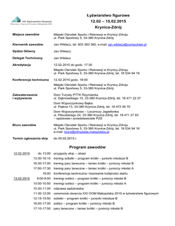 Łyżwiarstwo figurowe 12.02 – 15.02.2015 Krynica-Zdrój Miejsce zawodów Miejski Ośrodek Sportu i Rekreacji w Krynicy-Zdroju ul. Park Sportowy 5, 33-380 Krynica-Zdrój Kierownik zawodów Jan Wikłacz, tel. 603 383 360, e-mail: [email protected] Sędzia Główny Jan Wikłacz Delegat Techniczny Jan Wikłacz Akredytacja 12.02.2015 do godz. 17:30 Miejski Ośrodek Sportu i Rekreacji w Krynicy-Zdroju ul. Park Sportowy 5, 33-380 Krynica-Zdrój, tel. 18 534 94 16 Konferencja techniczna 12.02.2015 godz. 18:00 Miejski Ośrodek Sportu i Rekreacji w Krynicy-Zdroju ul. Park Sportowy 5, 33-380 Krynica-Zdrój Zakwaterowanie i wyżywienie Dom Turysty PTTK Rzymianka ul. Dąbrowskiego 15, 33-380 Krynica-Zdrój, tel. 18 471 22 27 Dom Wypoczynkowy Bajka ul. Piękna 13, 33-380 Krynica-Zdrój, tel. 18 472 55 70 Dom Wypoczynkowo – Leczniczy Jagiellonka ul. Piłsudskiego 24, 33-380 Krynica-Zdrój, tel. 18 471 27 83 – sędziowie i przedstawiciele PZS Biuro zawodów Miejski Ośrodek Sportu i Rekreacji w Krynicy-Zdroju ul. Park Sportowy 5, 33-380 Krynica-Zdrój, tel. 18 534 94 16 e-mail: [email protected] Termin zgłoszenia ekip do 05.02.2015 r. Program zawodów 12.02.2015 do 13:00 przyjazdy ekip – obiad 13:30-16:15 trening solistki – program krótki – juniorki młodsze B 16:30-17:00 trening pary taneczne – taniec krótki – juniorzy młodsi B 17:00-17:30 trening pary taneczne – taniec krótki – juniorzy młodsi A 18:00 konferencja techniczna i losowanie kolejności startu 13.02.2015 9:00-9:50 treningi soliści – program krótki – juniorzy młodsi B 10:00-10:50 treningi soliści – program krótki – juniorzy młodsi A 10:30-11:00 odprawa sędziowska 11:30-12:00 ceremonia otwarcia XXI OOM Małopolska 2015 w łyżwiarstwie figurowym 12:15-15:50 solistki – program krótki – juniorki młodsze B 16:00-17:00 soliści – program krótki – juniorzy młodsi B 17:10-17:50 pary taneczne – taniec krótki – juniorzy młodsi B 17:50-18:10 pary taneczne – taniec krótki – juniorki młodsze A 18:10-20:00 treningi solistki – program krótki – juniorki młodsze A 20:00-21:00 treningi soliści – program dowolny – juniorzy młodsi B 14.02.2015 8:00-10:15 treningi solistki – program dowolny – juniorki młodsze B 10:30-11:20 soliści – program krótki – juniorzy młodsi A 11:30-13:25 solistki – program krótki – juniorki młodsze A 13:25-14:35 soliści – program dowolny – juniorzy młodsi B 14:45-18:10 solistki – program dowolny – juniorki młodsze B 18:20-19:00 pary taneczne – taniec dowolny – juniorzy młodsi B 19:00-19:20 pary taneczne – taniec dowolny – juniorzy młodsi A 19:30-20:25 trening solistki – program dowolny – juniorki młodsze A 15.02.2015 7:25-8:15 trening soliści – program dowolny – juniorzy młodsi A 8:30-10:45 solistki – program dowolny – juniorki młodsze A 10:45-12:00 soliści – program dowolny – juniorzy młodsi A 14:00 dekoracja – wszystkie konkurencje ceremonia zamknięcia XXI OOM Małopolska 2015 w łyżwiarstwie figurowym obiad – wyjazd ekip