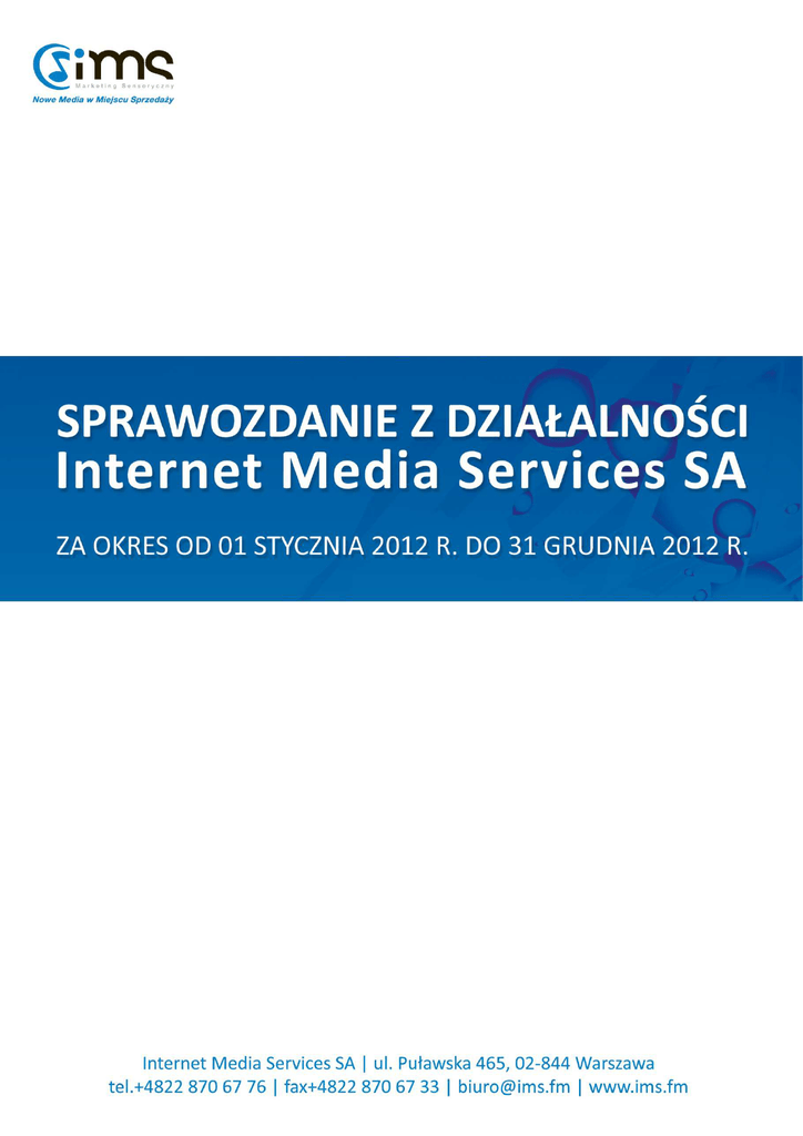 1 SPRAWOZDANIE ZARZĄDU Z DZIAŁALNOŚCI INTERNET MEDIA SERVICES SA ZA ROK 2012 SPIS TREŚCI: 1. DANE ORGANIZACYJNE........................................................................................................................ 2 1.1. Spółka ............................................................................................................................................... 2 1.2. Władze Spółki ................................................................................................................................... 3 1.3. Spółki zależne ................................................................................................................................... 6 2. DZIAŁALNOŚĆ SPÓŁKI .......................................................................................................................... 7 2.1. Podstawowe obszary działalności .................................................................................................... 7 2.2. Zdarzenia mające istotny wpływ na działalność Spółki w 2012 roku ............................................... 8 2.3. Pozycja rynkowa Internet Media Services SA................................................................................... 9 2.4. Prognozy rozwoju Spółki i rynku .................................................................................................... 11 3. SYTUACJA MAJĄTKOWA I FINANSOWA SPÓŁKI ................................................................................ 12 3.1. Sytuacja finansowa Spółki .............................................................................................................. 12 3.2. Sytuacja majątkowa Spółki ............................................................................................................. 14 3.3. Sytuacja kadrowa ........................................................................................................................... 15 4. ISTOTNE WYDARZENIA PO ZAKOŃCZENIU OKRESU SPRAWOZDAWCZEGO ..................................... 16 4.1. Umowa inwestycyjna z Inkubatorem Przedsiębiorczości............................................................... 16 4.2. Rozliczenie dotacji unijnej .............................................................................................................. 16 4.3. Program opcji menedżerskich na lata 2013 – 2015 („Program Motywacyjny II”) ......................... 17 4.4. Akcje IMS SA w NewConnect Lead ................................................................................................. 19 5. WYNAGRODZENIA OSÓB ZARZĄDZAJĄCYCH I NADZORUJĄCYCH ..................................................... 19 6. WYNAGRODZENIE AUTORYZOWANEGO DORADCY .......................................................................... 20 7. CZYNNIKI RYZYKA............................................................................................................................... 21 1 SPRAWOZDANIE ZARZĄDU Z DZIAŁALNOŚCI INTERNET MEDIA SERVICES SA ZA ROK 2012 1. DANE ORGANIZACYJNE 1.1. Spółka Firma: Internet Media Services SA Siedziba: Warszawa (02-844) Adres: ul. Puławska 465 Numer telefonu: +48 22 870 67 76 Numer faksu: +48 22 870 67 33 E-mail: [email protected] Adres internetowy: www.ims.fm NIP: 525-22-01-663 REGON: 016452416 Internet Media Services SA („Spółka”, „IMS SA”) została utworzona w wyniku przekształcenia Spółki Internet Media Services Sp. z o.o. w spółkę akcyjną uchwałą Walnego Zgromadzenia Wspólników Spółki z dnia 8 marca 2007 r. (Rep. A nr 498/2007). Spółka Internet Media Services Sp. z o.o., działająca od 2000 r., zarejestrowana była w Krajowym Rejestrze Sądowym prowadzonym przez Sąd Rejonowy dla Miasta Stołecznego Warszawy w Warszawie, XIII Wydział Gospodarczy Krajowego Rejestru Sądowego pod numerem KRS 0000083234. W dniu 8 marca 2007 r. Nadzwyczajne Zgromadzenie Wspólników Spółki podjęło uchwałę w sprawie przekształcenia Spółki w spółkę akcyjną. W dniu 10 kwietnia 2007 r. Sąd Rejonowy dla Miasta Stołecznego Warszawy w Warszawie, XIII Wydział Gospodarczy Krajowego Rejestru Sądowego zarejestrował zmianę formy prawnej Spółki ze spółki z ograniczoną odpowiedzialnością na spółkę akcyjną oraz podwyższenie kapitału akcyjnego do wysokości 500 tys. PLN. Internet Media Services Spółka Akcyjna jest zarejestrowana w Krajowym Rejestrze Sądowym prowadzonym przez Sąd Rejonowy dla Miasta Stołecznego Warszawy w Warszawie, XIII Wydział Gospodarczy Krajowego Rejestru Sądowego pod numerem KRS 0000278240. Kapitał akcyjny Spółki według stanu na dzień 31 grudnia 2012 roku wynosił 662 300,72 zł i dzielił się na 33.115.036 akcji o wartości nominalnej 0,02 złotych każda. 2 SPRAWOZDANIE ZARZĄDU Z DZIAŁALNOŚCI INTERNET MEDIA SERVICES SA ZA ROK 2012 1.2. Władze Spółki Na dzień 31 grudnia 2012 r. władze Spółki stanowią: Walne Zgromadzenie Akcjonariuszy, Rada Nadzorcza oraz Zarząd. 1.2.1. Walne Zgromadzenie Akcjonariuszy W 2012 odbyło się jedno Zwyczajne Walne Zgromadzenie Akcjonariuszy w dniu 27 czerwca 2012 roku. Skład Akcjonariatu na dzień 31.12.2012 r. Akcje kontrolowane przez osoby / podmioty nadzorujące Właściciel prawny akcji Wiesław Rozłucki Wiesław Rozłucki Opera Fundusz Inwestycyjny Zamknięty ilość akcji % w kapitale zakładowym oraz % liczby głosów na Walnym Zgromadzeniu 200 000 0,60% Opera Fundusz Inwestycyjny Zamknięty 2 626 500 7,93% Krzysztof Bajołek Fundusz Inwestycyjny Zamknięty FORUM X 4 920 341 14,86% Krzysztof Bajołek INVEST PBB Sp. z o.o. S.K.A. 1 002 941 3,03% Artur G. Czeszejko-Sochacki Cacheman Limited 2 375 000 7,17% Artur G. Czeszejko-Sochacki Grupa Kapitałowa G-8 Inwestycje Sp. z o.o. 1 053 075 3,18% Artur G. Czeszejko-Sochacki Artur G. Czeszejko-Sochacki 304 749 0,92% Artur G. Czeszejko-Sochacki Amornrat Bovorntanasarn 50 000 0,15% 12 532 606 37,84% SUMA Właściciel prawny akcji Michał Kornacki M