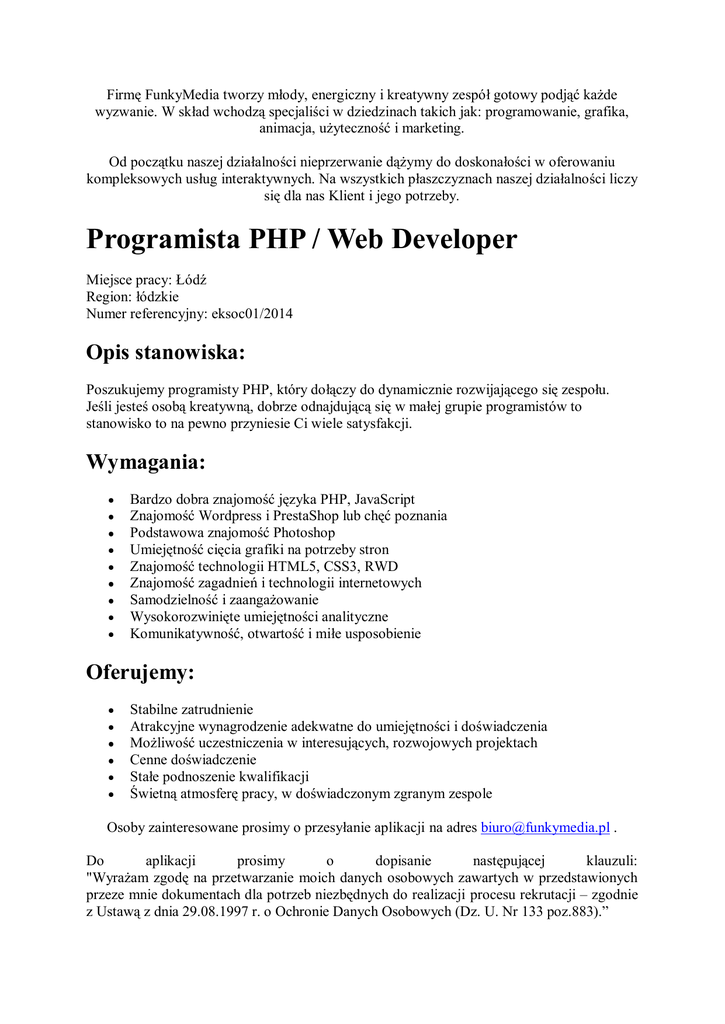Firmę FunkyMedia tworzy młody, energiczny i kreatywny zespół gotowy podjąć każde wyzwanie. W skład wchodzą specjaliści w dziedzinach takich jak: programowanie, grafika, animacja, użyteczność i marketing. Od początku naszej działalności nieprzerwanie dążymy do doskonałości w oferowaniu kompleksowych usług interaktywnych. Na wszystkich płaszczyznach naszej działalności liczy się dla nas Klient i jego potrzeby. Programista PHP / Web Developer Miejsce pracy: Łódź Region: łódzkie Numer referencyjny: eksoc01/2014 Opis stanowiska: Poszukujemy programisty PHP, który dołączy do dynamicznie rozwijającego się zespołu. Jeśli jesteś osobą kreatywną, dobrze odnajdującą się w małej grupie programistów to stanowisko to na pewno przyniesie Ci wiele satysfakcji. Wymagania: Bardzo dobra znajomość języka PHP, JavaScript Znajomość Wordpress i PrestaShop lub chęć poznania Podstawowa znajomość Photoshop Umiejętność cięcia grafiki na potrzeby stron Znajomość technologii HTML5, CSS3, RWD Znajomość zagadnień i technologii internetowych Samodzielność i zaangażowanie Wysokorozwinięte umiejętności analityczne Komunikatywność, otwartość i miłe usposobienie Oferujemy: Stabilne zatrudnienie Atrakcyjne wynagrodzenie adekwatne do umiejętności i doświadczenia Możliwość uczestniczenia w interesujących, rozwojowych projektach Cenne doświadczenie Stałe podnoszenie kwalifikacji Świetną atmosferę pracy, w doświadczonym zgranym zespole Osoby zainteresowane prosimy o przesyłanie aplikacji na adres [email protected] . Do aplikacji prosimy o dopisanie następującej klauzuli: "Wyrażam zgodę na przetwarzanie moich danych osobowych zawartych w przedstawionych przeze mnie dokumentach dla potrzeb niezbędnych do realizacji procesu rekrutacji – zgodnie z Ustawą z dnia 29.08.1997 r. o Ochronie Danych Osobowych (Dz. U. Nr 133 poz.883).”