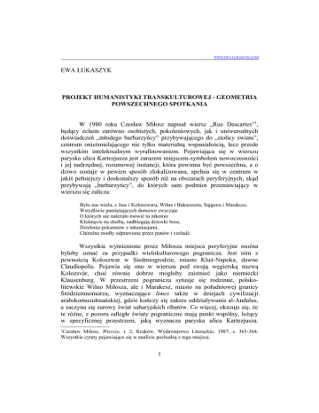 WWW.EWA-LUKASZYK.COM EWA ŁUKASZYK PROJEKT HUMANISTYKI TRANSKULTUROWEJ - GEOMETRIA POWSZECHNEGO SPOTKANIA W 1980 roku Czesław Miłosz napisał wiersz „Rue Descartes”1, będący echem zarówno osobistych, pokoleniowych, jak i uniwersalnych doświadczeń „młodego barbarzyńcy” przybywającego do „stolicy świata”, centrum onieśmielającego nie tylko materialną wspaniałością, lecz przede wszystkim intelektualnym wyrafinowaniem. Pojawiająca się w wierszu paryska ulica Kartezjusza jest zarazem miejscem-symbolem nowoczesności i jej nadrzędnej, rozumowej instancji, która powinna być powszechna, a o dziwo zostaje w pewien sposób zlokalizowana, spełnia się w centrum w jakiś pełniejszy i doskonalszy sposób niż na obszarach peryferyjnych, skąd przybywają „barbarzyńcy”, do których sam podmiot przemawiający w wierszu się zalicza: Było nas wielu, z Jass i Koloszwaru, Wilna i Bukaresztu, Sajgonu i Marakesz, Wstydliwie pamiętających domowe zwyczaje O których nie należało mówić tu nikomu: Klaśnięcie na służbę, nadbiegają dziewki bose, Dzielenie pokarmów z inkantacjami, Chóralne modły odprawiane przez panów i czeladź. Wszystkie wymienione przez Miłosza miejsca peryferyjne można byłoby uznać za przypadki wielokulturowego pogranicza. Jest nim z pewnością Koloszwar w Siedmiogrodzie, miasto Kluż-Napoka, dawne Claudiopolis. Pojawia się ono w wierszu pod swoją węgierską nazwą Kolozsvár, choć równie dobrze mogłoby zaistnieć jako niemiecki Klausenburg. W przestrzeni pogranicza sytuuje się rodzinne, polskolitewskie Wilno Miłosza, ale i Marakesz, miasto na południowej granicy Śródziemnomorza, wyznaczające limes także w dziejach cywilizacji arabskomuzułmańskiej, gdzie kończy się zakres oddziaływania al-Andalus, a zaczyna się surowy świat saharyjskich ribatów. Co więcej, okazuje się, że te różne, z pozoru odległe światy pograniczne mają punkt wspólny, leżący w specyficznej przestrzeni, jaką wyznacza paryska ulica Kartezjusza. 1 Czesław Miłosz, Wiersze, t. 2, Kraków, Wydawnictwo Literackie, 1987, s. 363-364. Wszystkie cytaty pojawiające się w analizie pochodzą z tego miejsca. 1 WWW.EWA-LUKASZYK.COM Dokonuje się spotkanie, które, gdy patrzymy na płaską powierzchnię mapy, wydawałoby się niemożliwością; wymienione miasta leżą na odmiennych orbitach kulturowych, nie przecinających się w żadnym punkcie. Ich spotkanie wymaga więc ustanowienia zupełnie nowej topologii, założenia, że istnieje przestrzeń odmienna od płaszczyzny mapy, nowy wymiar, w którym takie spotkania mogą się dokonywać, a kulturowe orbity mają punkty przecięcia. Prosta łamigłówka matematyczna pozwala uzmysłowić sobie istotę odnotowanej przez Miłosza przemiany. Niemożliwe spotkanie różnych obszarów pogranicznych, rozłącznych na płaszczyźnie mapy, staje się możliwe dopiero wtedy, kiedy dopuścimy istnienie trzeciego wymiaru którego realność jest nam przecież tak dobrze znana, ale o którym zapominamy, koncentrując się na redukcyjnych płaszczyznach stołu, kartki papieru, mapy. A więc, czy sześć zapałek można ułożyć w taki sposób, aby zamiast dwóch powstały cztery trójkąty? Wydaje się, że uzyskanie czterech trójkątów wymaga jakiegoś rozmnożenia zapałek. Ale rozwiązanie łamigłówki okazuje się bardzo proste, gdy przejdziemy do wyższego wymiaru przestrzennego. Każda z zapałek może bowiem stanowić bok więcej niż jednego trójkąta, zaczyna funkcjonować w nowy, bogatszy sposób. Rozwiązanie tego modelowego zadania toruje drogę do myślenia w nowych kategoriach, pozwalającego na przełamanie wielu niemożności, stwarza miejsce dla nowych rodzajów myślenia i działania. 2 WWW.EWA-LUKASZYK.COM Wyłonienie się ulicy Kartezjusza, punktu wspólnego obszarów pogranicznych, może się dokonać jedynie w nowym wymiarze, wykraczającym poza płaską mapę, na której obszary pograniczne są rozdzielone i odległe od siebie nawzajem. A jednak konsekwencje dokonującego się w ten sposób spotkania okazują się niepełne. Reprezentanci obszarów pogranicznych są do tego stopnia zapatrzeni w treści i wartości „stolicy świata”, że ledwie dostrzegają siebie nawzajem. Pozostają zamknięci w sferach wstydliwej pamięci, nie mówiąc nikomu o „domowych zwyczajach”, skazani na kulturowe onieśmielenie i niemotę. A więc nie widzi i nie słyszy ich także sama „stolica świata”, „gardłowym śmiechem odzywając się w ciemności, / Wypiekając długie chleby i w gliniane dzbanki nalewając wino”. Przygoda z rzekomą uniwersalnością, jaka streszcza się w tej stolicy ślepej na prawdziwą złożoność świata, kończy się frontalnym starciem obszarów pogranicznych i ich „domowych zwyczajów” z kartezjańską nowoczesnością: „Następnie wielu z Jass i Koloszwaru, albo Sajgonu, albo Marakesz / Było zabijanych ponieważ chcieli obalić domowe zwyczaje. / Następnie ich koledzy zdobywali władzę / Żeby zabijać w imię pięknych idei uniwersalnych.” Ale to jeszcze nie koniec historycznej lekcji, jaką przekazuje Miłoszowski podmiot, przeżywający, po powrocie z „wędrówki po krajach podziemnych” wizję świetlistego, kręcącego się „koła sezonów”. Nieustanne przemiany toczące się „tam gdzie upadły imperia, a ci co żyli, umarli” doprowadzają do nowego stanu: „nie ma już tu i nigdzie stolicy świata”. Co jednak dzieje się w tej sytuacji z uniwersalnymi wartościami? Poemat Miłosza nie udziela jasnej odpowiedzi na to pytanie, lecz kończy się zagadkowym fragmentem, z pozoru niezwiązanym z zarysowaną wcześniej sytuacją podmiotu przybywającego z peryferii do centrum: „A z ciężkich mych grzechów jeden najlepiej pamiętam: / Jak przechodząc raz leśną ścieżką nad potokiem / Zrzuciłem duży kamień na wodnego węża zwiniętego w trawie.” Można jednak odczytać tę sytuację transgresji, złamania odwie