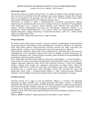 PODSTAWOWE INFORMACJE DOTYCZĄCE NOROWIRUSÓW (rodzaj: Norovirus, rodzina: Caliciviridae) Informacje ogólne Norowirusy należą do rodziny kaliciwirusów. Do grupy tej należą wirusy określane dawniej jako Norwalk, Norwalk-like (Norwalk podobne) oraz wirusy Sapporo i Saporo-like. Obecnie znane są co najmniej 4 ich genotypy: GI, GII, GIII i G IV. Do kaliciwirusów należy także przenoszony drogą pokarmową wirus zapalenia wątroby typu E. Norowirusy są uznane za jeden z najistotniejszych czynników powstawania zakażeń pokarmowych o nieustalonej albo wirusowej etiologii zwłaszcza u dorosłych. W przypadkach osób osłabionych oraz w starszym wieku zakażenie tymi wirusami może prowadzić do zgonów, których bezpośrednią przyczyną jest odwodnienie organizmu. Wirusy te są pozbawione osłonki lipoproteinowej; a tym samym oporne na rozpuszczalniki lipidów i łagodne detergenty, ulegają inaktywacji w środowisku kwaśnym o pH 3 do 5. Dobre skutki mają też związki chloru i H202. Temperatura 600C inaktywuje norowirusy w ciągu 30 minut. Drogi zakażenia Do infekcji może dojść poprzez kontakt z chorymi osobami, przedmiotami, powierzchniami zanieczyszczonymi cząsteczkami wirusa pochodzącego z wymiocin i fekaliów. Do zakażenia może dojść także poprzez zanieczyszczoną wirusem żywność lub wodę. Norowirus jest bardzo zakaźny -uznano, że już 10 cząsteczek wirusa może spowodować zakażenie. Najczęstszymi miejscami zbiorowych zatruć pokarmowych spowodowanych norowirusem (obejmujących swym zasięgiem większą ilość osób) są zakłady żywienia zbiorowego np. stołówki, restauracje, bary, a także przyjęcia rodzinne, gdzie dochodzi do bezpośredniego lub pośredniego zanieczyszczenia żywności. Poza zakażeniem spowodowanym brakiem zachowania zasad higieny w czasie kontaktów z chorą osobą, lub zanieczyszczonymi przedmiotami, powierzchniami, toaletą, naczyniami etc. źródłem zakażenia mogą być także świeże (lub mrożone) warzywa i owoce nie poddane obróbce cieplnej, które mogły ulec zakażeniu norowirusem na etapie zbioru, skupu lub produkcji. Może być to wynik nie stosowania zasad higieny przez osoby mające kontakt z żywnością (np. w sezonie przez osoby zbierające owoce), lub używania do mycia lub podlewania roślin wody o nieodpowiedniej jakości, a także zanieczyszczenia fekaliami ludzkimi. Często źródłem zachorowań mogą być także małże dwuskorupowe (ostrygi). Przebieg choroby Choroba rozwija się w ciągu 1-2 dni od zakażenia. Objawy tj. wymioty i/lub biegunka pojawiają się nagle. Ponadto może wystąpić gorączka, bóle głowy, stawów. U zdrowych dorosłych osób choroba trwa krótko (od 24 do 60 godzin) natomiast u małych dzieci biegunka może trwać do tygodnia. Badania wykazały, że w szczególności u dzieci cząsteczki wirusa są wydalane do ok. miesiąca od chwili wystąpienia zachorowania. Ponadto u około 30% osób, które uległy zakażeniu może ono przebiegać bezobjawowo lub w postaci lekkiej. Objawy żąłądkowo-jelitowe mijają najczęściej bez powikłań i innych skutków. JAK ZAPOBIEC ZAKAŻENIU ŚWIEŻYCH I MROŻONYCH OWOCÓW I WARZYW WIRUSAMI, KTÓRE POWODUJĄ ZATRUCIA POKARMOWE? W przypadku spożywania świeżych lub mrożonych (jedzonych po rozmrożeniu) owoców i warzyw, istnieje ryzyko ich zanieczyszczenia wirusami powodującymi zaburzenia żołądkowo – jelitowe (tzw. grypa żołądkowa wywoływana przez norowirusy) lub też groźniejsze choroby tj. żółtaczkę zakaźną. Głównym źródłem zakażenia na etapie uprawy jest gleba lub woda zanieczyszczona fekalilami. Najlepszą metodą wyeliminowania potencjalnego zakażenia norowirusem, jest stosowanie Dobrej Praktyki Rolniczej (GAP) i Produkcyjnej (GMP) oraz Dobrej Praktyki Higienicznej (GHP) już na etapie uprawy i zbioru. Na dalszych etapach produkcji (zakładach produkujących i pakujących mrożonki, sałatki etc. oraz w zakładach żywienia zbiorowego) muszą zostać wyeliminowane źródła zakażeń fekaliami, brudną wodą oraz kontakt osób chorych z żywnością. Przedsiębiorstwa te muszą stosować zasady systemu HACCP i Dobrej Praktyki Produkcyjnej (GMP). W SZCZEGÓLNOŚCI: − Osoby, które mają objawy chorobowe (m.in. biegunkę, wymioty), nie powinny mieć kontaktu z żywnością (nie mogą prowadzić zbioru, produkcji, sprzedaży żywności, przygotowywać posiłków etc.). Osoby te powinny zgłosić się do lekarza. − Należy zapewnić pracownikom dostęp do czystej toalety. − Pracownicy muszą każdorazowo myć ręce przed rozpoczęciem pracy, w przerwie, po skorzystaniu z toalety etc. − Woda i gleba na obszarach upraw rolniczych nie mogą być zanieczyszczone fekaliami. − Woda stosowana do podlewania owoców i warzyw musi spełniać wymagania jakościowe i nie może być skażona fekaliami ludzkimi. – Uprawy nie mogą być nawożone fekaliami ludzkimi. – Do mycia żywności należy stosować wodę przeznaczoną do spożycia spełniającą wszystkie wymagania jakościowe. – Sprzęt używany do zbioru, transportu, przechowywania, sprzedaży i przetwórstwa owoców i warzyw powinien być myty – zgodnie z wdrożonymi procedurami mycia i dezynfekcji. – przedsiębiorca na każdym etapie produkcji ma obowiązek zapewnić możliwość prześledzenia drogi surowców i produktów „krok w tył, krok w przód” – aby w każdej chwili można było ustalić od kogo kupił surowce, które użył do produkcji i komu sprzedał swoje produkty. Także konsument powinien zawsze stosować zasady higieny. PAMIETAJ: PODSTAWOWE ZNACZENIE DLA BEZPIECZEŃSTWA ŻYWNOŚCI MA ZACHOWANIE ZASAD HIGIENY “OD POLA DO STOŁU” A WIĘC W CZASIE CAŁEJ DROGI JAKĄ PRZEBYWAJĄ PRODUKTY SPOŻYWCZE, ZANIM TRAFIĄ NA STÓŁ KONSUMENTA – W CZASIE ZBIORU, SKUPU, PRODUKCJI I PRZETWARZANIA W ZAKŁADZIE, W CZASIE TRANSPORTU, SPRZEDAŻY KONSUMENTOWI ORAZ PRZYRZĄDZANIA POSIŁKÓW. KONSUMENCI POWINNI ZAWSZE MYĆ OWOCE I WARZYWA PRZ
