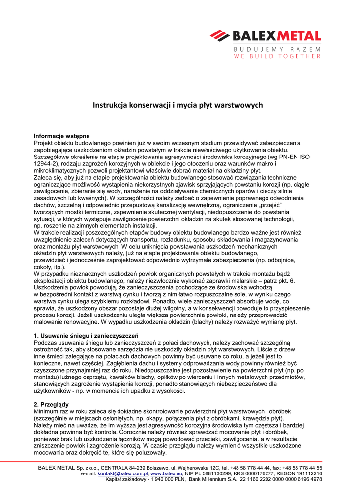 Instrukcja konserwacji i mycia płyt warstwowych Informacje wstępne Projekt obiektu budowlanego powinien już w swoim wczesnym stadium przewidywać zabezpieczenia zapobiegające uszkodzeniom okładzin powstałym w trakcie niewłaściwego użytkowania obiektu. Szczegółowe określenie na etapie projektowania agresywności środowiska korozyjnego (wg PN-EN ISO 12944-2), rodzaju zagrożeń korozyjnych w obiekcie i jego otoczeniu oraz warunków makro i mikroklimatycznych pozwoli projektantowi właściwie dobrać materiał na okładziny płyt. Zaleca się, aby już na etapie projektowania obiektu budowlanego stosować rozwiązania techniczne ograniczające możliwość wystąpienia niekorzystnych zjawisk sprzyjających powstaniu korozji (np. ciągłe zawilgocenie, zbieranie się wody, narażenie na oddziaływanie chemicznych oparów i cieczy silnie zasadowych lub kwaśnych). W szczególności należy zadbać o zapewnienie poprawnego odwodnienia dachów, szczelną i odpowiednio przepustową kanalizację wewnętrzną, ograniczenie „przejść” tworzących mostki termiczne, zapewnienie skutecznej wentylacji, niedopuszczenie do powstania sytuacji, w których występuje zawilgocenie powierzchni okładzin na skutek stosowanej technologii, np. roszenie na zimnych elementach instalacji. W trakcie realizacji poszczególnych etapów budowy obiektu budowlanego bardzo ważne jest również uwzględnienie zaleceń dotyczących transportu, rozładunku, sposobu składowania i magazynowania oraz montażu płyt warstwowych. W celu uniknięcia powstawania uszkodzeń mechanicznych okładzin płyt warstwowych należy, już na etapie projektowania obiektu budowlanego, przewidzieć i jednocześnie zaprojektować odpowiednio wytrzymałe zabezpieczenia (np. odbojnice, cokoły, itp.). W przypadku nieznacznych uszkodzeń powłok organicznych powstałych w trakcie montażu bądź eksploatacji obiektu budowlanego, należy niezwłocznie wykonać zaprawki malarskie – patrz pkt. 6. Uszkodzenia powłok powodują, że zanieczyszczenia pochodzące ze środowiska wchodzą w bezpośredni kontakt z warstwą cynku i tworzą z nim łatwo rozpuszczalne sole, w wyniku czego warstwa cynku ulega szybkiemu rozkładowi. Ponadto, wiele zanieczyszczeń absorbuje wodę, co sprawia, że uszkodzony obszar pozostaje dłużej wilgotny, a w konsekwencji powoduje to przyspieszenie procesu korozji. Jeżeli uszkodzeniu uległa większa powierzchnia powłoki, należy przeprowadzić malowanie renowacyjne. W wypadku uszkodzenia okładzin (blachy) należy rozważyć wymianę płyt. 1. Usuwanie śniegu i zanieczyszczeń Podczas usuwania śniegu lub zanieczyszczeń z połaci dachowych, należy zachować szczególną ostrożność tak, aby stosowane narzędzia nie uszkodziły okładzin płyt warstwowych. Liście z drzew i inne śmieci zalegające na połaciach dachowych powinny być usuwane co roku, a jeżeli jest to konieczne, nawet częściej. Zagłębienia dachu i systemy odprowadzania wody powinny również być czyszczone przynajmniej raz do roku. Niedopuszczalne jest pozostawienie na powierzchni płyt (np. po montażu) luźnego osprzętu, kawałków blachy, opiłków po wierceniu i innych metalowych przedmiotów, stanowiących zagrożenie wystąpienia korozji, ponadto stanowiących niebezpieczeństwo dla użytkowników - np. w momencie ich upadku z wysokości. 2. Przeglądy Minimum raz w roku zaleca się dokładne skontrolowanie powierzchni płyt warstwowych i obróbek (szczególnie w miejscach osłoniętych, np. okapy, połączenia płyt z obróbkami, krawędzie płyt). Należy mieć na uwadze, że im wyższa jest agresywność korozyjna środowiska tym częstsza i bardziej dokładna powinna być kontrola. Corocznie należy również sprawdzać mocowanie płyt i obróbek, ponieważ brak lub uszkodzenia łączników mogą powodować przecieki, zawilgocenia, a w rezultacie zniszczenie powłok i zagrożenie korozją. W czasie przeglądu należy wymienić wszystkie uszkodzone mocowania oraz dokręcić te, które się poluzowały. BALEX METAL Sp. z o.o., CENTRALA 84-239 Bolszewo, ul. Wejherowska 12C, tel. +48 58 778 44 44, fax: +48 58 778 44 55 e-mail: [email protected], www.balex.eu, NIP PL 5881130299, KRS 0000176277, REGON 191112216 Kapitał zakładowy - 1 940 000 PLN, Bank Millennium S.A. 22 1160 2202 0000 0000 6196 4978 3. Uszczelnienia W przypadku projektowania obiektu, którego eksploatacja wymaga częstego mycia okładzin, należy uwzględnić konieczność dodatkowego uszczelnienia styków płyt (oprócz mas i uszczelek standardowo aplikowanych w zamkach) tak, aby woda i środki czystości nie zawilgociły styku i nie spowodowały pogorszenia parametrów cieplno-wilgotnościowych przegród. W tym celu zaleca się stosowanie uszczelniaczy o odczynie neutralnym, na bazie silikonu, butylu, poliuretanu. Zdecydowanie odradza się użycie uszczelniaczy o odczynie kwaśnym (np. uszczelniaczy na bazie kwasu octowego). Wszelkie uszczelnienia płyt warstwowych należy regularnie kontrolować i w razie konieczności wymieniać. 4. Mycie okładzin Mycie powierzchni okładzin płyt ma na celu usunięcie widocznych zanieczyszczeń pogarszających estetykę elewacji i mających negatywny wpływ na trwałość zabezpieczenia antykorozyjnego. W obiektach branży spożywczej, w których istnieje wymóg zapewnienia czystości mikrobiologicznej, konieczne jest stosowanie specjalistycznych środków myjących i jednocześnie dezynfekujących. O możliwości zastosowania danego środka czyszczącego do płyt warstwowych decyduje kilka czynników: ▪ rodzaj okładziny płyt i powłoki organicznej; ▪ częstotliwość czyszczenia; ▪ dokładność czyszczenia. W przypadku, gdy usunięcie zabrudzeń samą wodą jest trudne, można do mycia powierzchni płyt użyć wody z dodatkiem detergentu. Zalecane są łagodne środki myjące, dobrze rozpuszczalne w wodzie o dopuszczalnym pH 4-9. Po każdym myciu konieczne jest dokładne spłukanie środka myjącego czyst