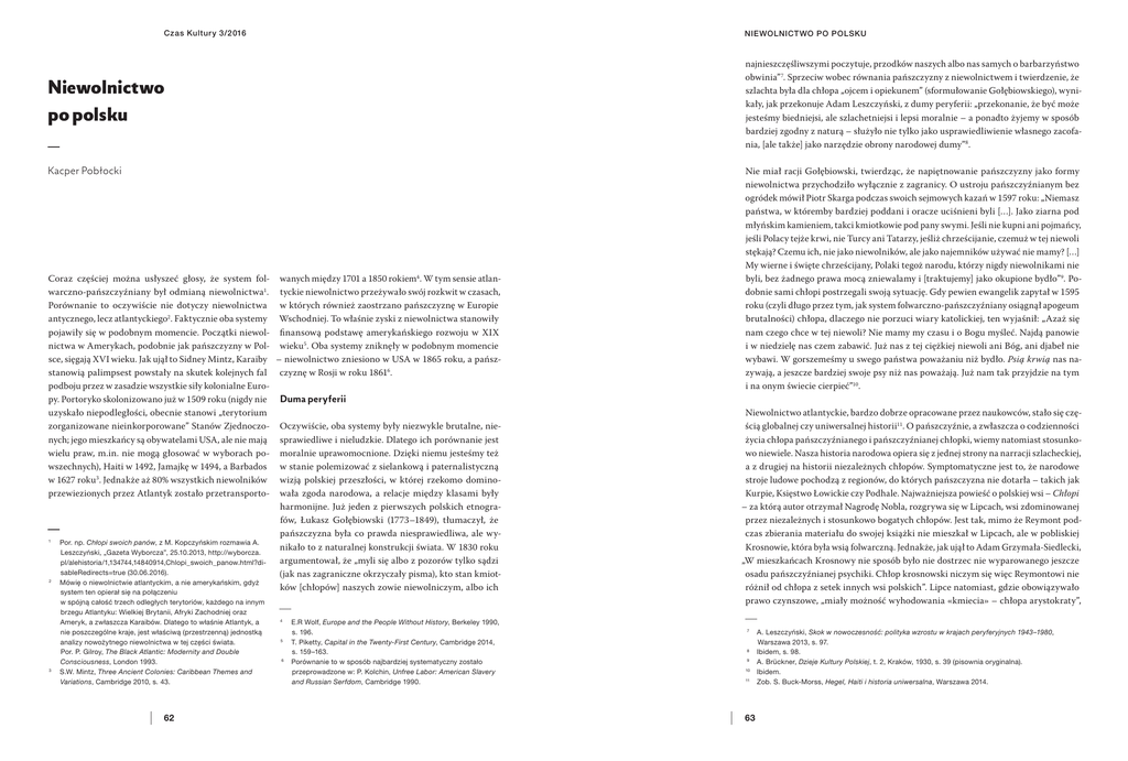 Czas Kultur y 3/2 016 NIEWOLNICTWO PO POLSKU najnieszczęśliwszymi poczytuje, przodków naszych albo nas samych o barbarzyństwo obwinia” 7. Sprzeciw wobec równania pańszczyzny z niewolnictwem i twierdzenie, że szlachta była dla chłopa „ojcem i opiekunem” (sformułowanie Gołębiowskiego), wynikały, jak przekonuje Adam Leszczyński, z dumy peryferii: „przekonanie, że być może jesteśmy biedniejsi, ale szlachetniejsi i lepsi moralnie – a ponadto żyjemy w sposób bardziej zgodny z naturą – służyło nie tylko jako usprawiedliwienie własnego zacofania, [ale także] jako narzędzie obrony narodowej dumy”8. Niewolnictwo po polsku Kacper Pobłocki Coraz częściej można usłyszeć głosy, że system fol- wanych między 1701 a 1850 rokiem4. W tym sensie atlanwarczno-pańszczyźniany był odmianą niewolnictwa1. tyckie niewolnictwo przeżywało swój rozkwit w czasach, Porównanie to oczywiście nie dotyczy niewolnictwa w których również zaostrzano pańszczyznę w Europie antycznego, lecz atlantyckiego2. Faktycznie oba systemy Wschodniej. To właśnie zyski z niewolnictwa stanowiły pojawiły się w podobnym momencie. Początki niewol- finansową podstawę amerykańskiego rozwoju w XIX nictwa w Amerykach, podobnie jak pańszczyzny w Pol- wieku5. Oba systemy zniknęły w podobnym momencie sce, sięgają XVI wieku. Jak ujął to Sidney Mintz, Karaiby – niewolnictwo zniesiono w USA w 1865 roku, a pańszstanowią palimpsest powstały na skutek kolejnych fal czyznę w Rosji w roku 18616. podboju przez w zasadzie wszystkie siły kolonialne Europy. Portoryko skolonizowano już w 1509 roku (nigdy nie Duma peryferii uzyskało niepodległości, obecnie stanowi „terytorium zorganizowane nieinkorporowane” Stanów Zjednoczo- Oczywiście, oba systemy były niezwykle brutalne, nienych; jego mieszkańcy są obywatelami USA, ale nie mają sprawiedliwe i nieludzkie. Dlatego ich porównanie jest wielu praw, m.in. nie mogą głosować w wyborach po- moralnie uprawomocnione. Dzięki niemu jesteśmy też wszechnych), Haiti w 1492, Jamajkę w 1494, a Barbados w stanie polemizować z sielankową i paternalistyczną w 1627 roku3. Jednakże aż 80% wszystkich niewolników wizją polskiej przeszłości, w której rzekomo dominoprzewiezionych przez Atlantyk zostało przetransporto- wała zgoda narodowa, a relacje między klasami były harmonijne. Już jeden z pierwszych polskich etnografów, Łukasz Gołębiowski (1773–1849), tłumaczył, że pańszczyzna była co prawda niesprawiedliwa, ale wy1 Por. np. Chłopi swoich panów, z M. Kopczyńskim rozmawia A. nikało to z naturalnej konstrukcji świata. W 1830 roku Leszczyński, „Gazeta Wyborcza”, 25.10.2013, http://wyborcza. argumentował, że „myli się albo z pozorów tylko sądzi pl/alehistoria/1,134744,14840914,Chlopi_swoich_panow.html?disableRedirects=true (30.06.2016). (jak nas zagraniczne okrzyczały pisma), kto stan kmiot2 Mówię o niewolnictwie atlantyckim, a nie amerykańskim, gdyż ków [chłopów] naszych zowie niewolniczym, albo ich system ten opierał się na połączeniu 3 w spójną całość trzech odległych terytoriów, każdego na innym brzegu Atlantyku: Wielkiej Brytanii, Afryki Zachodniej oraz Ameryk, a zwłaszcza Karaibów. Dlatego to właśnie Atlantyk, a nie poszczególne kraje, jest właściwą (przestrzenną) jednostką analizy nowożytnego niewolnictwa w tej części świata. Por. P. Gilroy, The Black Atlantic: Modernity and Double Consciousness, London 1993. S.W. Mintz, Three Ancient Colonies: Caribbean Themes and Variations, Cambridge 2010, s. 43. 62 4 5 6 E.R Wolf, Europe and the People Without History, Berkeley 1990, s. 196. T. Piketty, Capital in the Twenty-First Century, Cambridge 2014, s. 159–163. Porównanie to w sposób najbardziej systematyczny zostało przeprowadzone w: P. Kolchin, Unfree Labor: American Slavery and Russian Serfdom, Cambridge 1990. Nie miał racji Gołębiowski, twierdząc, że napiętnowanie pańszczyzny jako formy niewolnictwa przychodziło wyłącznie z zagranicy. O ustroju pańszczyźnianym bez ogródek mówił Piotr Skarga podczas swoich sejmowych kazań w 1597 roku: „Niemasz państwa, w któremby bardziej poddani i oracze uciśnieni byli […]. Jako ziarna pod młyńskim kamieniem, takci kmiotkowie pod pany swymi. Jeśli nie kupni ani pojmańcy, jeśli Polacy tejże krwi, nie Turcy ani Tatarzy, jeśliż chrześcijanie, czemuż w tej niewoli stękają? Czemu ich, nie jako niewolników, ale jako najemników używać nie mamy? […] My wierne i święte chrześcijany, Polaki tegoż narodu, którzy nigdy niewolnikami nie byli, bez żadnego prawa mocą zniewalamy i [traktujemy] jako okupione bydło”9. Podobnie sami chłopi postrzegali swoją sytuację. Gdy pewien ewangelik zapytał w 1595 roku (czyli długo przez tym, jak system folwarczno-pańszczyźniany osiągnął apogeum brutalności) chłopa, dlaczego nie porzuci wiary katolickiej, ten wyjaśnił: „Azaż się nam czego chce w tej niewoli? Nie mamy my czasu i o Bogu myśleć. Najdą panowie i w niedzielę nas czem zabawić. Już nas z tej ciężkiej niewoli ani Bóg, ani djabeł nie wybawi. W gorszemeśmy u swego państwa poważaniu niż bydło. Psią krwią nas nazywają, a jeszcze bardziej swoje psy niż nas poważają. Już nam tak przyjdzie na tym i na onym świecie cierpieć”10. Niewolnictwo atlantyckie, bardzo dobrze opracowane przez naukowców, stało się częścią globalnej czy uniwersalnej historii11. O pańszczyźnie, a zwłaszcza o codzienności życia chłopa pańszczyźnianego i pańszczyźnianej chłopki, wiemy natomiast stosunkowo niewiele. Nasza historia narodowa opiera się z jednej strony na narracji szlacheckiej, a z drugiej na historii niezależnych chłopów. Symptomatyczne jest to, że narodowe stroje ludowe pochodzą z regionów, do których pańszczyzna nie dotarła – takich jak Kurpie, Księstwo Łowickie czy Podhale. Najważniejsza powieść o polskiej wsi – Chłopi – za kt