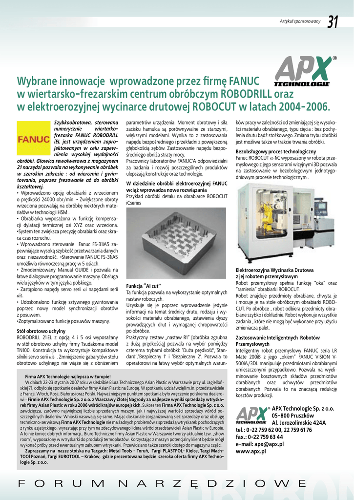 Artykuł sponsorowany 31 Wybrane innowacje wprowadzone przez firmę FANUC w wiertarsko-frezarskim centrum obróbczym ROBODRILL oraz w elektroerozyjnej wycinarce drutowej ROBOCUT w latach 2004-2006. Szybkoobrotowa, sterowana numerycznie wiertarkofrezarka FANUC ROBODRILL iEL jest urządzeniem zaprojektowanym w celu zapewnienia wysokiej wydajności obróbki. Głowica rewolwerowa z magazynem 21 narzędzi pozwala na wykonywanie obróbek w szerokim zakresie : od wiercenia i gwintowania, poprzez frezowanie a¿ do obróbki kształtowej. • Wprowadzono opcję obrabiarki z wrzecionem o prędkości 24000 obr/min. • Zwiększone obroty wrzeciona pozwalają na obróbkę niektórych materiałów w technologii HSM . • Obrabiarka wyposa¿ona w funkcję kompensacji dylatacji termicznej osi XYZ oraz wrzeciona. •System ten zwiększa precyzję obrabiarki oraz skraca czas rozruchu. • Wprowadzono sterowanie Fanuc FS-31iA5 zapewniające wysoką szybkość przetwarzania danych oraz niezawodność. •Sterowanie FANUC FS-31iA5 umo¿liwia równoczesną pracę w 5 osiach. • Zmodernizowany Manual GUIDE i pozwala na łatwe dialogowe programowanie maszyny. Obsługa wielu języków w tym języka polskiego. • Zastąpiono napędy servo serii ai napędami serii ais. • Udoskonalono funkcję sztywnego gwintowania poprzez nowy model synchronizacji obrotów z posuwem. •Zoptymalizowano funkcję posuwów maszyny. Stół obrotowo uchylny ROBODRILL 21iEL z opcją 4 i 5 osi wyposa¿any w stół obrotowo uchylny firmy Tsudakoma model TN100. Konstrukcja ta wykorzystuje kompaktowe silniki servo serii ais . Zmniejszenie gabarytów stołu obrotowo uchylnego nie wią¿e się z obni¿eniem parametrów urządzenia. Moment obrotowy i siła zacisku hamulca są porównywalne ze starszymi, większymi modelami. Wynika to z zastosowania napędu bezpośredniego i przekładni z powiększoną głębokością zębów. Zastosowanie napędu bezpośredniego obni¿a straty mocy. Pracownicy laboratoriów FANUC’A odpowiedzialni za badania i rozwój poszczególnych produktów ulepszają konstrukcje oraz technologie. W dziedzinie obróbki elektroerozyjnej FANUC wcią¿ wprowadza nowe rozwiązania Przykład obróbki detalu na obrabiarce ROBOCUT iCseries Funkcja “AI cut” Ta funkcja pozwala na wykorzystanie optymalnych nastaw roboczych. Uzyskuje się je poprzez wprowadzenie jedynie informacji na temat średnicy drutu, rodzaju i wysokości materiału obrabianego, ustawienia dyszy prowadzących drut i wymaganej chropowatości po obróbce. Praktyczny zestaw „nastaw R1” [obróbka zgrubna z du¿ą prędkością] pozwala na wybór pomiędzy czterema trybami obróbki: ‘Du¿a prędkość’,‘Standard’,‘Bezpieczny 1’ i ‘Bezpieczny 2’. Pozwala to operatorowi na łatwy wybór optymalnych warun- Firma APX Technologie najlepsza w Europie! W dniach 22-23 stycznia 2007 roku w siedzibie Biura Technicznego Asian Plastic w Warszawie przy ul. Jagiellońskiej 71, odbyło się spotkanie dealerów firmy Asian Plastic na Europę. W spotkaniu udział wzięli m.in. przedstawiciele z Francji, Włoch, Rosji, Białorusi oraz Polski. Najwa¿niejszym punktem spotkania było wręczenie polskiemu dealerowi - Firmie APX Technologie Sp. z o.o. z Warszawy Złotej Nagrody za najlepsze wyniki sprzeda¿y wtryskarek firmy Asian Plastic w roku 2006 wśród krajów europejskich. Sukces ten Firma APX Technologie Sp. z o.o. zawdzięcza, zarówno największej liczbie sprzedanych maszyn, jak i najwy¿szej wartości sprzeda¿y wśród poszczególnych dealerów. Wnioski nasuwają się same. Mając doskonale zorganizowaną sieć sprzeda¿y oraz obsługę techniczno-serwisową Firma APX Technologie nie ma ¿adnych problemów z sprzeda¿ą wtryskarek pochodzących z rynku azjatyckiego, wyrastając przy tym na zdecydowanego lidera wśród przedstawicieli Asian Plastic w Europie. A to nie koniec dobrych informacji… Biuro Techniczne firmy Asian Plastic w Warszawie tworzy aktualnie tzw. „show room”, wyposa¿ony w wtryskarki do produkcji termoplastów. Korzystając z maszyn potencjalny klient będzie mógł wykonać próby przed ewentualnym zakupem wtryskarki. Przewidziano tak¿e szeroki dostęp do magazynu części. Zapraszamy na nasze stoiska na Targach: Metal Tools - Toruń, Targi PLASTPOL- Kielce, Targi MachTOOl Poznań, Targi EUROTOOL – Kraków, gdzie prezentowana będzie szeroka oferta firmy APX Technologie Sp. z o.o. ków pracy w zale¿ności od zmieniającej się wysokości materiału obrabianego, typu cięcia : bez pochylenia drutu bądź sto¿kowego. Zmiana trybu obróbki jest mo¿liwa tak¿e w trakcie trwania obróbki. Bezobsługowy proces technologiczny Fanuc ROBOCUT a-1iC wyposa¿ony w robota przemysłowego z jego sensorami wizyjnymi 3D pozwala na zastosowanie w bezobsługowym jednotygodniowym procesie technologicznym . Elektroerozyjna Wycinarka Drutowa z jej robotem przemysłowym Robot przemysłowy spełnia funkcję “oka” oraz “ramienia” obrabiarki ROBOCUT. Robot znajduje przedmioty obrabiane, chwyta je i mocuje je na stole obróbczym obrabiarki ROBOCUT. Po obróbce , robot odbiera przedmioty obrabiane szybko i dokładnie. Robot wykonuje wszystkie zadania , które nie mogą być wykonane przy u¿yciu zmieniacza palet. Zastosowanie Inteligentnych Robotów Przemysłowych Inteligentny robot przemysłowy FANUC seria LR Mate 200iB z jego „okiem” FANUC VISION V500iA/3DL manipuluje przedmiotami obrabianymi umieszczonymi przypadkowo. Pozwala na wyeliminowanie kosztownych składów przedmiotów obrabianych oraz uchwytów przedmiotów obrabianych. Pozwala to na znaczącą redukcję kosztów produkcji. APX Technologie Sp. z o.o. 05-800 Pruszków Al. Jerozolimskie 424A tel.: 0-22 759 62 00, 22 759 61 76 fax.: 0-22 759 63 44 e-mail: [email protected] www.apx.pl