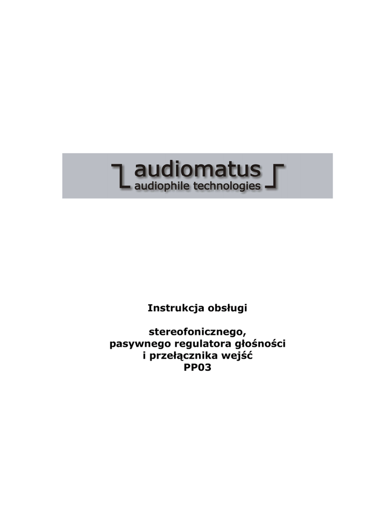 Instrukcja obsługi stereofonicznego, pasywnego regulatora głośności i przełącznika wejść PP03 1. Podziękowanie Dziękujemy za zakup pasywnego, stereofonicznego regulatora głośności i przełącznika źródeł sygnału Audiomatus PP03. Projektując i produkując to urządzenie dołoŜyliśmy wszelkich starań i mamy nadzieję, Ŝe zakup ten okaŜe się udany. 2. Oznakowania. Na spodzie obudowy PP03 znajduje się naklejka z numerem seryjnym i informacje o rodzaju zamontowanego w urządzeniu potencjometru i przełącznika źródeł sygnału. AL – potencjometr ALPS RK40 TK – potencjometr TKD CP2500 (lub 2511) PG – potencjometr Penny&Giles RF15 ST – przełącznik standardowy EL – przełącznik ELMA 3. Budowa przedwzmacniacza PP3. W niniejszej instrukcji opisując PP03 uŜywamy, popularnego wśród audiofilów, określenia przedwzmacniacz pasywny. Elementy urządzenia umieszczone są w solidnej, wysokiej jakości, doskonale chroniącej przed zakłóceniami obudowie. Stopień ekranowania musi być jak największy, aby zapewnić skuteczną ochronę przed wpływem zmiennych pól magnetycznych i elektrycznych, wymaganą przy precyzyjnej transmisji niewielkich sygnałów. 2 Płyta czołowa przedwzmacniacza, o wykonane całości są w grubości z 12mm, i jego aluminium. pokrętła, Obudowa PP03 dopasowana jest wymiarowo i wzorniczo do monobloków Audiomatus AM200 i AM250. W obudowie zamontowane są najwyŜszej złocone, jakości, izolowane najbardziej bezpośrednio teflonem, cenionych bez podwarstwy gniazda specjalistów RCA w niklu jednego tej z dziedzinie, amerykańskiej firmy Vampire Wire. W przedwzmacniaczu PP03 zastosowaliśmy przełącznik odłączający wszystkie, z masą włącznie, przewody od nie wykorzystywanych w danej chwili źródeł sygnału. Taki sposób przełączania wyklucza przenikanie zakłóceń z nieaktywnych wejść i minimalizuje ewentualne problemy z tzw. pętlą masy. Pomaga to w uzyskaniu najwyŜszej moŜliwej dynamiki całego szczegółów systemu nagrań. i odtwarzaniu Wszystkie najdrobniejszych połączenia wewnątrz PP03 wykonane są za pomocą wysokiej jakości przewodów audio, metodą punkt-punkt. 4. Warunki kompatybilności urządzeń systemu Aby przedwzmacniacz PP03 prawidłowo współdziałał z pozostałymi elementami systemu powinny być spełnione źródeł sygnału poniŜsze warunki: 1) znamionowe napięcia wyjściowe (odtwarzacz CD, SACD lub DVD, przetwornik cyfrowo analogowy, (minimum spełniany tuner, 1V), jest magnetofon) lub być nieco przez powinny wyŜsze. większość wynosić 2V Warunek ten współcześnie produkowanych urządzeń. 2) źródła sygnału powinny umoŜliwiać obciąŜenie impedancją 10 kiloomów. Warunek ten spełniany jest przez praktycznie wszystkie urządzenia, których stopień wyjściowy oparty 3 jest na półprzewodnikach. Niektóre źródła sygnału z lampowym stopniem wyjściowym mogą nie pokazać pełni swoich moŜliwości współpracując z PP03. Nie naleŜy jednak z góry zakładać, Ŝe uŜycie takiego źródła jest niemoŜliwe. 3) czułość wejść wzmacniaczy mocy powinna wynosić od 0,5 do 1V, dla sprawdzenie pełnego tego ich wysterowania. parametru w Prosimy instrukcji o obsługi wzmacniaczy mocy. 4) impedancja wejściowa wzmacniaczy mocy powinna być rzędu 100 kiloomów, sprawdzenie tego lub nieco parametru większa. w Prosimy instrukcji o obsługi wzmacniaczy mocy. Warunki trzeci i czwarty są spełnione przez monobloki Audiomatus AM200 i AM250. Wzmacniacze te są w pełni kompatybilne z przedwzmacniaczem pasywnym PP03. 5. Obsługa przedwzmacniacza pasywnego PP03 i konfiguracja systemu. Przedwzmacniacz pasywny PP03 wyposaŜony jest w trzy pary gniazd wejściowych RCA i jedną parę gniazd wyjściowych RCA. Patrz ryc. 1. Aktywne wejście wybieramy pokrętłem umieszczonym po prawej stronie płyty czołowej przedwzmacniacza. Pokrętło to ma trzy połoŜenia. Wybierając wejście z którego sygnał ma płynąć do wzmacniaczy mocy ustawiamy kreskę wskaźnikową tego pokrętła na godzinie 11, 12 lub 13. Patrz ryc. 3. 4 gniazda wyjściowe gniazda wejściowe 3 2 1 Ryc. 1. Elementy tylnej ścianki przedwzmacniacza. Pokrętło umieszczone po lewej stronie płyty czołowej jest regulatorem głośności. Patrz ryc. 2. JeŜeli kreska wskaźnikowa tego pokrętła znajdzie się na godzinie 6 to napięcia na wyjściach przedwzmacniacza będą najmniejsze. Zwiększamy głośność obracając tym pokrętłem w prawo, zgodnie z ruchem wskazówek zegara. Kąt obrotu tego pokrętła wynosi około 300 stopni. regulator głośności przełącznik wejść audiomatus audiophile technologies Ryc. 2. Płyta czołowa przedwzmacniacza1. 1 Wygląd płyty czołowej moŜe być nieco inny – w zaleŜności od wersji przedwzmacniacza 5 Przedwzmacniacz PP03 podłączyć naleŜy pomiędzy źródłami sygnału a wzmacniaczami (wzmacniaczem) mocy. Przedwzmacniacz umoŜliwia dołączenie trzech stereofonicznych źródeł sygnału i dwóch monofonicznych, lub jednego stereofonicznego, wzmacniacza mocy. Patrz ryc. 3. UŜycie źródeł sygnału o znamionowym napięciu wyjściowym 2V i wzmacniaczy mocy o czułości 0,5 do 1V umoŜliwi naleŜyte wysterowanie wzmacniaczy, nawet przy cichszych fragmentach nagrań. wybrane wejście 1 audiomatus audiophile technologies wybrane wejście 2 audiomatus audiophile technologies wybrane wejście 3 audiomatus audiophile technologies Ryc. 3. RóŜne połoŜenia przełącznika wejść. 6 źródło sygnału sygnał z innych źródeł PP03 Kanał 2 wzmacniacze mocy Ryc. 4. Przykładowe podłączenie przedwzmacniacza w systemie audio. 6. WAśNA UWAGA! Pełne dynamiki wykorzystanie systemu audio, dostępnej oraz mikrodynamiki uzyskanie i najlepszego moŜliwego w danym systemie brzmienia, wymaga zwrócenia bacznej uwagi na zakłócenia wnikające do systemu. Źródłem takich zakłóceń mogą być tzw. pętle masy utworzone przez przewody sygnałowe. Zakłócenia generowane w takich pętlach ma
