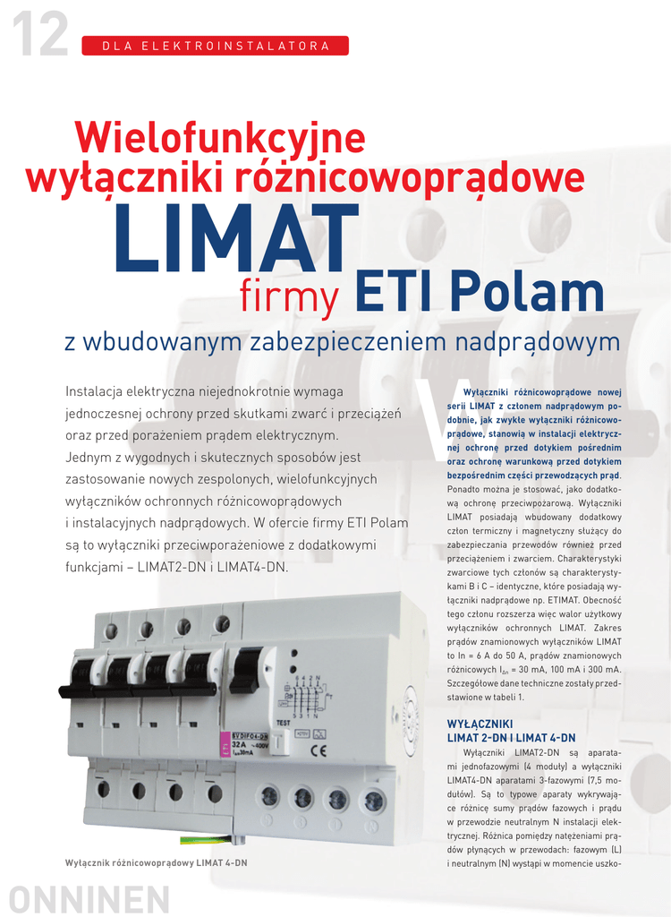 12 DL A ELEK TROINSTAL ATOR A Wielofunkcyjne wyłączniki różnicowoprądowe LIMAT firmy ETI Polam z wbudowanym zabezpieczeniem nadprądowym Instalacja elektryczna niejednokrotnie wymaga jednoczesnej ochrony przed skutkami zwarć i przeciążeń oraz przed porażeniem prądem elektrycznym. Jednym z wygodnych i skutecznych sposobów jest zastosowanie nowych zespolonych, wielofunkcyjnych wyłączników ochronnych różnicowoprądowych i instalacyjnych nadprądowych. W ofercie firmy ETI Polam są to wyłączniki przeciwporażeniowe z dodatkowymi funkcjami – LIMAT2-DN i LIMAT4-DN. W Wyłączniki różnicowoprądowe nowej serii LIMAT z członem nadprądowym podobnie, jak zwykłe wyłączniki różnicowoprądowe, stanowią w instalacji elektrycznej ochronę przed dotykiem pośrednim oraz ochronę warunkową przed dotykiem bezpośrednim części przewodzących prąd. Ponadto można je stosować, jako dodatkową ochronę przeciwpożarową. Wyłączniki LIMAT posiadają wbudowany dodatkowy człon termiczny i magnetyczny służący do zabezpieczania przewodów również przed przeciążeniem i zwarciem. Charakterystyki zwarciowe tych członów są charakterystykami B i C – identyczne, które posiadają wyłączniki nadprądowe np. ETIMAT. Obecność tego członu rozszerza więc walor użytkowy wyłączników ochronnych LIMAT. Zakres prądów znamionowych wyłączników LIMAT to In = 6 A do 50 A, prądów znamionowych różnicowych I Δn = 30 mA, 100 mA i 300 mA. Szczegółowe dane techniczne zostały przedstawione w tabeli 1. Wyłączniki LIMAT 2-DN i LIMAT 4-DN Wyłącznik różnicowoprądowy LIMAT 4-DN ONNINEN Wyłączniki LIMAT2-DN są aparatami jednofazowymi (4 moduły) a wyłączniki LIMAT4-DN aparatami 3-fazowymi (7,5 modułów). Są to typowe aparaty wykrywające różnicę sumy prądów fazowych i prądu w przewodzie neutralnym N instalacji elektrycznej. Różnica pomiędzy natężeniami prądów płynących w przewodach: fazowym (L) i neutralnym (N) wystąpi w momencie uszko- DL A ELEK TROINSTAL ATOR A dzenia izolacji: elementów odbiornika albo przewodów fazowych (znajdujących się pod napięciem), względnie przewodu neutralnego. Upływ prądów z przewodów zasilających nastąpi na skutek ich przepływu od miejsca uszkodzenia przez uziemiony przewód ochronny podłączony do części przewodzących, stanowiących osłony: odbiornika, a także sprzętu instalacyjnego. Różnica natężenia prądów większa od połowy znamionowego natężenia prądu różnicowego, powoduje odłączenie zasilania (napięcia) od chronionego obwodu. Wyłączniki ochronne LIMAT, jak wszystkie typowe wyłączniki różnicowoprądowe oprócz głównej dźwigni służącej do ich włączania i wyłączania posiadają na przedniej części przycisk T – test służący do okresowego (poprzez przyciśnięcie) spraw- zadziałanie wyłącznika (wyłączenie), kiedy napięcie pomiędzy przewodem N i PE przekroczy 45 V (+/- 10 V); zadziałanie (wyłączenie), kiedy nastąpi zamiana przewodu neutralnego N z przewodem ochronnym PE; zadziałanie (wyłączenie), kiedy nastąpi przerwanie przewodu neutralnego N lub ochronnego PE; identyfikacja przyczyny zadziałania wyłącznika za pomocą układu diod świecących LED – jest to największa funkcjonalna zaleta wyłączników LIMAT. W przypadku przerwania przewodu neutralnego N sieci zasilającej, napięcie główne na chronionym odbiorniku może przekroczyć napięcie fazowe 230 V. W przypadku zastosowania w tych Dane techniczne wyłączników różnicowoprądowych LIMAT Napięcie znamionowe Un 230V/400V AC Prądy znamionowe In 6A – 50A Znamionowe prądy różnicowe IΔn 30mA, 100mA, 300mA Znamionowa zdolność zwarciowa 10 kA dla In ≤ 40A, 6 kA dla In = 50A Typ wyzwalania A, AC Charkaterystyka wyzwalania BiC Stopień ochrony IP40 Pojemność zacisków 1-25mm2 max. 3 Nm. Szerokość LIMAT2-DN - 4mod., LIMAT4-DN -7,5 mod. Zgodność z normami PN-EN 61009, PN-IEC 61009 dzania poprawności działania wyłącznika po jego zainstalowaniu. Po wciśnięciu przycisku T, wyłącznik powinien odciąć zasilanie zabezpieczonego obwodu. Częstotliwość jego sprawdzania powinna być określona przez osobę instalującą wyłącznik różnicowoprądowy, gdyż zależy ona od rodzaju zabezpieczanego obiektu i występujących w nim warunków – temperatura, wilgoć, pył itd. Wyłączniki ochronne różnicowoprądowe LIMAT-DN posiadają ponadto dodatkowe funkcje, co czyni je aparatami bardziej funkcjonalnymi i niezbędnymi w zabezpieczaniu instalacji elektrycznych i ich obsługi w odróżnieniu od innych wyłączników różnicowoprądowych obecnych na rynku. Takimi dodatkowymi funkcjami są: zadziałanie wyłącznika (wyłączenie), kiedy napięcie w chronionej sieci wzrośnie do ok. 270 V (+/- 10 V); w w w . o n n i n e n . p l odbiornikach wyłącznika ochronnego LIMAT–DN, jako zabezpieczenia głównego, jego zadaniem jest natychmiastowe wyłączenie zasilania. Wyłącznik LIMAT-DN spowoduje wyłączenie zasilania, kiedy napięcie zasilające wzrośnie do ok. 270 V bez względu na przyczynę wzrostu tego napięcia. Po tym zadziałaniu świeci się górna czerwona dioda LED sygnalizując przyczynę zadziałania wyłącznika. W przypadku wzrostu prądu różnicowego (upływu) I Δn ponad wartość znamionową, wyłącznik oczywiście spowoduje natychmiastowe zadziałanie, przy czym na przedniej części wyłącznika nie będzie się świecić żadna dioda LED sygnalizująca przyczynę zadziałania wyłącznika. Wyłączniki LIMAT kontrolują również napięcie UN-PE pomiędzy przewodem neutral- 13 nym i ochronnym. Napięcie to może wzrosnąć np. na skutek zmiany rezystancji uziemienia ochronnego (uszkodzenie). Wyłącznik LIMAT spowoduje wyłączenie, gdy poziom napięcia UN-PE przekroczy 45 V a nie osiągnie poziomu niebezpiecznego napięcia dotyku 50 V. Po tym zadziałaniu nie będą się świecić diody sygnalizujące, że przyczyną zadziałania był wzrost nap