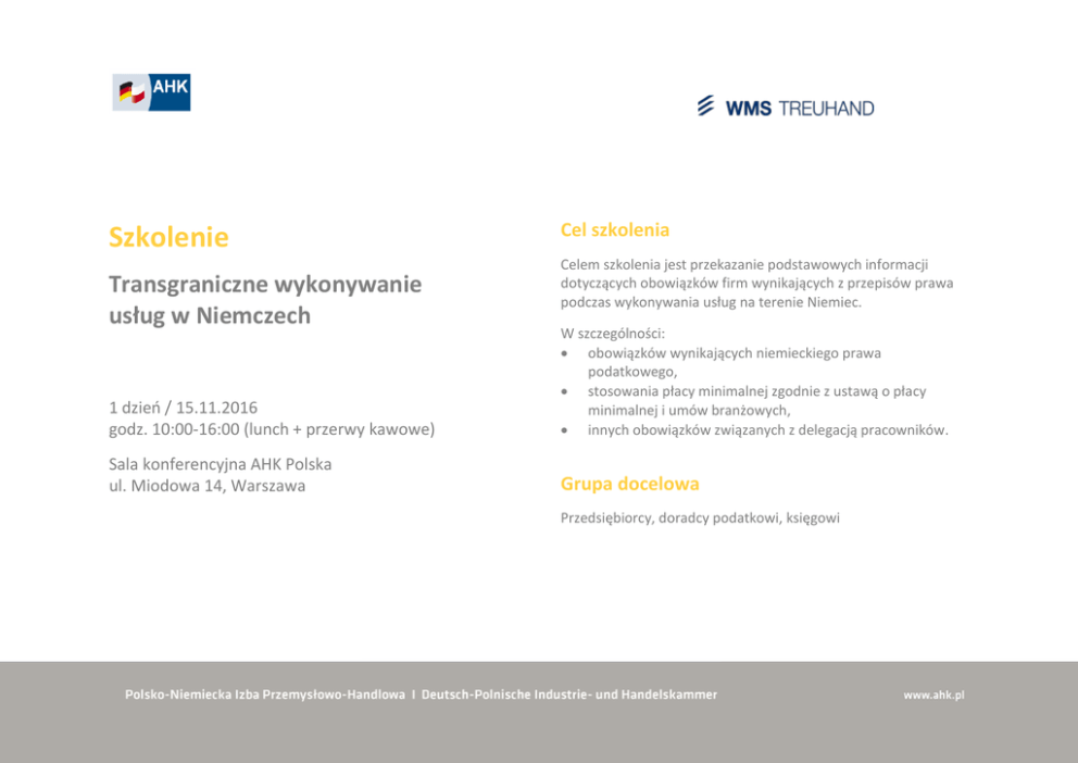 Szkolenie Transgraniczne wykonywanie usług w Niemczech Cel szkolenia Celem szkolenia jest przekazanie podstawowych informacji dotyczących obowiązków firm wynikających z przepisów prawa podczas wykonywania usług na terenie Niemiec. 1 dzień / 15.11.2016 godz. 10:00-16:00 (lunch + przerwy kawowe) W szczególności: obowiązków wynikających niemieckiego prawa podatkowego, stosowania płacy minimalnej zgodnie z ustawą o płacy minimalnej i umów branżowych, innych obowiązków związanych z delegacją pracowników. Sala konferencyjna AHK Polska ul. Miodowa 14, Warszawa Grupa docelowa Przedsiębiorcy, doradcy podatkowi, księgowi Program szkolenia 1. Podstawy wykonywania usług transgranicznych d. Inne obowiązki pracodawcy a. Prawo europejskie a prawo krajowe i. zgłoszenia pracowników do urzędu celnego, b. Wykonywanie prac / usług reglamentowanych ii. zgłoszenie do SOKA BAU i inne kasy urlopowe c. Wynajem pracowników czy umowa o dzieło e. Kontrola urzędu celnego 2. Delegacja pracowników 3. Opodatkowanie zakładów podatkowych a. Prawo pracy: Obowiązywanie płacy minimalnej, umowy a. Powstanie zakładu podatkowego taryfowe b. Budowa, miejsce montażu jako zakład podatkowy b. Opodatkowanie pracowników c. Przedstawiciel handlowy jako zakład podatkowy c. Ubezpieczenia społeczne d. Obowiązki wynikające z istnienia zakładu podatkowego i. Art 12 czy Art 13 Dyrektywy 883 e. Likwidacja zakładu podatkowego ii. Zaświadczenie A1 i jego konsekwencje lub ich brak dla 4. Podatek u źródła niemieckich urzędów a. Obowiązek odprowadzenia podatku u źródła w Polsce b. Podatek u źródła jeżeli koszty obciążają zakład podatkowy c. Niemieckie podatki u źródła / Podatek budowlany Prelegent 5. VAT Stosowanie odwrotnego obciążenia przy wykonywaniu Paweł Suliga – Steuerberater (DE), Doradca Podatkowy usług transgranicznych (z uwzględnieniem zmian od 01.01.2017) nr. 12915 (PL). Jest dyrektorem „PolenDesk“ w kancelarii WMS Treuhand GbR w Osnabrück. Ukończył Akademię Ekonomiczną w Krakowie, jest doktorantem na wydziale Prawa Uniwersytetu Śląskiego w Katowicach. Od ponad 10 lat zajmuje się prawem podatkowym, ze specjalizacją w międzynarodowym prawie podatkowym, a w szczególności w opodatkowaniu transakcji transgranicznych podatkiem dochodowym oraz podatkiem VAT. Jest autorem i współautorem podatkowych publikacji prasowych i książkowych. a. Odwrotne obciążenie dla usług na nieruchomościach zgodnie z Art 47 Dyrektywy 2006/12/WE b. Odwrotne obciążenie dla dostaw towarów z montażem zgodnie z Art 36 Dyrektywy 2006/12/WE