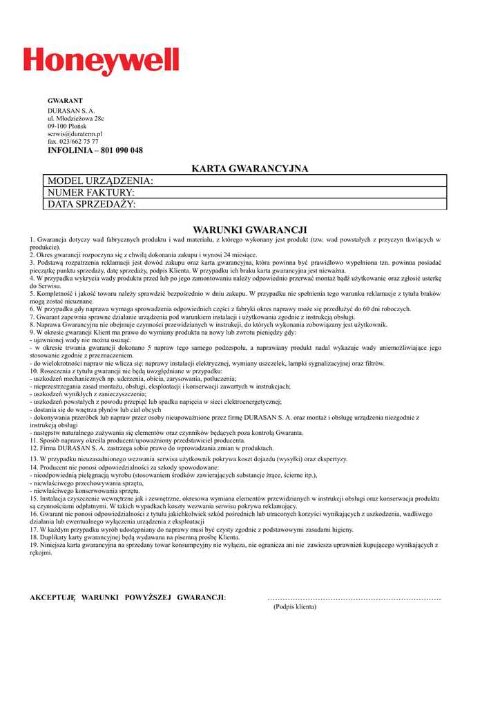 GWARANT DURASAN S. A. ul. Młodzieżowa 28c 09-100 Płońsk [email protected] fax. 023/662 75 77 INFOLINIA – 801 090 048 KARTA GWARANCYJNA MODEL URZĄDZENIA: NUMER FAKTURY: DATA SPRZEDAŻY: WARUNKI GWARANCJI 1. Gwarancja dotyczy wad fabrycznych produktu i wad materiału, z którego wykonany jest produkt (tzw. wad powstałych z przyczyn tkwiących w produkcie). 2. Okres gwarancji rozpoczyna się z chwilą dokonania zakupu i wynosi 24 miesiące. 3. Podstawą rozpatrzenia reklamacji jest dowód zakupu oraz karta gwarancyjna, która powinna być prawidłowo wypełniona tzn. powinna posiadać pieczątkę punktu sprzedaży, datę sprzedaży, podpis Klienta. W przypadku ich braku karta gwarancyjna jest nieważna. 4. W przypadku wykrycia wady produktu przed lub po jego zamontowaniu należy odpowiednio przerwać montaż bądź użytkowanie oraz zgłosić usterkę do Serwisu. 5. Kompletność i jakość towaru należy sprawdzić bezpośrednio w dniu zakupu. W przypadku nie spełnienia tego warunku reklamacje z tytułu braków mogą zostać nieuznane. 6. W przypadku gdy naprawa wymaga sprowadzenia odpowiednich części z fabryki okres naprawy może się przedłużyć do 60 dni roboczych. 7. Gwarant zapewnia sprawne działanie urządzenia pod warunkiem instalacji i użytkowania zgodnie z instrukcją obsługi. 8. Naprawa Gwarancyjna nie obejmuje czynności przewidzianych w instrukcji, do których wykonania zobowiązany jest użytkownik. 9. W okresie gwarancji Klient ma prawo do wymiany produktu na nowy lub zwrotu pieniędzy gdy: - ujawnionej wady nie można usunąć. - w okresie trwania gwarancji dokonano 5 napraw tego samego podzespołu, a naprawiany produkt nadal wykazuje wady uniemożliwiające jego stosowanie zgodnie z przeznaczeniem. - do wielokrotności napraw nie wlicza się: naprawy instalacji elektrycznej, wymiany uszczelek, lampki sygnalizacyjnej oraz filtrów. 10. Roszczenia z tytułu gwarancji nie będą uwzględniane w przypadku: - uszkodzeń mechanicznych np. uderzenia, obicia, zarysowania, potłuczenia; - nieprzestrzegania zasad montażu, obsługi, eksploatacji i konserwacji zawartych w instrukcjach; - uszkodzeń wynikłych z zanieczyszczenia; - uszkodzeń powstałych z powodu przepięć lub spadku napięcia w sieci elektroenergetycznej; - dostania się do wnętrza płynów lub ciał obcych - dokonywania przeróbek lub napraw przez osoby nieupoważnione przez firmę DURASAN S. A. oraz montaż i obsługę urządzenia niezgodnie z instrukcją obsługi - następstw naturalnego zużywania się elementów oraz czynników będących poza kontrolą Gwaranta. 11. Sposób naprawy określa producent/upoważniony przedstawiciel producenta. 12. Firma DURASAN S. A. zastrzega sobie prawo do wprowadzania zmian w produktach. 13. W przypadku nieuzasadnionego wezwania serwisu użytkownik pokrywa koszt dojazdu (wysyłki) oraz ekspertyzy. 14. Producent nie ponosi odpowiedzialności za szkody spowodowane: - nieodpowiednią pielęgnacją wyrobu (stosowaniem środków zawierających substancje żrące, ścierne itp.), - niewłaściwego przechowywania sprzętu, - niewłaściwego konserwowania sprzętu. 15. Instalacja czyszczenie wewnętrzne jak i zewnętrzne, okresowa wymiana elementów przewidzianych w instrukcji obsługi oraz konserwacja produktu są czynnościami odpłatnymi. W takich wypadkach koszty wezwania serwisu pokrywa reklamujący. 16. Gwarant nie ponosi odpowiedzialności z tytułu jakichkolwiek szkód pośrednich lub utraconych korzyści wynikających z uszkodzenia, wadliwego działania lub ewentualnego wyłączenia urządzenia z eksploatacji 17. W każdym przypadku wyrób udostępniany do naprawy musi być czysty zgodnie z podstawowymi zasadami higieny. 18. Duplikaty karty gwarancyjnej będą wydawana na pisemną prośbę Klienta. 19. Niniejsza karta gwarancyjna na sprzedany towar konsumpcyjny nie wyłącza, nie ogranicza ani nie zawiesza uprawnień kupującego wynikających z rękojmi. AKCEPTUJĘ WARUNKI POWYŻSZEJ GWARANCJI: …………………………………………………………… (Podpis klienta)