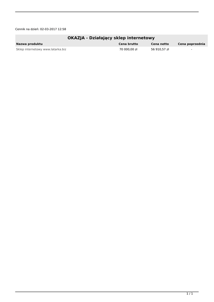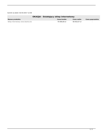 Cennik na dzień: 02-03-2017 12:58 OKAZJA - Działający sklep internetowy Nazwa produktu Cena brutto Cena netto Cena poprzednia Sklep internetowy www.latarka.biz 70 000,00 zł 56 910,57 zł - 1/1 Powered by TCPDF (www.tcpdf.org)
