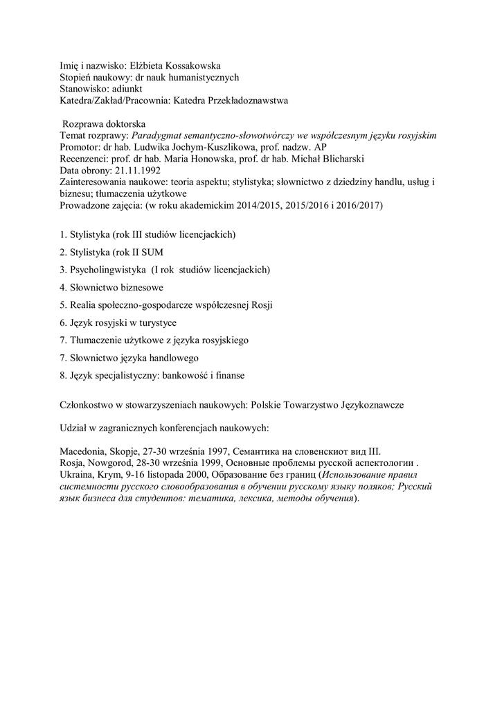 Imię i nazwisko: Elżbieta Kossakowska Stopień naukowy: dr nauk humanistycznych Stanowisko: adiunkt Katedra/Zakład/Pracownia: Katedra Przekładoznawstwa Rozprawa doktorska Temat rozprawy: Paradygmat semantyczno-słowotwórczy we współczesnym języku rosyjskim Promotor: dr hab. Ludwika Jochym-Kuszlikowa, prof. nadzw. AP Recenzenci: prof. dr hab. Maria Honowska, prof. dr hab. Michał Blicharski Data obrony: 21.11.1992 Zainteresowania naukowe: teoria aspektu; stylistyka; słownictwo z dziedziny handlu, usług i biznesu; tłumaczenia użytkowe Prowadzone zajęcia: (w roku akademickim 2014/2015, 2015/2016 i 2016/2017) 1. Stylistyka (rok III studiów licencjackich) 2. Stylistyka (rok II SUM 3. Psycholingwistyka (I rok studiów licencjackich) 4. Słownictwo biznesowe 5. Realia społeczno-gospodarcze współczesnej Rosji 6. Język rosyjski w turystyce 7. Tłumaczenie użytkowe z języka rosyjskiego 7. Słownictwo języka handlowego 8. Język specjalistyczny: bankowość i finanse Członkostwo w stowarzyszeniach naukowych: Polskie Towarzystwo Językoznawcze Udział w zagranicznych konferencjach naukowych: Macedonia, Skopje, 27-30 września 1997, Семантика на словенскиот вид III. Rosja, Nowgorod, 28-30 września 1999, Основные проблемы русской аспектологии . Ukraina, Krym, 9-16 listopada 2000, Образование без границ (Использование правил системности русского словообразования в обучении русскому языку поляков; Русский язык бизнеса для студентов: тематика, лексика, методы обучения). Ukraina, Krym, 15-23 maja 2001, Образование без границ (Профессиональная карьера учителя в польской реформе образования). Niemcy, Hamburg, 28-31 czerwca 2001, Славянский вид, славянская лексикография (Nomina abstracta в толковом словаре современного русского языка). Ukraina, Odessa, 10-11 października 2003, Русистика и современность VI. Uniwersytet Ekonomiczny w Katowicach, Międzywydziałowe Centrum Języków obcych, 1920.06.2015. Konferencja Naukowo-Edukacyjna: Języki specjalistyczne w badaniach i praktyce: doświadczenia, horyzonty, wyzwania. - monografie we współautorstwie z L. Jochym-Kuszlikową: Słowotwórstwo rosyjskie dla Polaków, WSiP Warszawa 1990, 192 s. - artykuły Paradygmaty słowotwórcze z centrum przymiotnikowym o znaczeniu cech psychiki człowieka w języku rosyjskim i polskim [w:] Rocznik Naukowo-Dydaktyczny WSP w Krakowie, zeszyt 116, Prace Rusycystyczne VII, Kraków 1987, s. 165-181. Znaczenie strukturalne a znaczenie leksykalne w nazwach nosicieli cech [w:] Rocznik Naukowo-Dydaktyczny WSP w Krakowie, zeszyt 149, Prace Rusycystyczne VIII, Kraków 1992, s. 133-144. Struktura semantyczna odrzeczownikowego paradygmatu słowotwórczego [w:] Semantyka i pragmatyka w opisie języków słowiańskich, (red.) M. Blicharski, H. Fontański, UŚ Katowice 1993, ss. 109-114. we współautorstwie z M. Nowakowską: La complétude et l`incomplétude des syntagmes nominaux abstraits en français et en russe [w:] Neophilologica, tom 11, Studia Językoznawcze, (red.) W. Banyś, Katowice 1995, s. 90-102. Motywacja modyfikacyjna a motywacja mutacyjna w rosyjskich czasownikach prefigowanych, „Slavia Orientalis”, tom XLVI, Nr 2, Rok 1997, s. 275-284. Вид в девербальных абстрактных именах существительных [w:] Семантика на словенскиот вид III, (ред.) С. Каролак, Љ. Спасов, Скопjе 1998, s. 29-32. Z historii polsko-rosyjskiej leksykografii. “Словарь россiйско-польскiй” Antoniego Jakubowicza z roku 1825 [w:] Sprawozdania z Posiedzeń Naukowych Komisji Słowianoznawstwa PAN, oddz. Kraków, T. 44, z. 1 (2000), s. 82-86. Вид в отвлечённых названиях действия (на материале романа М. А. Булгакова “Мастер и Маргарита”) [w:] Основные проблемы русской аспектологии, СанктПетербург 2002, s. 114-118. К вопросу о виде отвлечённых существительных (на материале романа “Лолита” В. Набокова [w:] Мова. Науково-теоретичний часопис, 8, 2003, Одесса, 126-128. Aspekt odczasownikowych rzeczowników abstrakcyjnych w języku rosyjskim [w:] Annales Universitatis Paedagogicae Cracoviensis, Studia Russologica II, (red.) D. Dziewanowska, B. Stawarz, T. Żeberek, Wydawnictwo Uniwersytetu Pedagogicznego, Kraków 2009, s. 60-64. О нескольких механизмах образования русскх экономических терминов [w:] Annales Universitatis Paedagogicae Cracoviensis, Studia Russologica VIII, (red.) H. Chodurska, D. Dziewanowska, B. Stawarz, Wydawnictwo Uniwersytetu Pedagogicznego, Kraków15 s. 2126. - słowniki we współautorstwie z L. Jochym-Kuszlikową i S. Stawarzem: Polsko-rosyjski słownik handlowy, Wydawnictwo Naukowe PWN, Warszawa-Kraków 1995, 384 s. we współautorstwie z L. Jochym-Kuszlikową: Rosyjsko-polski słownik handlowy, Wydawnictwo Naukowe PWN, Warszawa-Kraków 1996, 652 s. we współautorstwie z L. Jochym-Kuszlikową: Słownik rosyjsko-polski. Biznes i gospodarka, Wydawnictwo Naukowe PWN, Warszawa 2009, 638 s. we współautorstwie z L. Jochym-Kuszlikową: Słownik polsko-rosyjski. Biznes i gospodarka, Wydawnictwo Naukowe PWN, Warszawa 2009, 591 s. - recenzje Rec.: Rosyjski wyraz. Słownik naukowo-dydaktyczny, (red.) J. Lukszyn, PWN Warszawa 1988, s. 616, „Slavia Orientalis”, tom XL, Nr 1-2, Rok 1991, s. 215-218. Rec.: И.С. Алесеев