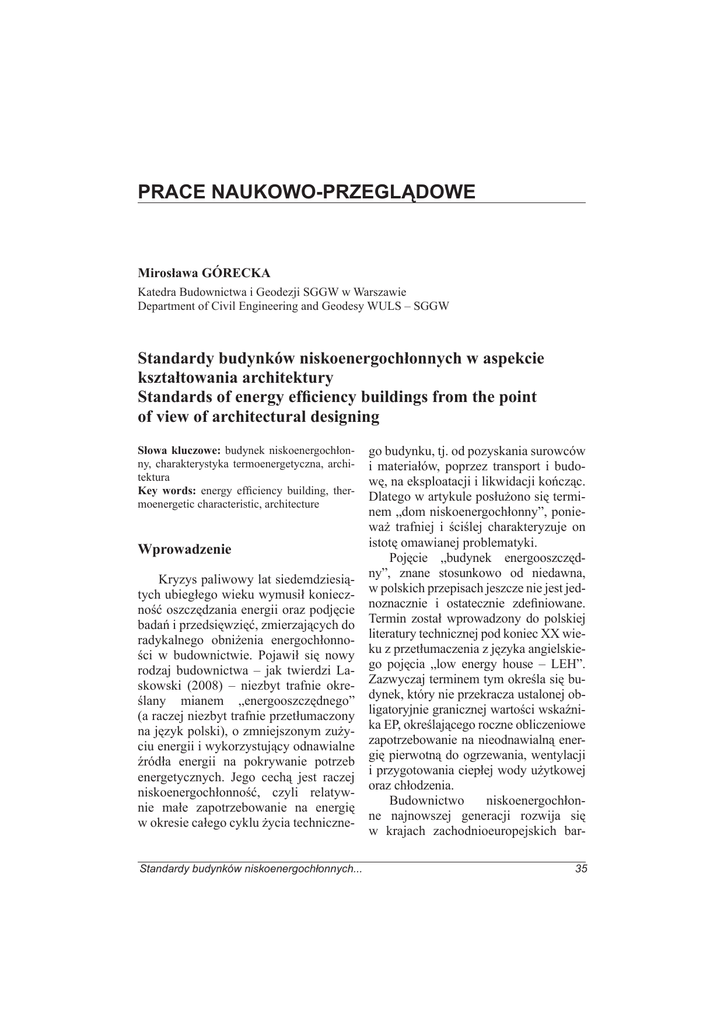 PRACE NAUKOWO-PRZEGLĄDOWE Mirosława GÓRECKA Katedra Budownictwa i Geodezji SGGW w Warszawie Department of Civil Engineering and Geodesy WULS – SGGW Standardy budynków niskoenergochłonnych w aspekcie kształtowania architektury Standards of energy efficiency buildings from the point of view of architectural designing Słowa kluczowe: budynek niskoenergochłonny, charakterystyka termoenergetyczna, architektura Key words: energy efficiency building, thermoenergetic characteristic, architecture Wprowadzenie Kryzys paliwowy lat siedemdziesiątych ubiegłego wieku wymusił konieczność oszczędzania energii oraz podjęcie badań i przedsięwzięć, zmierzających do radykalnego obniżenia energochłonności w budownictwie. Pojawił się nowy rodzaj budownictwa – jak twierdzi Laskowski (2008) – niezbyt trafnie określany mianem „energooszczędnego” (a raczej niezbyt trafnie przetłumaczony na język polski), o zmniejszonym zużyciu energii i wykorzystujący odnawialne źródła energii na pokrywanie potrzeb energetycznych. Jego cechą jest raczej niskoenergochłonność, czyli relatywnie małe zapotrzebowanie na energię w okresie całego cyklu życia techniczneStandardy budynków niskoenergochłonnych... go budynku, tj. od pozyskania surowców i materiałów, poprzez transport i budowę, na eksploatacji i likwidacji kończąc. Dlatego w artykule posłużono się terminem „dom niskoenergochłonny”, ponieważ trafniej i ściślej charakteryzuje on istotę omawianej problematyki. Pojęcie „budynek energooszczędny”, znane stosunkowo od niedawna, w polskich przepisach jeszcze nie jest jednoznacznie i ostatecznie zdefiniowane. Termin został wprowadzony do polskiej literatury technicznej pod koniec XX wieku z przetłumaczenia z języka angielskiego pojęcia „low energy house – LEH”. Zazwyczaj terminem tym określa się budynek, który nie przekracza ustalonej obligatoryjnie granicznej wartości wskaźnika EP, określającego roczne obliczeniowe zapotrzebowanie na nieodnawialną energię pierwotną do ogrzewania, wentylacji i przygotowania ciepłej wody użytkowej oraz chłodzenia. Budownictwo niskoenergochłonne najnowszej generacji rozwija się w krajach zachodnioeuropejskich bar35 dzo dynamicznie w nowych kierunkach, które w Polsce są niedoceniane, a nawet w ogóle nieznane. Najnowszym trendem jest zminimalizowanie do zera ilości energii dostarczanej z zewnątrz w fazie eksploatacji budynku. Dalszy postęp w zakresie realizacji budownictwa niskoenergochłonnego wyraża się dążeniem do projektowania domów w jak największym stopniu energetycznie samowystarczalnych poprzez rozwiązania wykorzystujące w sposób zrównoważony zasoby szeroko pojętego środowiska. W artykule scharakteryzowano katagorie budynków uzależnione od charakterystyki termoenergetycznej oraz ich wpływ na architekturę, co wiąże się z trudniejszymi do oceny zagadnieniami kontrowersyjnymi estetyczno-formalnymi. Metoda badań Artykuł ma charakter raportu z autorskiej pracy naukowo-badawczej, dotyczącej zagadnienia związanego z niskoenergochłonnym domem wiejskim. Ze względu na rodzaj podjętego problemu oparty jest na badaniach pośrednich. Wykorzystują one metodę monograficzną, polegającą na krytycznej analizie literatury przedmiotu, obejmują tematykę dotyczącą kształtowania budynku niskoenergochłonnego w kontekście architektury. W badaniach wykorzystano również metodę badawczą – studium przypadku (case study), pozwalającą wyciągnąć wnioski odnoszące się do cech wybranych i charakteryzowanych budynków, ich uwarunkowań technicznych oraz innych przyczyn i rezultatów dotyczących ich funkcjonowania. Ten opis ma na celu 36 wskazanie koncepcji, które warto stosować, oraz możliwych błędów, których należy unikać. Cechy tej metody to nierutynowy sposób myślenia, generujący alternatywne rozwiązania, oraz analizowanie zagadnienia w szerszym kontekście. W niniejszym artykule „case study” dotyczy reprezentatywnych domów niskoenergochłonnych zrealizowanych w różnych standardach energetycznych, uwzględniając kształtowanie elementów funkcjonalno-przestrzennych. Klasyfikacja kategorii budynków niskoenergochłonnych ze względu na ich charakterystykę termoenergetyczną Laskowski (2008), w celu ujednolicenia terminologii oraz ułatwienia dokonywania oceny charakterystyki termoenergetycznej, proponuje podział budynków mieszkalnych na kategorie uzależnione od wartości współczynnika E (tab. 1). Od 2009 roku obowiązuje w Polsce wspomniany wcześniej wskaźnik EP. Zaproponowana klasyfikacja odnosi się bezpośrednio do sezonowego zapotrzebowania na ciepło, w której za poziom odniesienia przyjęto graniczne wartości wskaźnika E0, jako kryterium prawnie obowiązujące. Charakterystyka energetycznych standardów budownictwa obejmuje budynki: substandardowe (BUSS), standardowe (BUST), o racjonalnej charakterystyce termoenergetycznej (BURT) oraz o zminimalizowanych potrzebach cieplnych (BUMQ). Budynek substandardowy (BUSS) reprezentuje obiekty, których jakość ochrony cieplej z różnych względów M. Górecka TABELA 1. Klasyfikacja budynków mieszkalnych ze względu na ich charakterystykę termoenergetyczną TABLE 1. Classification of dwelling houses on account of their thermoenergetic characteristic Nazwa kategorii Charakterystyka termoenergetyczna Name of category Thermoenergetic characteristic Budynek substandardowy E > 1,3E0 Substandard building Budynek standardowy E ≈ E0 Standard building Budynek o racjonalnej charakte- Budynek superizolowany E ≤ 0,5E0 rystyce termoenergetycznej Superisolated building E → E rac ≤ 0,7E0 Building of rational thermoener- Budynek helioaktywny E ≤ 0,4E0 getic characteristic Helioactive building Budynek o zminimalizowanych potrzebach cieplnych Building with minimalised heat needs Budynek bez ogrzewania Building without heating Budynek autarkiczny Autarkic house nie przystaje do pojęcia domów nisk
