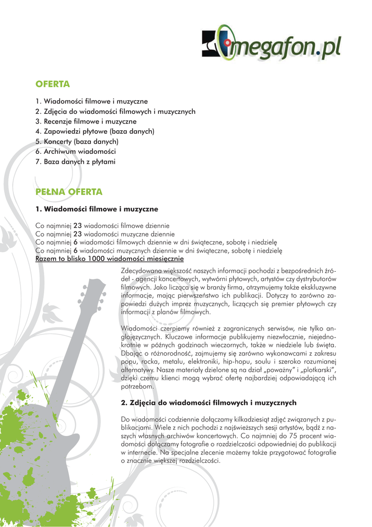 OFERTA 1. 2. 3. 4. 5. 6. 7. Wiadomości filmowe i muzyczne Zdjęcia do wiadomości filmowych i muzycznych Recenzje filmowe i muzyczne Zapowiedzi płytowe (baza danych) Koncerty (baza danych) Archiwum wiadomości Baza danych z płytami PEŁNA OFERTA 1. Wiadomości filmowe i muzyczne Co najmniej 23 wiadomości filmowe dziennie Co najmniej 23 wiadomości muzyczne dziennie Co najmniej 6 wiadomości filmowych dziennie w dni świąteczne, sobotę i niedzielę Co najmniej 6 wiadomości muzycznych dziennie w dni świąteczne, sobotę i niedzielę Razem to blisko 1000 wiadomości miesięcznie Zdecydowana większość naszych informacji pochodzi z bezpośrednich źródeł - agencji koncertowych, wytwórni płytowych, artystów czy dystrybutorów filmowych. Jako licząca się w branży firma, otrzymujemy także ekskluzywne informacje, mając pierwszeństwo ich publikacji. Dotyczy to zarówno zapowiedzi dużych imprez muzycznych, liczących się premier płytowych czy informacji z planów filmowych. Wiadomości czerpiemy również z zagranicznych serwisów, nie tylko anglojęzycznych. Kluczowe informacje publikujemy niezwłocznie, niejednokrotnie w późnych godzinach wieczornych, także w niedziele lub święta. Dbając o różnorodność, zajmujemy się zarówno wykonawcami z zakresu popu, rocka, metalu, elektroniki, hip-hopu, soulu i szeroko rozumianej alternatywy. Nasze materiały dzielone są na dział „poważny” i „plotkarski”, dzięki czemu klienci mogą wybrać ofertę najbardziej odpowiadającą ich potrzebom. 2. Zdjęcia do wiadomości filmowych i muzycznych Do wiadomości codziennie dołączamy kilkadziesiąt zdjęć związanych z publikacjami. Wiele z nich pochodzi z najświeższych sesji artystów, bądź z naszych własnych archiwów koncertowych. Co najmniej do 75 procent wiadomości dołączamy fotografie o rozdzielczości odpowiedniej do publikacji w internecie. Na specjalne zlecenie możemy także przygotować fotografie o znacznie większej rozdzielczości. 3. Recenzje filmowe i muzyczne 20 recenzji filmowych 30 recenzji muzycznych Naszą ofertę uzupełniają recenzje płyt, zarówno polskich jak i zagranicznych wykonawców oraz recenzje premier filmowych. W tej chwili dostarczamy około 20 recenzji filmowych, z których większość publikowana jest przed kinową premierą tytułu. Przygotowujemy również 30 recenzji muzycznych miesięcznie. W przypadku głośno zapowiadanych premier płytowych i liczących się, popularnych wykonawców, recenzje pojawiają się w dniu premiery dzieła. Na życzenie chętnie dostarczamy recenzje wydawnictw DVD. 4. Zapowiedzi muzyczne (baza danych) Oferujemy dostęp do bazy nowości płytowych - gwarantujemy dostarczanie miesięcznie co najmniej 300 płyt, wśród których znajdują się kluczowe wydawnictwa najważniejszych wydawców zagranicznych oraz większość płyt wydawanych w Polsce - baza aktualizowana jest 24 h na dobę. Dostarczane dane: nazwa wykonawcy tytuł płyty data premiery na świecie data premiery w Polsce wydawca na świecie wydawca w Polsce numer katalogowy gatunek (rock, pop, rnb&hip-hop, metal, elektronika, alternatywa) styl muzyczny (grunge, post-punk, death metal itd.) rodzaj wydawnictwa (CD, Live, Kompilacja, Remiks, Reedycja, LP, EP itp.) lista utworów z czasem trwania lista muzyków (opcjonalnie) okładka w dowolnym formacie 5. Zapowiedzi koncertowe (baza danych) Oferujemy dostęp do bazy koncertów - gwarantujemy dostarczanie miesięcznie informacji o co najmniej 1000 koncertach, wśród których znajdują się kluczowe imprezy wykonawców zagranicznych i polskich - baza aktualizowana jest 24 h na dobę. Dostarczane dane: nazwa wykonawcy (nazwa imprezy) lista wykonawców (supportów) miejscowość (miasto) miejsce (klub) data(y) godzina koncertu godzina otwarcia bram cena biletów organizator opis imprezy foto w dowolnym formacie 6. Archiwum wiadomości W naszym archiwum znajduje się blisko 100 tysięcy wiadomości i niemal 3500 recenzji. Teksty te obejmują wszystkie zjawiska show-biznesu z lat 2001-2011 i mogą być podstawą do tworzenia profesjonalnych serwisów rozrywkowych. Cena archiwum jest bardzo przestępna. 7. Baza danych z płytami W naszych zasobach posiadamy bazę danych płyt. W tej chwili jest to około 15 tysięcy tytułów. nazwa wykonawcy tytuł płyty data premiery na świecie data premiery w Polsce wydawca na świecie wydawca w Polsce numer katalogowy gatunek (rock, pop, rnb&hip-hop, metal, elektronika, alternatywa) styl muzyczny (grunge, post-punk, death metal itd.) rodzaj wydawnictwa (CD, Live, Kompilacja, Remiks, Reedycja, LP, EP itp.) lista utworów z czasem trwania lista muzyków (opcjonalnie) okładka w dowolnym formacie Uzupełniana na bieżąco baza danych płyt może być podstawą tworzenia profesjonalnych serwisów rozrywkowych. Cena bazy płytowej jest bardzo przestępna. TECHNOLOGIA Każdy z naszych klientów otrzymuje dostęp do dedykowanego serwera FTP, na którym znajdują się zamówione materiały. Pliki tekstowe dostarczamy w formacie XML dowolnie modyfikowanym na życzenie klienta. W plikach XML znajdują się także tagi umożliwiające segregowanie wiadomości. Alternatywą są pliki tekstowe (txt). Zdjęcia dostarczamy w formacie jpg. Dla potrzeb mediów internetowych pliki nie przekraczają 30 kB. Dla prasy dostarczamy zdjęcia o rozdzielczości umożliwiającej drukowanie. FIRMA Agencja Informacyjna Megafon.pl powstała w 2002 roku. Naszym celem było stworzenie wiarygodnego i najszybszego źródła informacji dla rozwijającego się w Polsce rynku medialnego show-biznesu. Jak wynika z badań Instytutu Monitorowania Mediów, Megafon.Pl jest jednym z najczęściej cytowanych mediów internetowych. W marcu 2010 roku nasza firma znalazła się na czwartej pozycji w rankingu sporządzanym przez IMM. Szczegółowy raport można zobaczyć na stronach Instytutu (http://www.instytut.com.pl/ IMM/o_firmie/raport_krotki_media_marzec10.pdf). ZAŁOGA Megafon.Pl to dziennik