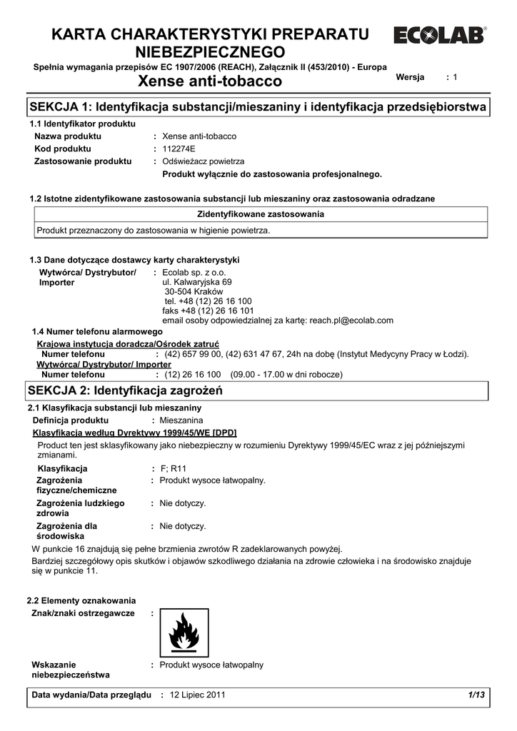KARTA CHARAKTERYSTYKI PREPARATU NIEBEZPIECZNEGO Spełnia wymagania przepisów EC 1907/2006 (REACH), Załącznik II (453/2010) - Europa Xense anti-tobacco Wersja : 1 SEKCJA 1: Identyfikacja substancji/mieszaniny i identyfikacja przedsiębiorstwa 1.1 Identyfikator produktu Nazwa produktu Kod produktu Zastosowanie produktu : Xense anti-tobacco : 112274E : Odświeżacz powietrza Produkt wyłącznie do zastosowania profesjonalnego. 1.2 Istotne zidentyfikowane zastosowania substancji lub mieszaniny oraz zastosowania odradzane Zidentyfikowane zastosowania Produkt przeznaczony do zastosowania w higienie powietrza. 1.3 Dane dotyczące dostawcy karty charakterystyki Wytwórca/ Dystrybutor/ : Ecolab sp. z o.o. ul. Kalwaryjska 69 Importer 30-504 Kraków tel. +48 (12) 26 16 100 faks +48 (12) 26 16 101 email osoby odpowiedzialnej za kartę: [email protected] 1.4 Numer telefonu alarmowego Krajowa instytucja doradcza/Ośrodek zatruć Numer telefonu : (42) 657 99 00, (42) 631 47 67, 24h na dobę (Instytut Medycyny Pracy w Łodzi). Wytwórca/ Dystrybutor/ Importer Numer telefonu : (12) 26 16 100 (09.00 - 17.00 w dni robocze) SEKCJA 2: Identyfikacja zagrożeń 2.1 Klasyfikacja substancji lub mieszaniny Definicja produktu : Mieszanina Klasyfikacja według Dyrektywy 1999/45/WE [DPD] Product ten jest sklasyfikowany jako niebezpieczny w rozumieniu Dyrektywy 1999/45/EC wraz z jej późniejszymi zmianami. Klasyfikacja : F; R11 Zagrożenia : Produkt wysoce łatwopalny. fizyczne/chemiczne Zagrożenia ludzkiego : Nie dotyczy. zdrowia Zagrożenia dla : Nie dotyczy. środowiska W punkcie 16 znajdują się pełne brzmienia zwrotów R zadeklarowanych powyżej. Bardziej szczegółowy opis skutków i objawów szkodliwego działania na zdrowie człowieka i na środowisko znajduje się w punkcie 11. 2.2 Elementy oznakowania Znak/znaki ostrzegawcze Wskazanie niebezpieczeństwa : : Produkt wysoce łatwopalny Data wydania/Data przeglądu : 12 Lipiec 2011 1/13 Xense anti-tobacco SEKCJA 2: Identyfikacja zagrożeń Określenie zagrożenia Warunki bezpiecznego stosowania 2.3 Inne zagrożenia Inne zagrożenia nie odzwierciedlone w klasyfikacji : R11- Produkt wysoce łatwopalny. : S2- Chronić przed dziećmi. S16- Nie przechowywać w pobliżu źródeł zapłonu - nie palić tytoniu. : Nie dotyczy. SEKCJA 3: Skład/informacja o składnikach 3.2 Mieszaniny Klasyfikacja Nazwa produktu/składnika Etanol Alkohole Propan-2-ol Identyfikatory % 67/548/EWG Rozporządzenie (WE) Nr 1272/2008 [CLP] WE: 200-578-6 CAS: 64-17-5 Indeks: 603-002-00-5 WE: 200-659-6 CAS: 67-56-1 Indeks: 603-001-00-X 50-75 F; R11 <3 F; R11 T; R23/24/25, R39/23/24/25 RRN: 01-211945755825 WE: 200-661-7 CAS: 67-63-0 Indeks: 603-117-00-0 1-5 F; R11 Flam. Liq. 2, H225 Skin Irrit. 2, H315 Eye Irrit. 2, H319 Flam. Liq. 2, H225 Acute Tox. 3, H301 Acute Tox. 3, H311 Acute Tox. 3, H331 Skin Irrit. 2, H315 Eye Irrit. 2, H319 STOT SE 1, H370 Flam. Liq. 2, H225 Xi; R36 R67 Eye Irrit. 2, H319 STOT SE 3, H336 Typ [2] [1] [2] [1] [2] W punkcie 16 Pełny tekst uwag H jak znajdują się pełne powyżej podano w brzmienia zwrotów R punkcie 16. zadeklarowanych powyżej. Nie zawiera więcej składników, które w świetle obecnej wiedzy dostawcy oraz w danym stężeniu są klasyfikowane jako niebezpieczne dla zdrowia i otoczenia, nie ma więc wymogu wymieniania ich w niniejszym ustępie. Typ [1] Substancja sklasyfikowana jako szkodliwa dla zdrowia lub środowiska [2] Substancja, dla której wyznaczono dpouszczalne stężenie w środowisku pracy [3] Substancja spełnia kryteria dla jej zaklasyfikowania jako PBT zgodnie z Rozporządzeniem (WE) Nr 1907/2006, Aneks XIII [4] Substancja spełnia kryteria dla jej zaklasyfikowania jako vPvB zgodnie z Rozporządzeniem (WE) Nr 1907/2006, Aneks XIII SEKCJA 4: Środki pierwszej pomocy 4.1 Opis środków pierwszej pomocy Kontakt z oczami : Natychmiast przepłukać oczy dużą ilością wody, od czasu do czasu podnosząc górna i dolna powiekę. Usunąć szkła kontaktowe jeżeli są. Należy kontynuować płukanie przez co najmniej 10 minut. Zasięgnąć porady lekarskiej, jeśli pojawi się podrażnienie. Droga oddechowa Data wydania/Data przeglądu : : 12 Lipiec 2011 2/13 Xense anti-tobacco SEKCJA 4: Środki pierwszej pomocy Wyprowadzić lub wynieść poszkodowanego na świeże powietrze i zapewnić warunki do odpoczynku w pozycji umożliwiającej swobodne oddychanie. Jeżeli osoba nie oddycha, oddycha nieregularnie lub gdy oddychanie ustało, wykwalifikowany personel powinien wykonać sztuczne oddychanie lub podać tlen. Może być niebezpiecznym dla osoby udzielającej sztucznego oddychania usta usta. Należy wezwać pomoc medyczną w przypadku dalszego występowania objawów lub w przypadku ich nasilania się. W przypadku utraty przytomności, należy ułożyć w pozycji do udzielania pierwszej pomocy i natychmiast wezwać pomoc medyczną. Zapewnić otwartą wentylację. Rozluźnić ciasną odzież, na przykład kołnierz, krawat lub pasek. Kontakt ze skórą Droga pokarmowa Ochrona osób udzielających pierwszej pomocy : Spłukać skażoną skórę dużą ilością wody. Zdjąć skażoną odzież i buty. Jeśli pojawią się objawy, zasięgnąć porady lekarskiej. Uprać odzież przed ponownym użyciem. Wyczyścić dokładnie buty przed ponownym założeniem. : Przemyć usta wodą. Wyjąć protezy dentystyczne, jeśli są. Wyprowadzić lub wynieść poszkodowanego na świeże powietrze i zapewnić warunki do odpoczynku w pozycji umożliwiającej swobodne oddychanie. Nie wywoływać wymiotów, jeśli nie jest to zalecane przez personel medyczny. W przypadku wystąpienia wymiotów, głowa powinna być utrzymywana nisko, tak aby wymiociny nie dostały się do płuc. Należy wezwać pomoc medyczną w przypadku dalszego występowania objawów lub w przypadku ich nasilania się. Nigdy nie podawać niczego doustnie osobie nieprzytomnej. W przypadku utraty przytomności, należy ułożyć w pozycji do udzielania pierwszej pomocy i natychmiast wezwać p